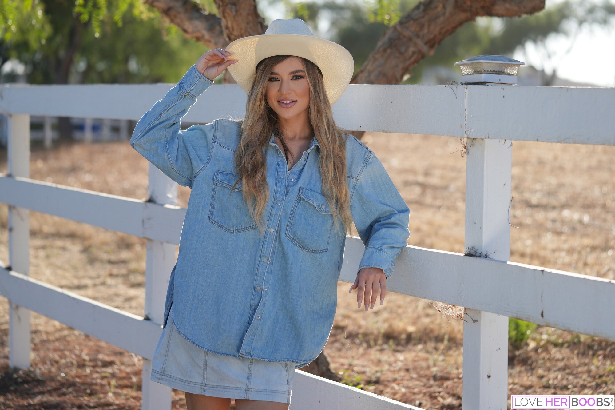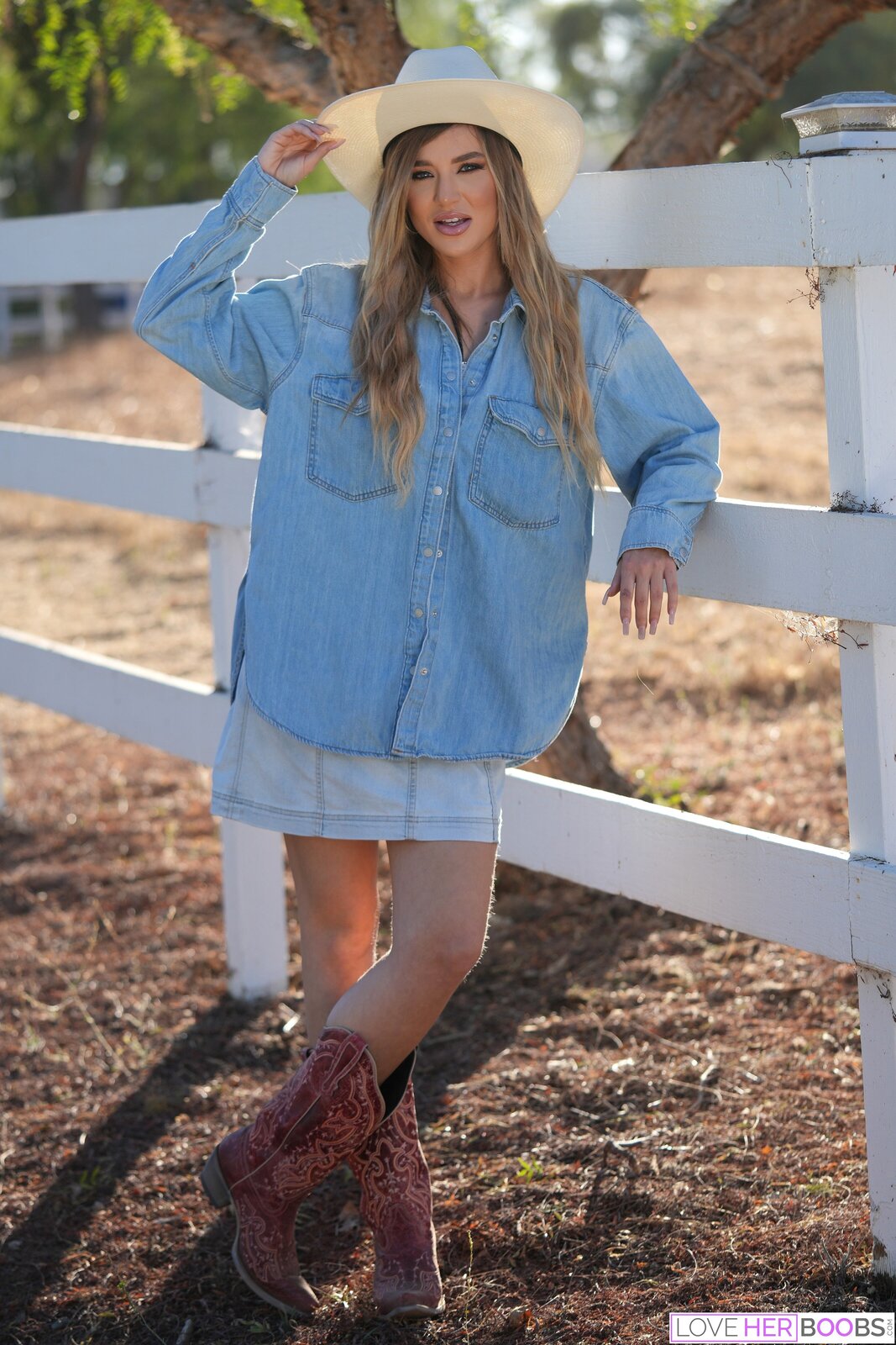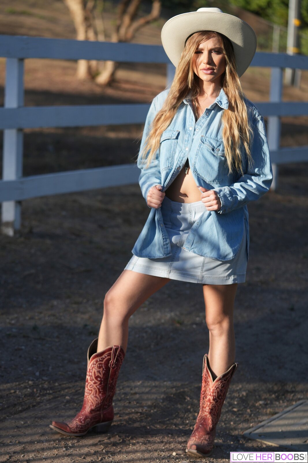 The sun is setting, but Blake Blossom is just getting started with her nasty plans of worshipping a cock. After getting soaked under the sun, working on the ranch, the blonde farmstead diva hankers to take a load off. What better way to chill than striking the chance to stuff Blake's needy pussy, worship a kneadable rack, and have sex? That is, definitely, the ultimate goal of the top-stacked goddess. She starts to cool down a little, removing the long-sleeved denim top to fully reveal the tassel-embellished top and a bolo tie that hangs perfectly between her globes. \r\n\r\nBlake playfully jiggles the plump set of big boobs, like a true cowgirl riding a horse. However, the rowdy goddess is looking for a different kind of stud—a boob-loving one with a big dick to sit on. She sweetened the view by discarding the white top, enjoying the fresh breeze gracing her droopy bosoms. Without a doubt, any man would feel parched, wanting to suck those titties until both are content. It would be a perfect chance for Blake to feed her lust, as she is also looking forward to feeling a path of spit drawing across the erect nipples and all over the under and side boobs. \r\n\r\nThe cold afternoon wind tickles the tips of Blake’s chest, making them the perfect firmness to be sucked and lapped by her partner later. In the meantime, she can only imagine a set of strong grips grabbing her melons or pushing them together while sandwiching a cock in between. While the lewd idea makes her mouth water, the big-breasted sexpot proceeds to spit all over her front buns while voicing out her dirty thoughts with tantalizing words. Definitely, Blake’s patience to contain her lust is stretched thin. The golden-haired slut can only wait for so long, aching for both her huge juggs and pussy to be stimulated by a big dick.