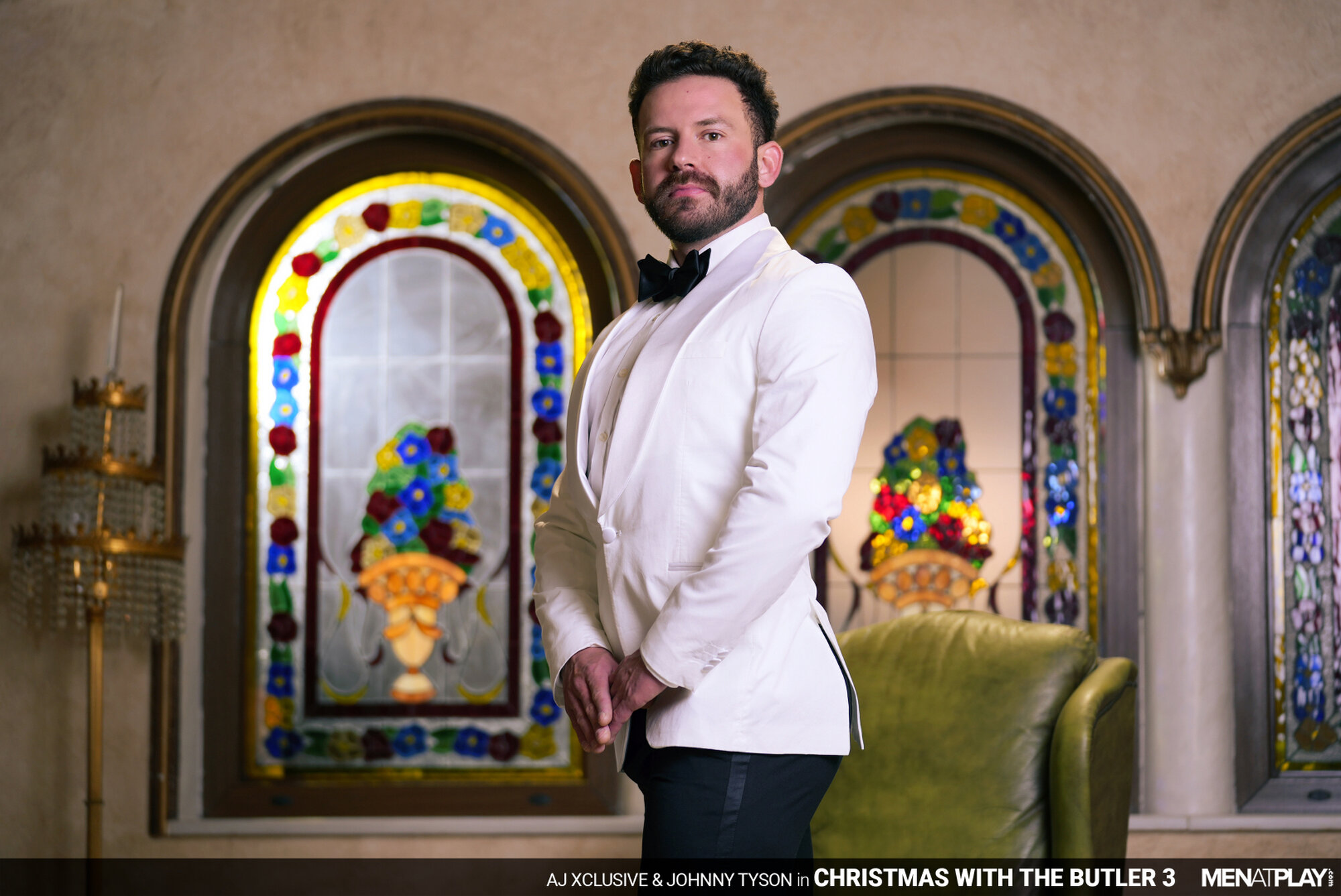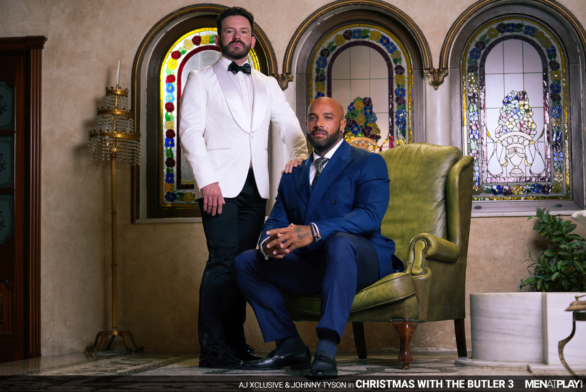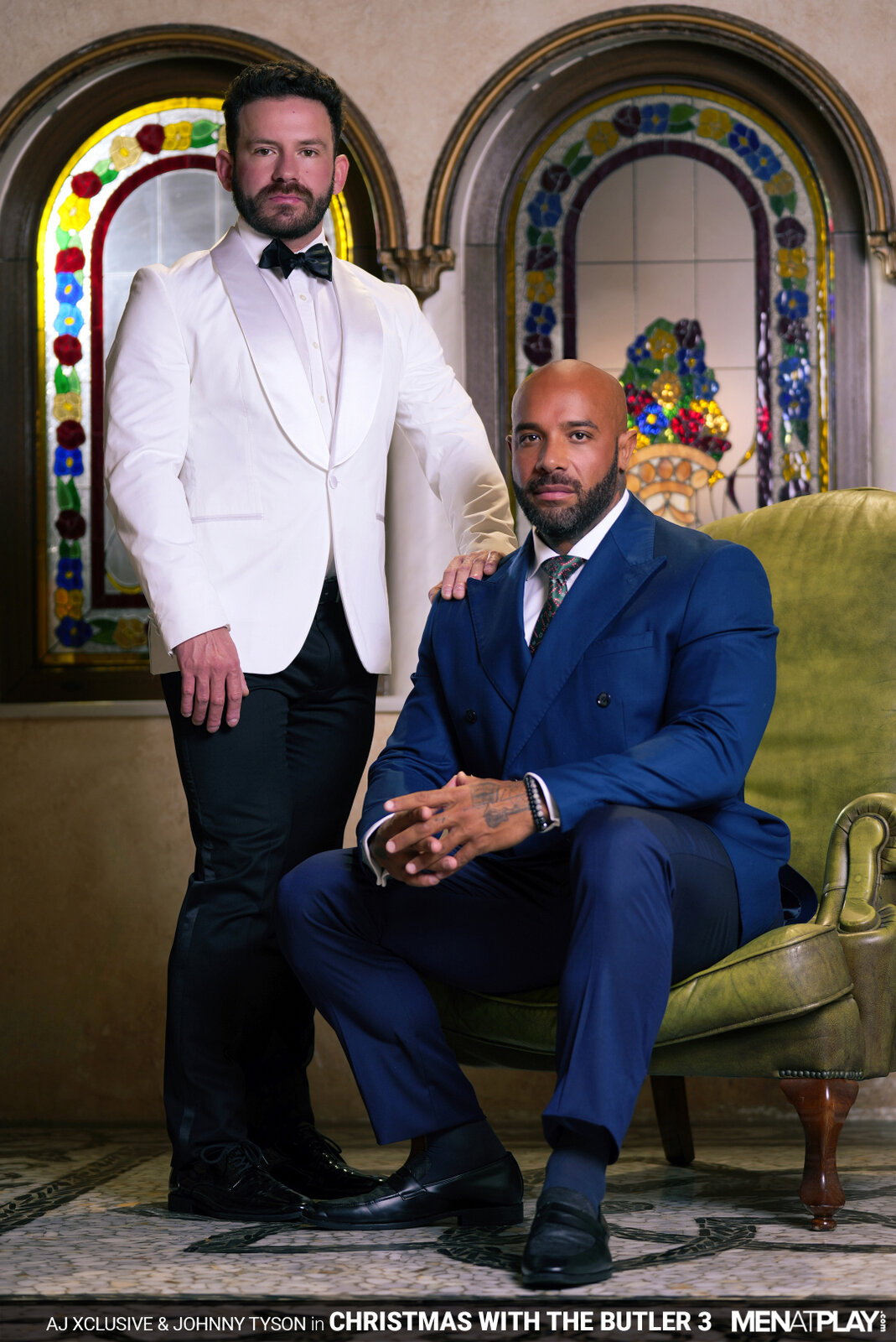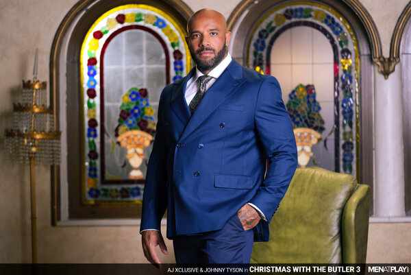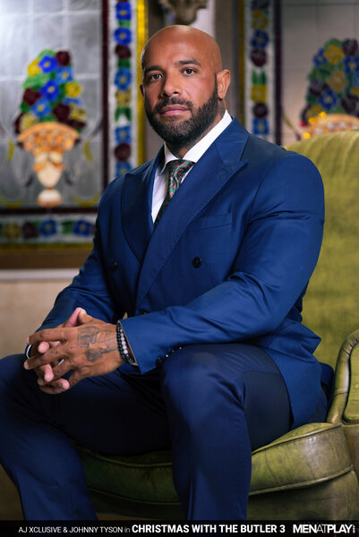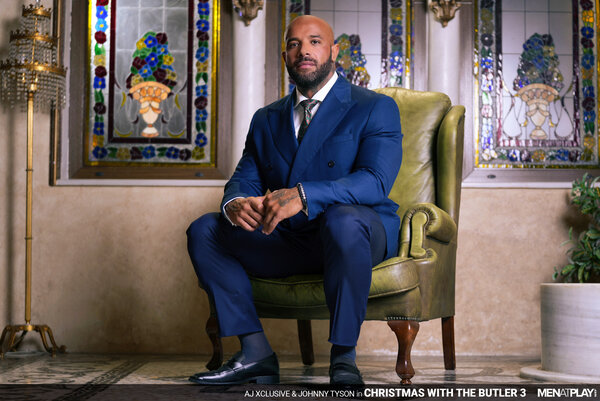 AJ Xclusive, preparing for his foundation's holiday benefit dinner, is rehearsing his speech but feels nervous and frustrated. His butler, Johnny Tyson, notices AJ's discomfort and kindly helps adjust his necktie to make him more comfortable. The tuxed up butler loosens the tie slightly and begins to massage AJ's muscular chest… body… ever so mischievously. Johnny encourages AJ to relax and try rereading his speech, and when he does, the butler begins to massage AJ's crotch. AJ's voice changes to a trembling whisper and drops the papers in sensual excitement. Butler Johnny knows what he needs to do to calm his boss's nerves and has pulled out AJ's uncut cock through the pant fly and begun blowing his boss while on his knees. Distracted from practicing his speech with a hard cock, AJ is ready to play and bends his butler over his leather chair, lowering his pants. The boss rims and fingers the smooth hole before stuffing his holiday tie inside the butler's booty hole. Nothing gets your mind off a stressful situation like fucking! And, AJ rams his raw cock deep inside his Butler. Remembering the old saying, "For it is in giving that we receive", AJ then gets on his knees while the Butler enjoys a blowjob while sitting on the chair. Having enjoyed the blowjob, Johnny returns to his subservient role and blows his boss again before sitting on top of the hard cock in the reverse cowboy position. The butler rides AJ's cock, enjoying the opportunity to please his boss, and jerks his own cock until he blows his load, with the boss still inside him. When AJ is close to cumming, Johnny hops off and licks the last drops of cum from his boss. Thanks to the butler's encouragement and assistance, AJ is ready to inspire his guests and celebrate the spirit of the season. Happy Holidays to All.
