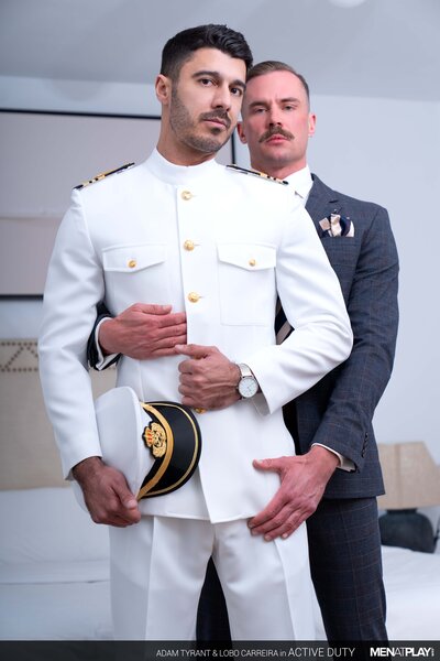 Naval Officer Lobo Carreira has been on shore leave, enjoying Memorial Day Weekend with friends. But it is now Tuesday, and he needs to return to the deck today. While he packs his bag, his friend Adam Tyrant comes in and thanks him for spending his break with him. But, Adam also asks Lobo mischievously why we love a Man in Uniform and offers to see him off properly. A-ten-hut – civilian Adam Tyrant is ready to service Naval Officer Lobo Carreira! When studs Adam Tyrant and Lobo Carreira begin kissing each other, Adam's cock immediately hardens. He pulls it out through the fly of his pants, and Lobo deep throats his friends uncut cock, before having his thick Portuguese meat serviced. Next, the officer stands above his friend who's lying in bed, and sits on his face so that he can eat his hole. Unable to control himself anymore, Lobo gets on all fours in bed and has the suited Adam fuck him raw until they both cum. Fair winds and following seas!