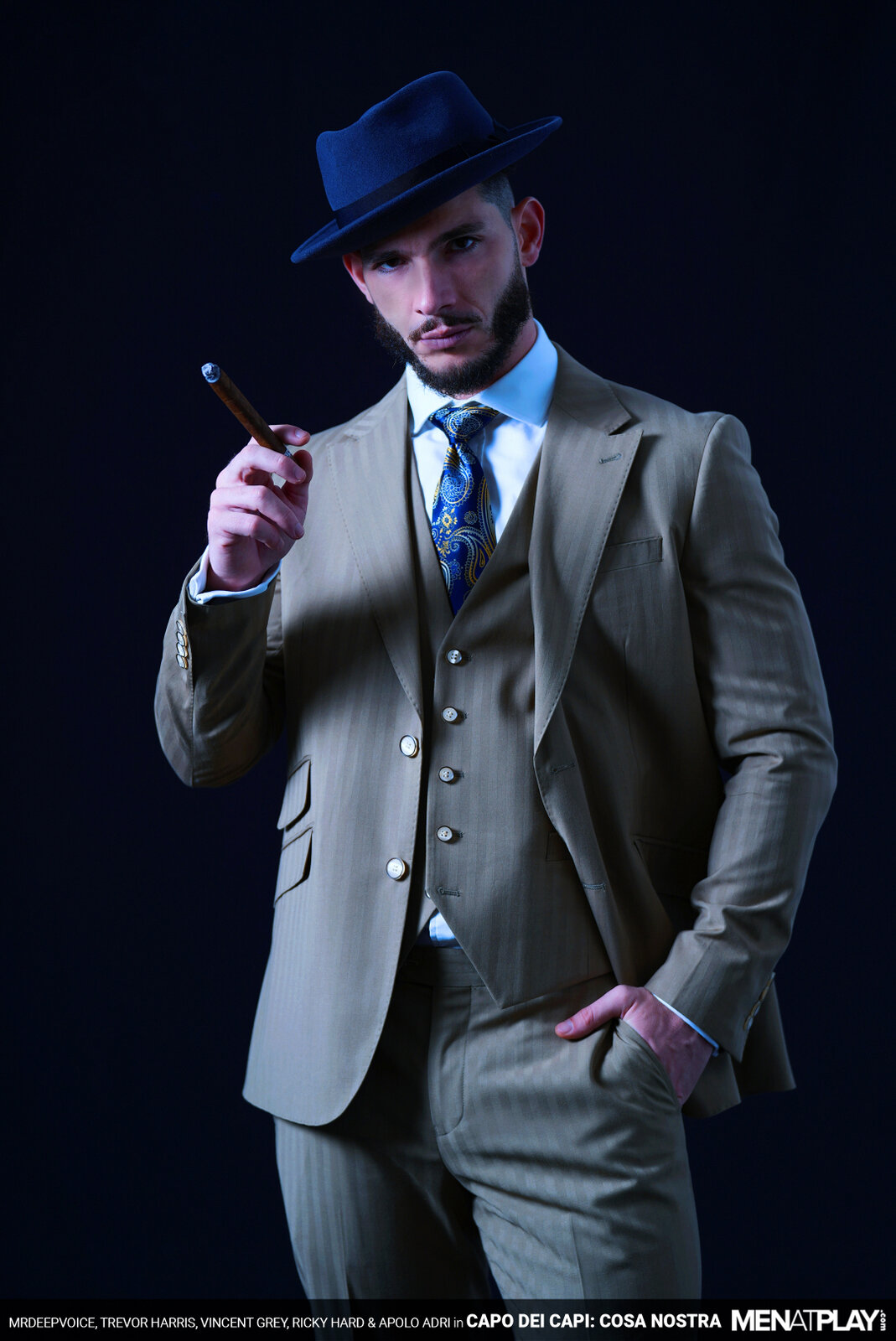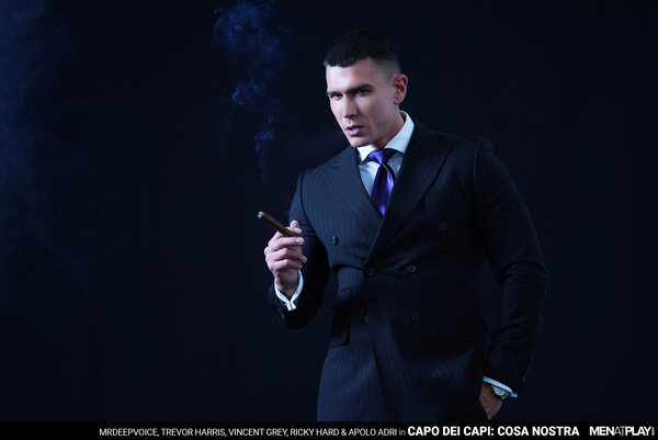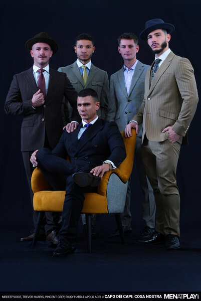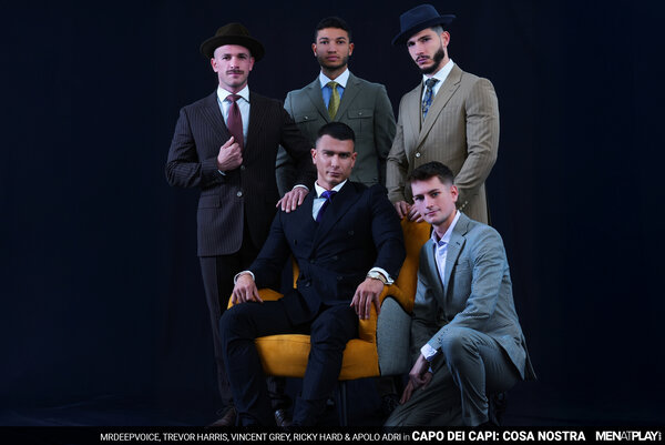 At his magnificent estate, Capo Dei Capi MrDeepVoice is hosting a dinner party for some of his familia. They are celebrating and welcoming a new friend, Ryder "Babyface" Owens, who has become a made man, and also the release of Underboss Apolo "Three Legged" Adri, after being pinched. But when cugines Vincent "The Voice" Grey and Trevor "Skinny" Harris arrive late, MrDeepVoice is not pleased. He calls the two soldiers over to him and covers them in food. "Don't be late again!" Next, MrDeepVoice turns his attention back to finding pleasures where he can and calls it time for a Cosa Nostra! To start the special affair, MrDeepVoice signals Vincent and Trevor to him and invites them to say hello to his little friend. After sucking and gagging on the Boss's cock, Trevor is heard telling him that it's actually not so little. While the two cugene suck the Capo Dei Capi, Capo Ricky "The Azor" Hard sucks on Underboss Apolo's monster cock, who then sucks Ricky and MrDeepVoice rims Trevor. The fuck fest begins with MrDeepVoice fucking Trevor and Vincent fucking Ricky. MrDeepVoice turns his attention to Apolo's huge cock - sucking it at first and then bending over the table to take it deep in his hole like a real man. Meanwhile, a Familia fuck train has formed with Trevor getting fucked by Ricky, who's getting rammed by the big dicked Vincent. To thank Ricky for making Ryder a made man, MrDeepVoice fucks him next while on his back, and Trevor rides Vincent and Apolo in the reverse cowboy position. When members of La Familia have had their fill of pleasures, they stand in a semi-circle and unload their man juice all over the dining table. Loyalty makes you family. Keep your mouths shut and your asses open! Meeting adjourned. What Happens in La Familia Stays in La Familia!