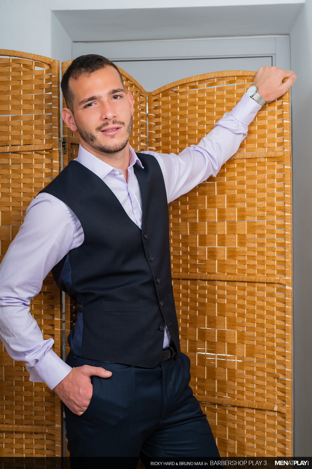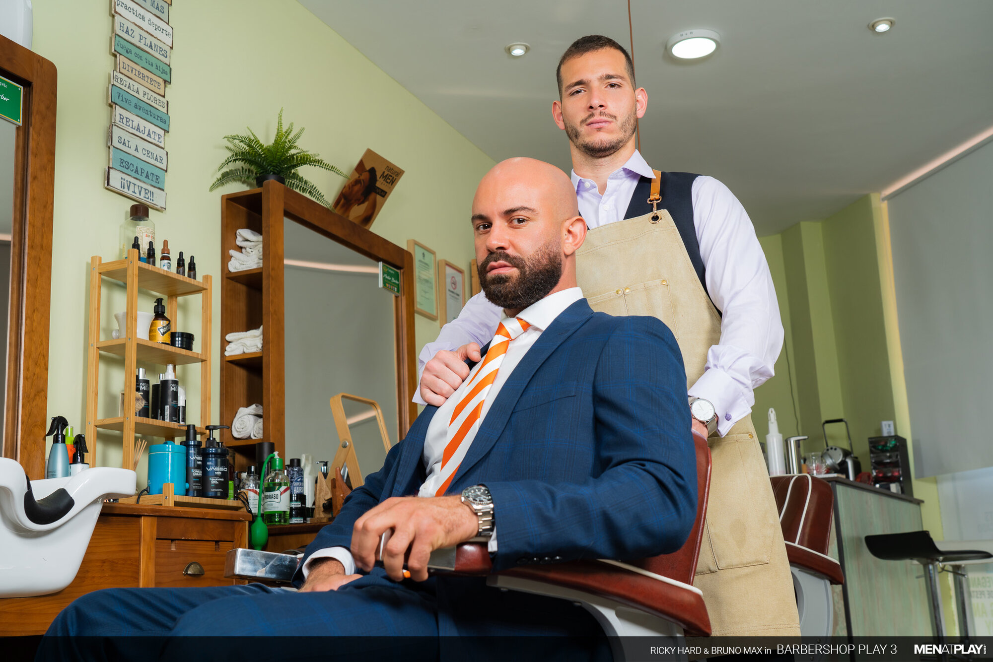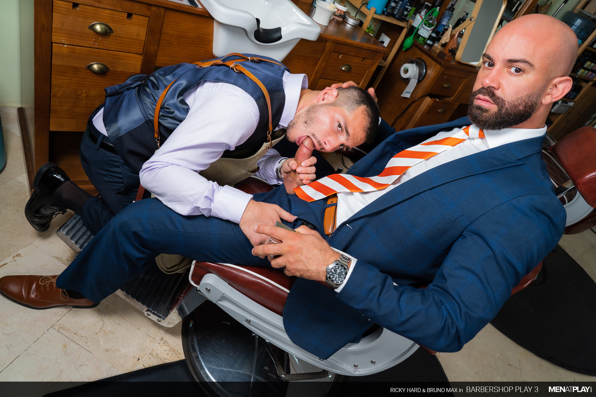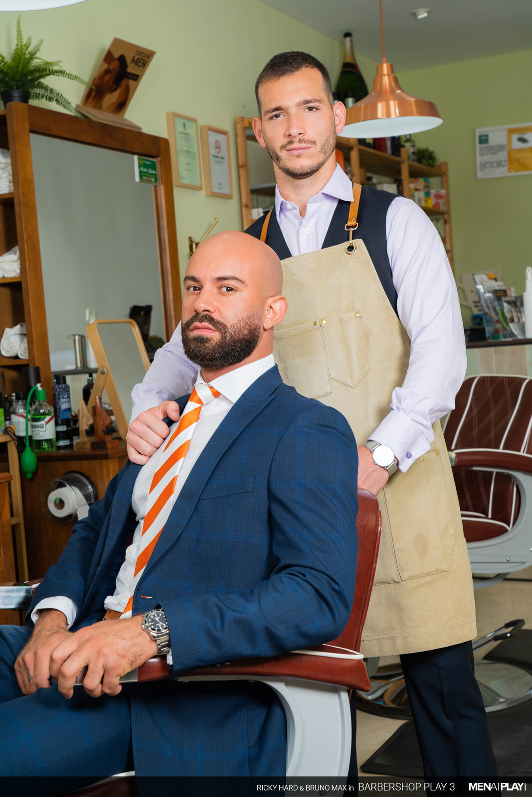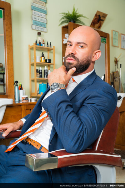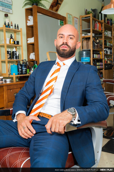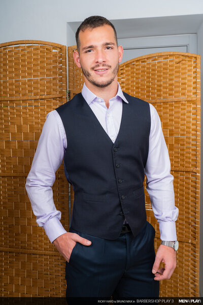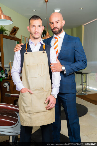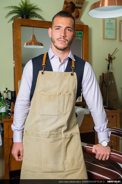 Ricky Hard, in his MENatPLAY debut, is a barber waiting for one of his favorite customers, businessman Bruno Max. Every time Bruno has gone for his weekly grooming, he has hinted that he wants more than just a beard trim. Today will be his lucky day because Ricky will not resist Bruno's indirect advances anymore. When Bruno enters the barbershop, Ricky escorts his client to the chair and starts to trim his goatee. Meanwhile, Bruno is playing with something thick and hard under his pants. But, it won't be the only thing Bruno will be playing with this afternoon. He'll finally get to play with his hot young barber, Ricky too!