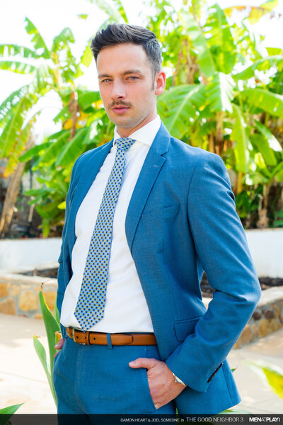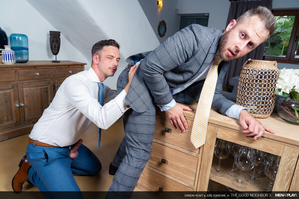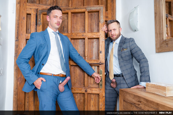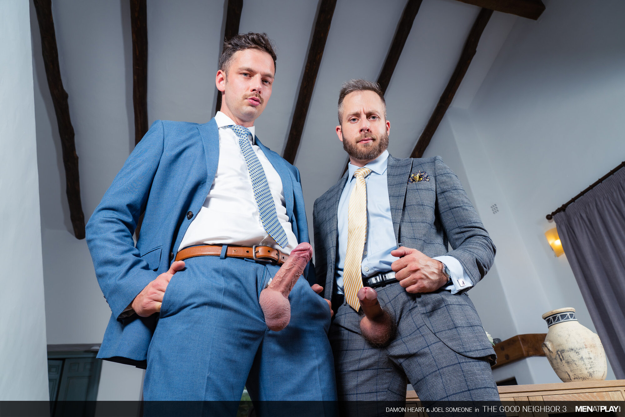 Joel Someone has just moved into a new neighborhood and wants to throw a welcome party for his friends. He decides to visit some neighbors to warn them that it might get a little loud. Damon Heart, who lives nearby, gets interested in Joel's natural sex appeal and invites him to come inside his house to give him a scoop on the neighborhood. The two studs instantly click and Damon invites himself to Joel’s party - "when you can’t beat them, join them", he says. Truthfully, Damon has his eyes set on his new neighbor and wants to play with his new, suited neighbor Joel right away.
