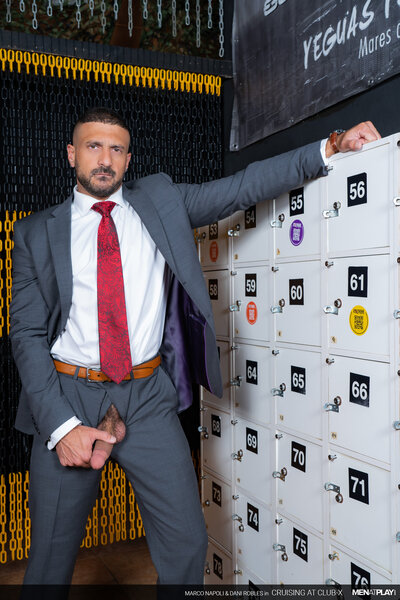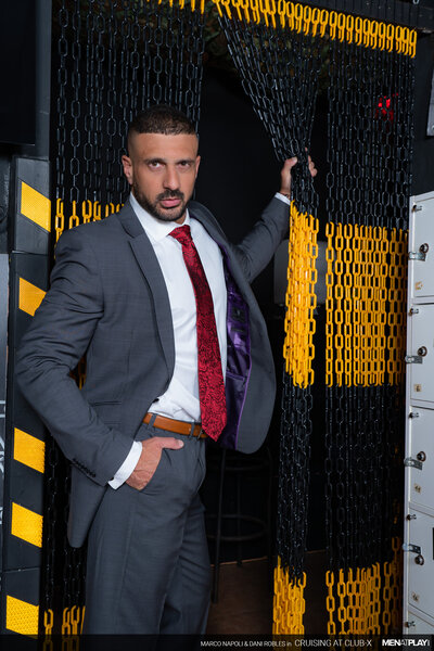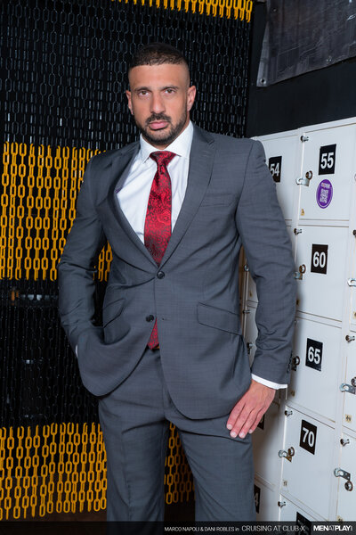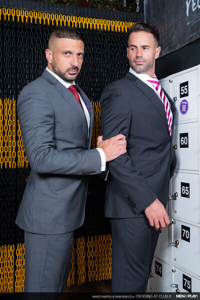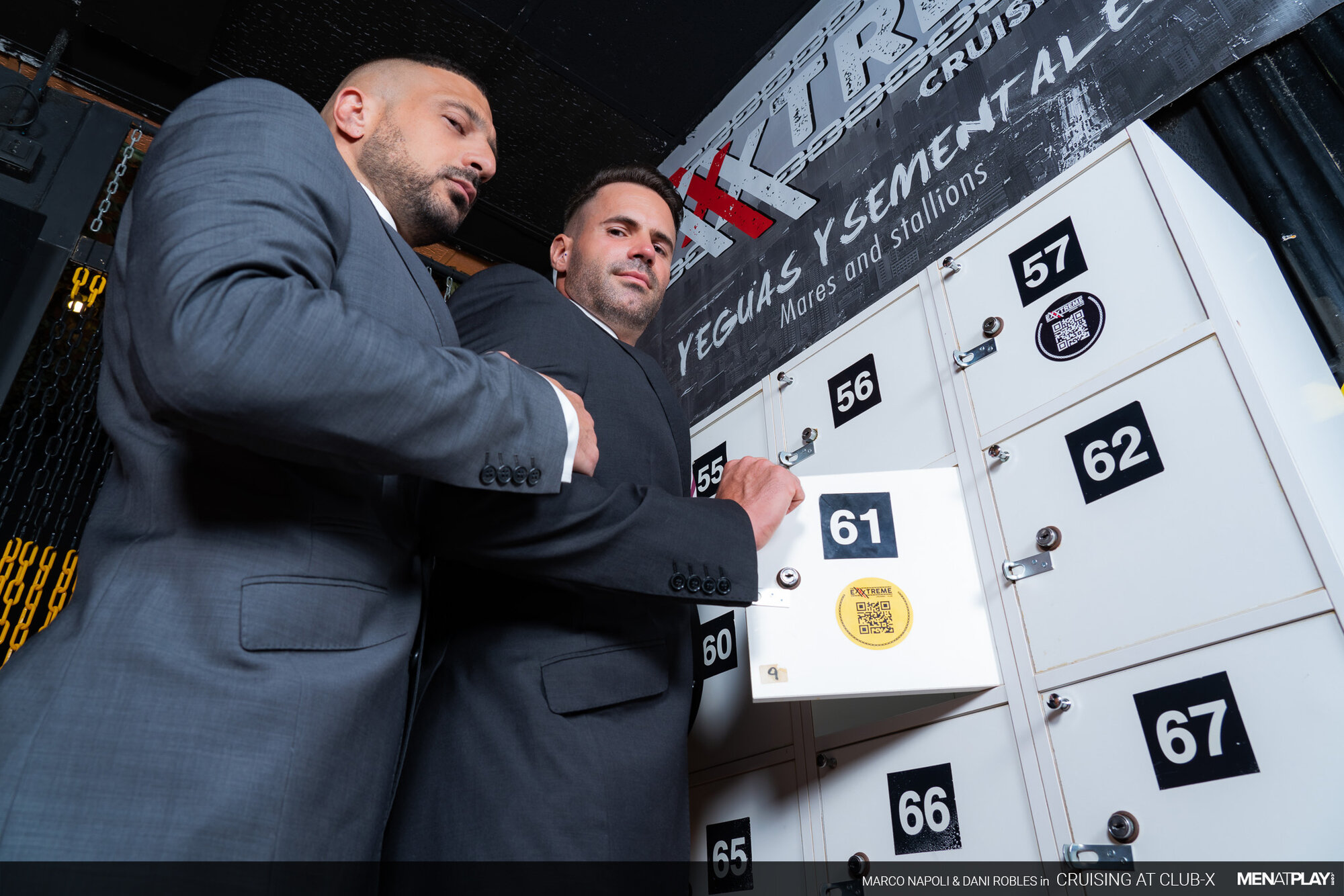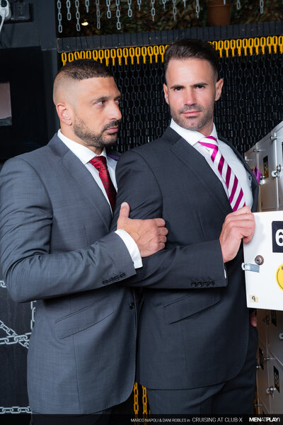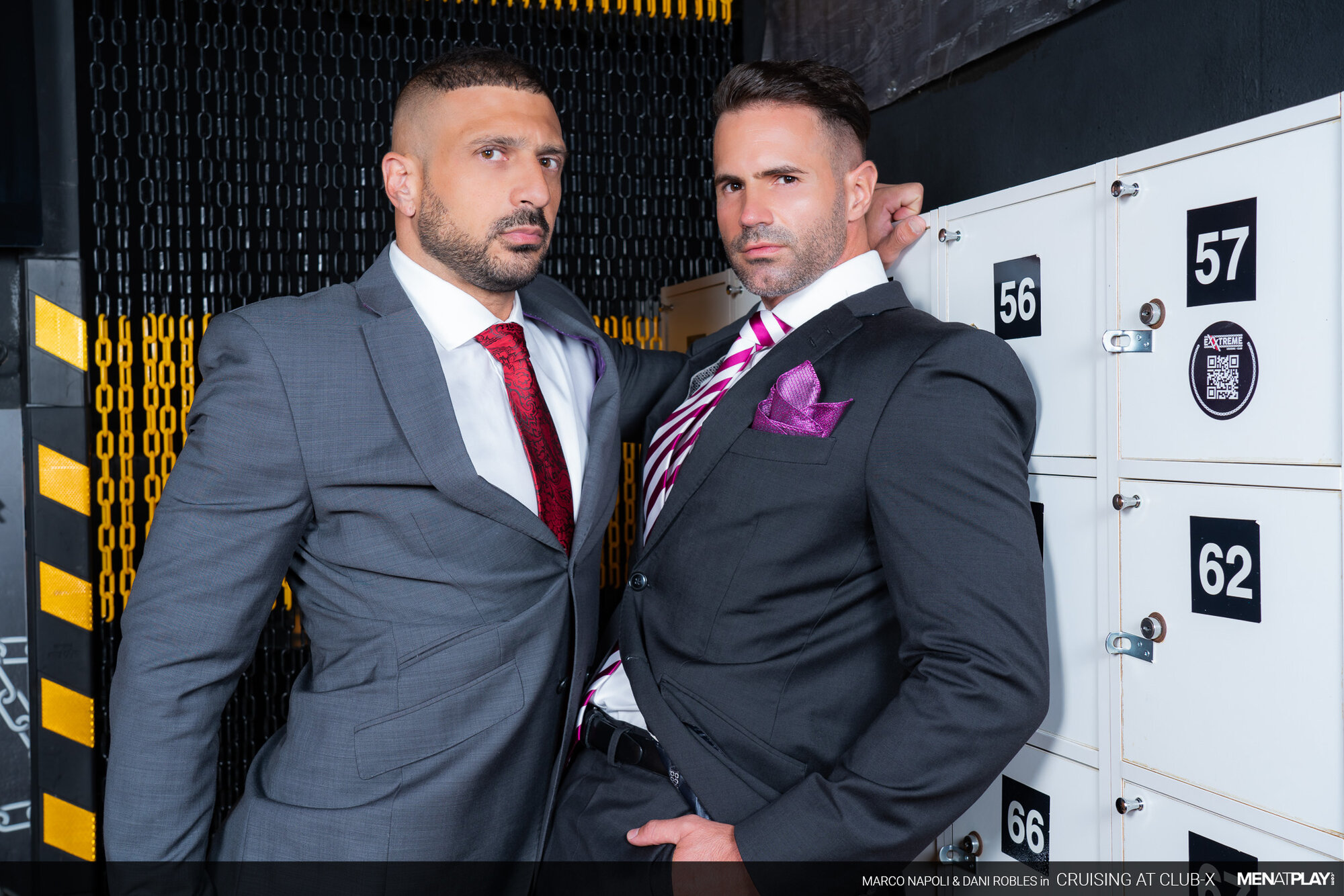 A cruising club, suits, leather harnesses, a sling, and two ardent men ready to have some fun between bars. Dani Robles and Marco Napoli play after ripping each other's clothes in this epic production. Marco walks through the dark halls of Club-X and starts touching himself inside a cell when Dani teases him with his look, only to have one of the best flip-flop fuck hookups of their lives in the shadows around every corner.
