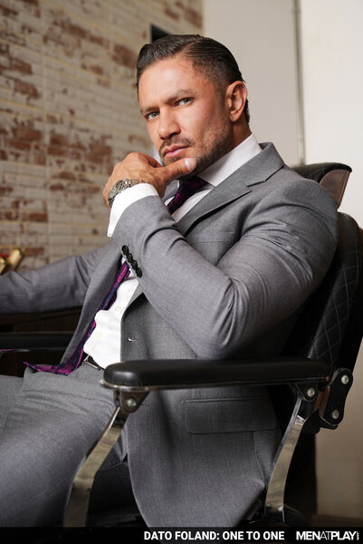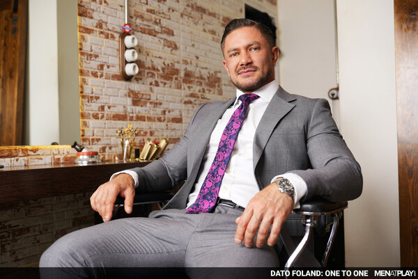 Since his Menatplay debut in 2013's wet suit sex movie "Poolside," Dato Foland has become one of our favorite (and sexiest) muscle daddies! His stunningly ripped, buff body, striking green eyes, dark skin, beautiful 8" uncut cock, stunning ass, and deep voice with that strong Russian accent make him the total package. After a 4-year hiatus, Dato returns to the syndicate in a personal, private, and intimate one-to-one solo play performance. Wearing a fitted gray suit and white dress shirt, you can already see Dato's bulge through his pants - eagerly waiting to be serviced. Dato runs his hands over his massive pecs, then shows his gorgeous cock and beautiful hairy hole, as he strips to his gold toe socks. Sitting on a barber chair, Mr. Foland decides to release some of the built-up tension the old-fashioned way and rubs his hard cock until he can't hold it any longer and shoots his hot load. Welcome Back, Dato!