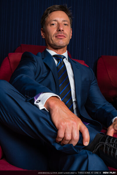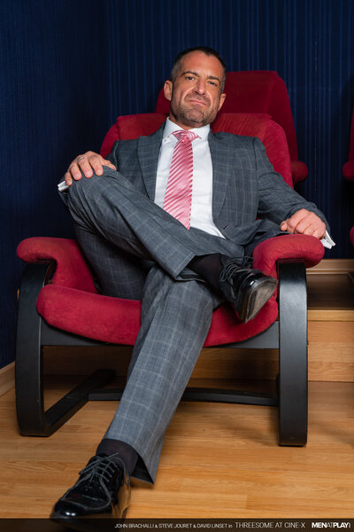 The legendary Cine-X is open and ready for the debauchery that usually ensues indoors! For the evening's showing, the young usher John Brachalli leads David Linset to his assigned seat; exchanging a look or two with him in doing so. Soon, the usher comes in again - this time with Steve Jouret, a regular at the cinema who has made plans to be naughty with David. Once the film starts, the two studs begin to enjoy themselves and play together. The new usher John can't control his urges and pulls out and starts jerking his cock, enjoying the view from a distance. The cinema play session gets even hotter when David invites the usher to join in on the fun. And what a threesome play session it turns out to be -- each stud flip-flop fucking each other, ending with the young usher getting showered with cum.
