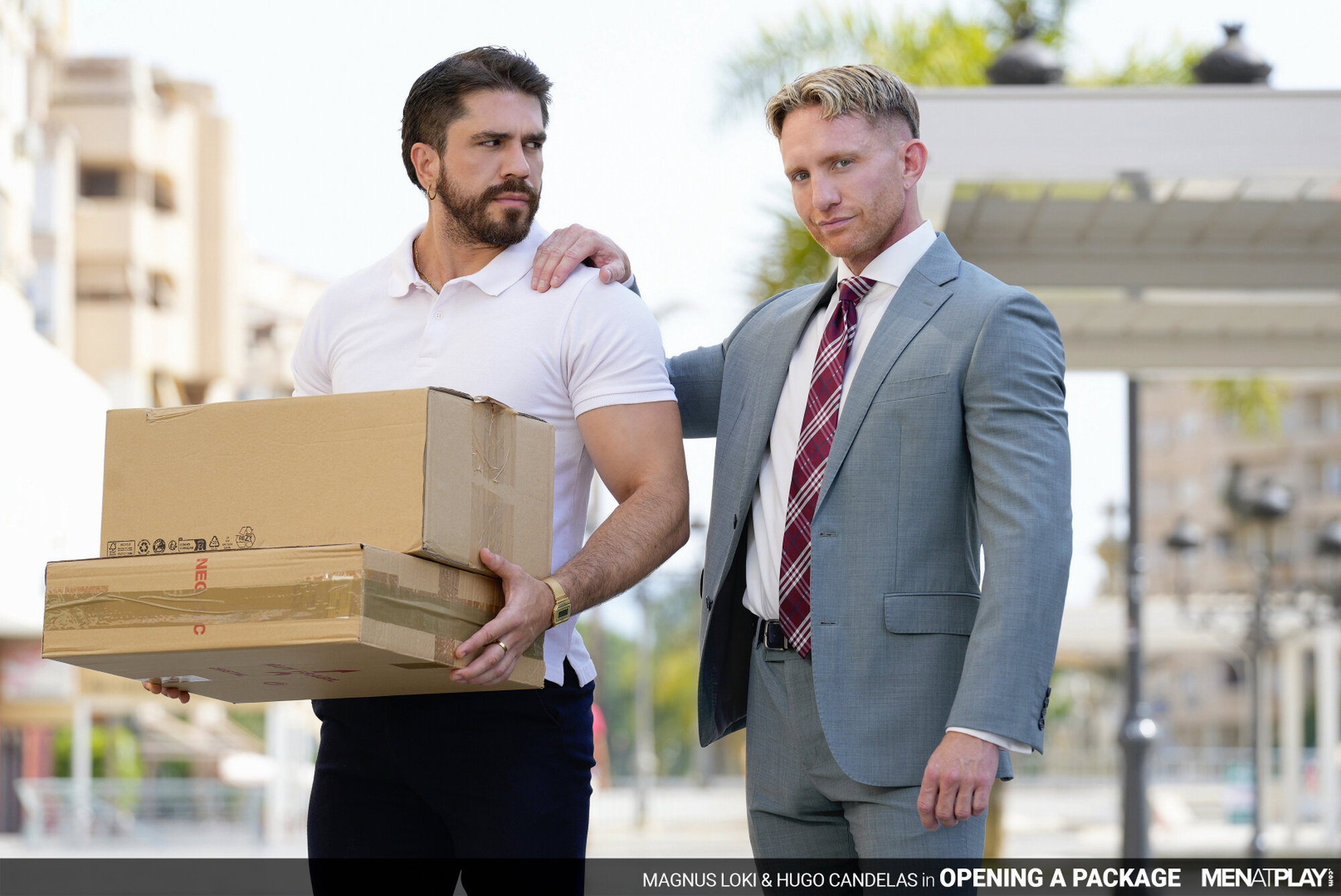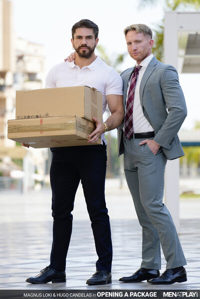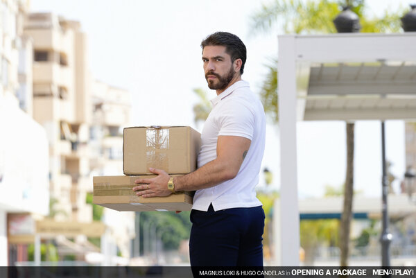Millions of packages are delivered daily around the world. Today, business owner Magnus Loki notices the new, hot deliveryman carrying several boxes and tells him to drop them off in the storage room. He decides to wait for him outside when he's done with the delivery and try his luck! After dropping off the packages, Hugo Candelas (the deliveryman) notices one box with a unique label: "For Men Who Play Hard." Curious… and despite his resignations, Hugo opens the box and finds a Fleshjack inside. Looking around to make sure that no one is coming, he decides to get his cock out and starts wanking it first, and then shoves his cock in the sex toy's hole. From out of nowhere, Magnus appears quietly and calmly tells the deliveryman that the box wasn't addressed to him. Surprised to have been caught, Hugo tries to hide his actions and tells Magnus that he thought that whatever was inside was broken. The sex toy, however, is clearly not broken, and if he's going to test company property... he might as well do it right. Being the naughty and horny business owner that he is, Magnus offers his holes for Hugo to try instead. Magnus sucks the deliveryman's uncut, thick cock and then drops his trousers for a juicy rimming and hard, deep, raw fucking. Lucky for us, not everything you open comes with instructions.