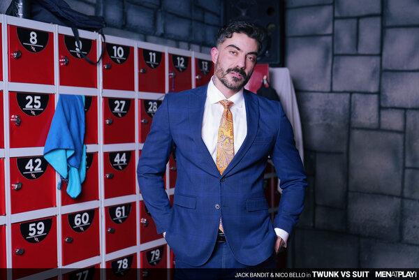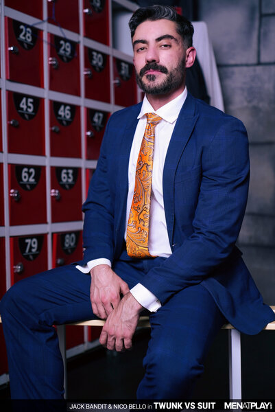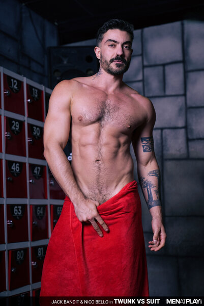 Bank executive Nico Bello is done with his afternoon workout at the local gym and jumps in the shower to wash away his man sweat. He scrubs his wet bubble butt and soft, uncut cock before drying up and putting on a jock strap, gold-toe socks, and trousers. As Nico suits up, the sexy twunk gym trainer, Jack Bandit, walks into the locker room and can't resist looking over to him. The horny trainer assumes a dominant, powerful cruising persona, rubbing his hardening cock while he makes eye contact. With a cocky swagger, Nico agrees to be used by Jack for a bit of fun before he heads back to work. After some furtive cruising, Jack is down on his knees, sucking and deep-throating Nico's beautiful whole cock, before being serviced too. The horny twunk pulls down Nico's trousers, revealing the jockstrap, and sticks his tongue in the hairy hole for a good rimming. Then he pumps Nico over and over with his raw cock as the executive groans with pleasure and cums all over the twunk's chest. The young jock jerks his cock next, until he releases the biggest load we've seen in a while. Another reason to head to the gym for a hard workout (or pounding)!
