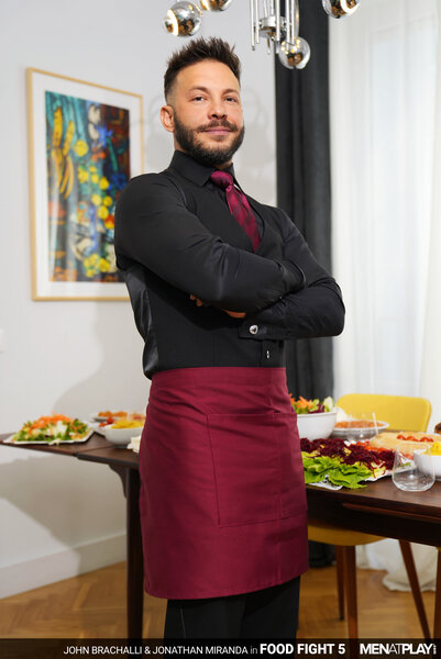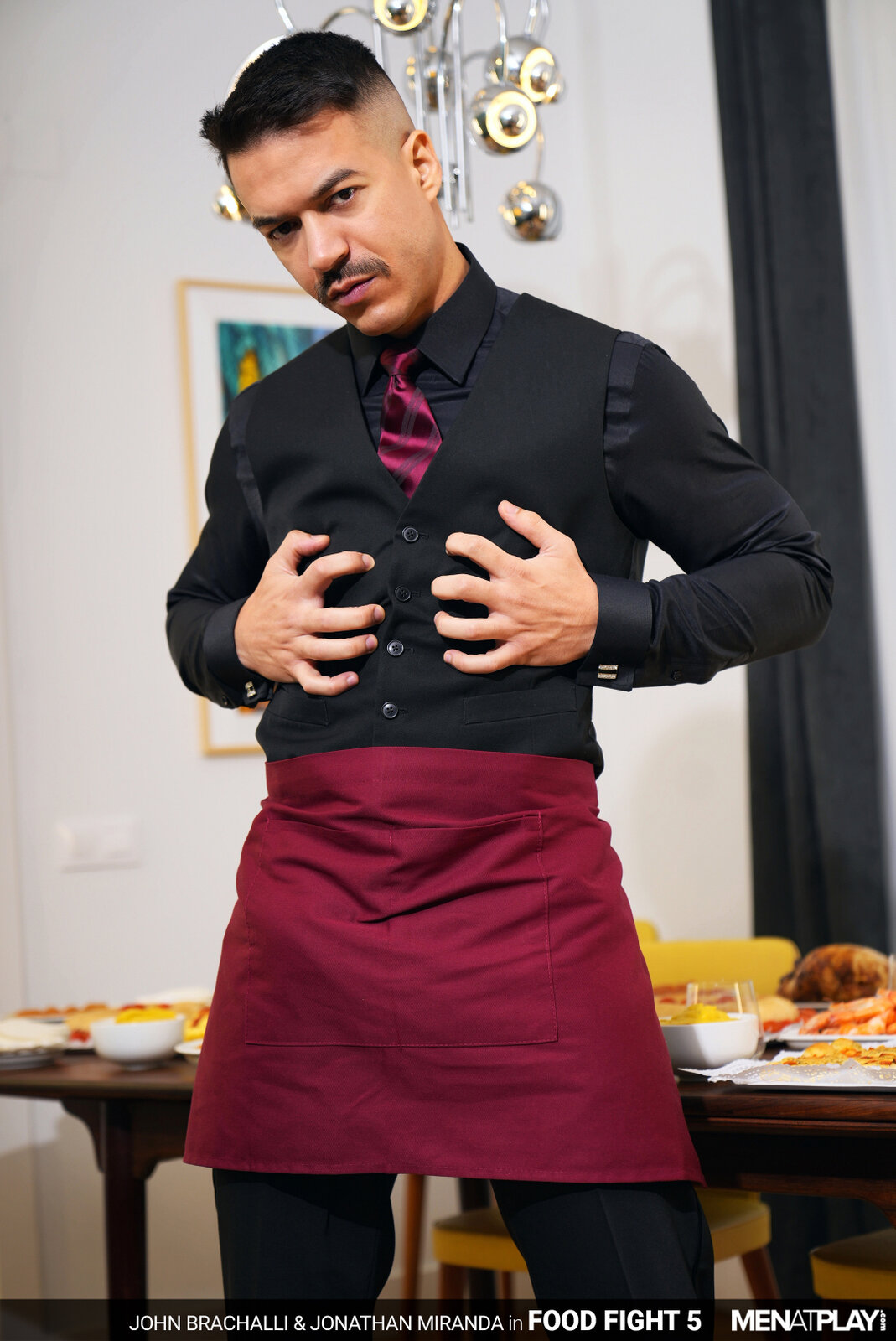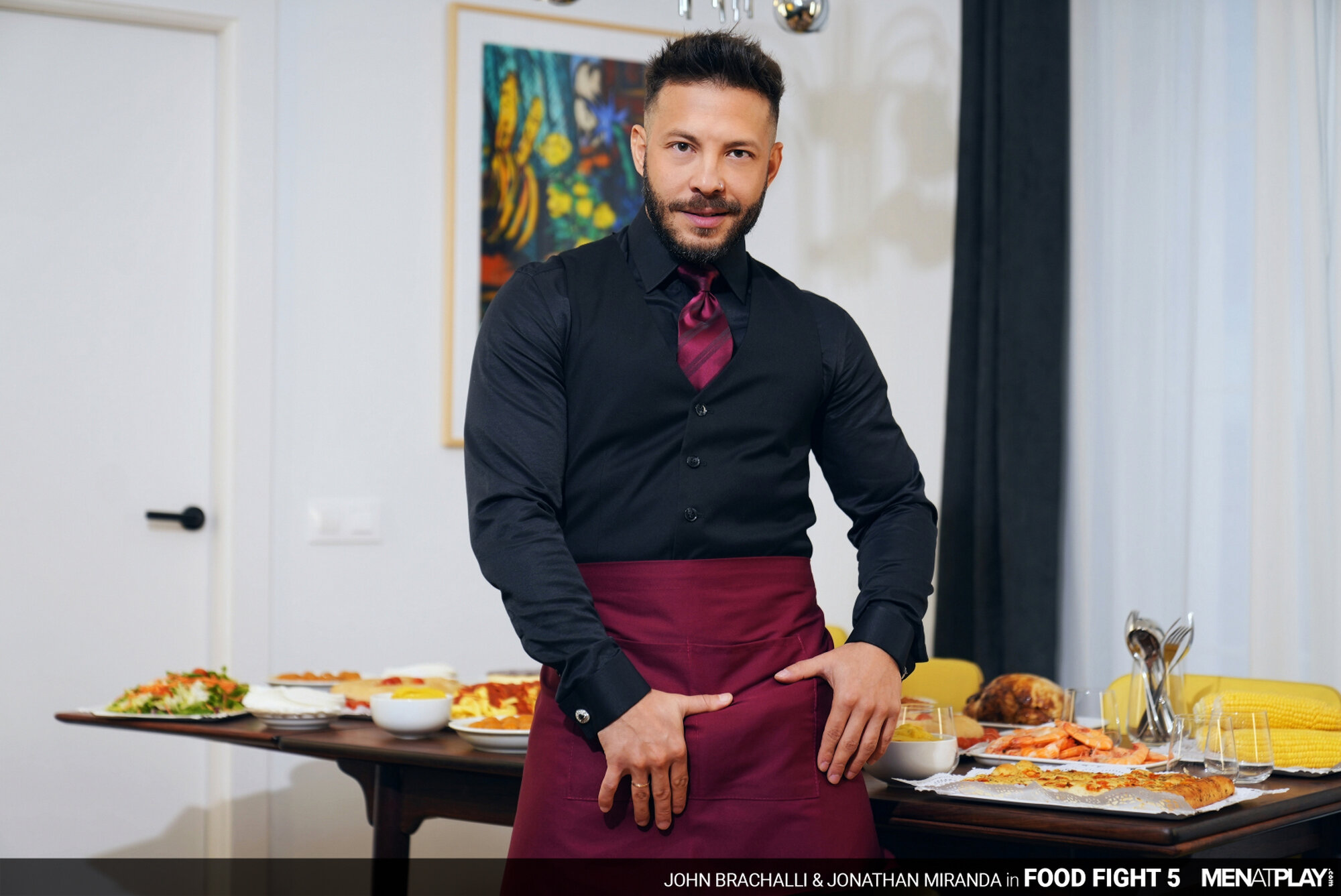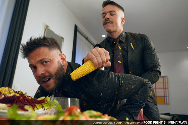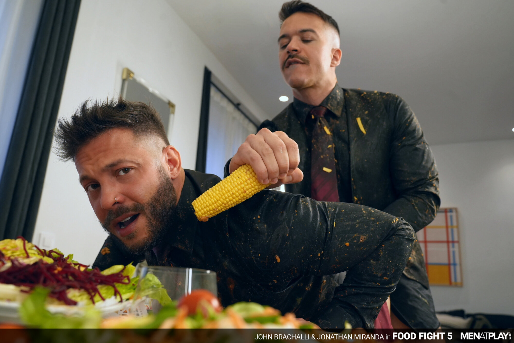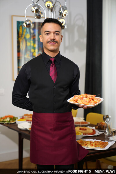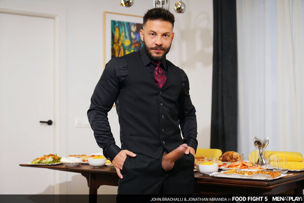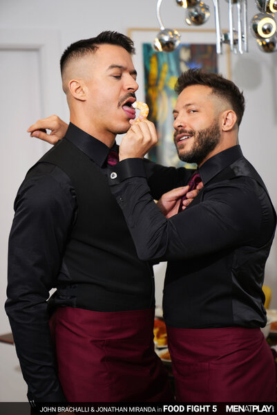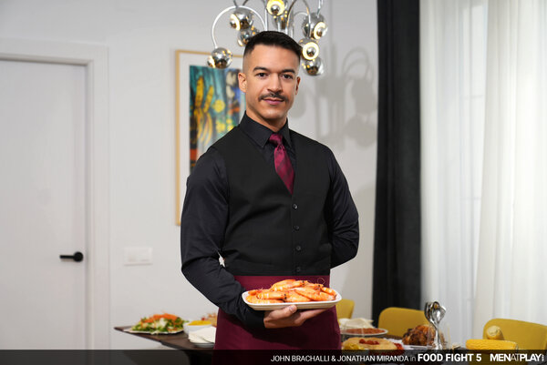 Are you ready for Menatplay's messiest Thanksgiving Food Fight, ever?! The Smith family is hosting a holiday dinner with friends and relatives, and to keep things smooth, they've hired a catering team to handle the meal. John Brachalli and Jonathan Miranda are in charge of setting the table, and John's got a very particular way of doing things. While Jonathan brings over a bowl of Dijon mustard, he accidentally bumps into John, sending mustard flying all over his uniform. Not thrilled about the mess, John snaps and kicks off a full-blown food fight. First, he dumps a salad on Jonathan's head, then follows up with a splash of spaghetti sauce and pasta, turning the dining room into a chaotic, saucy battlefield. Silly banter turns to passion and both studs get the perfect dessert – eating out ass and sucking on food-covered cocks before Jonathan shoves his thick cock inside John's hole and fucks him raw. Maybe next year we'll plan on doing dinner ourselves?! Bon Appetite.