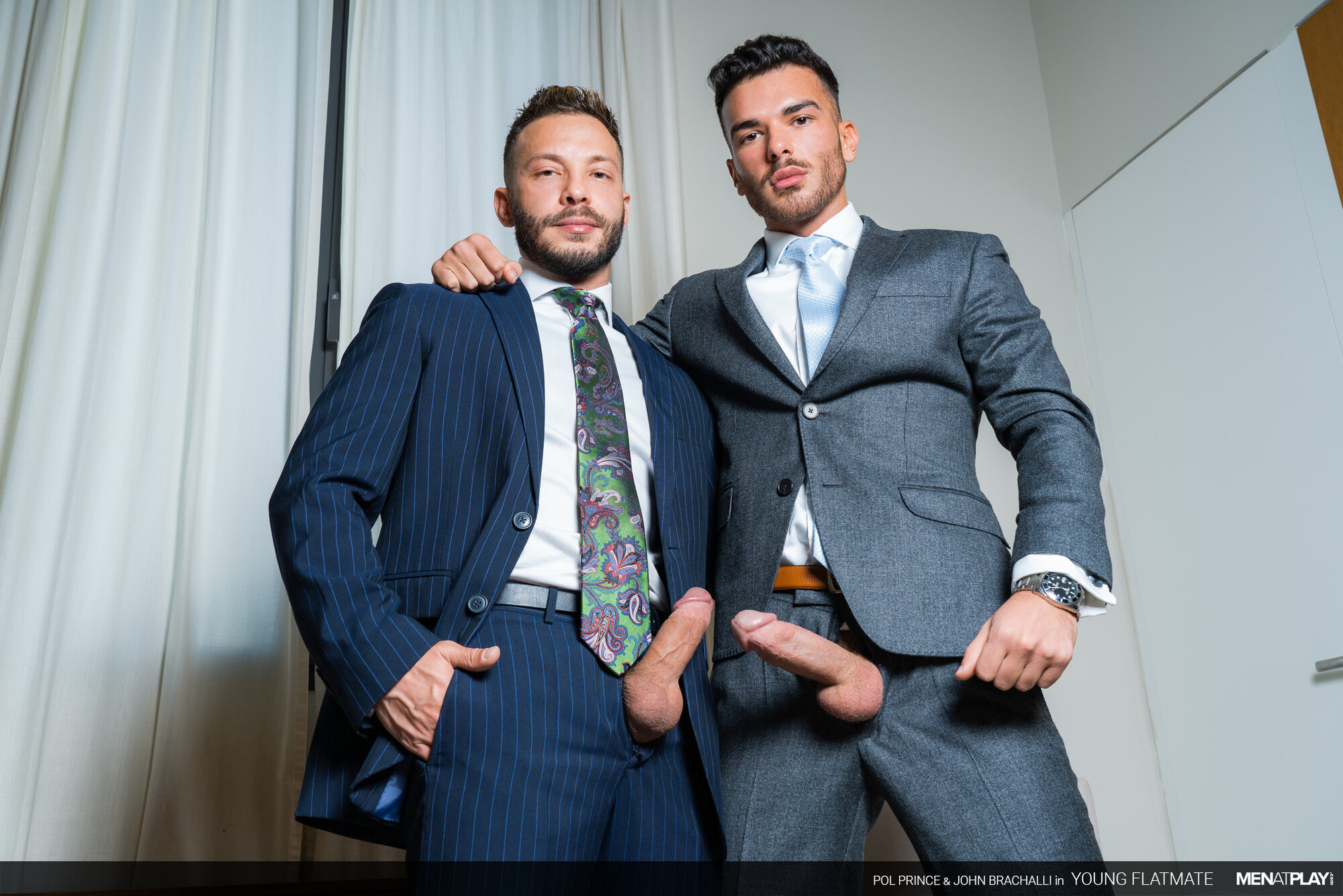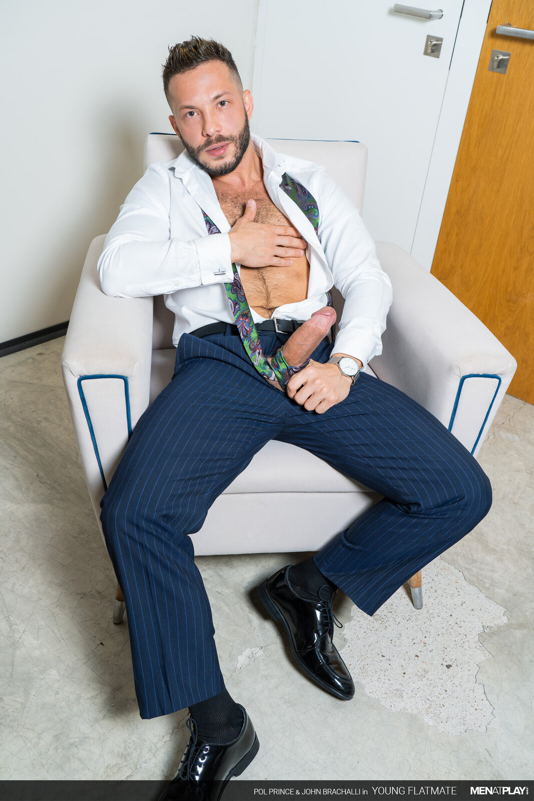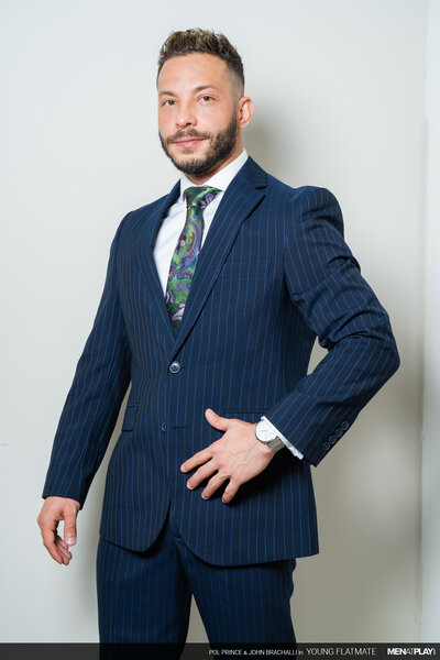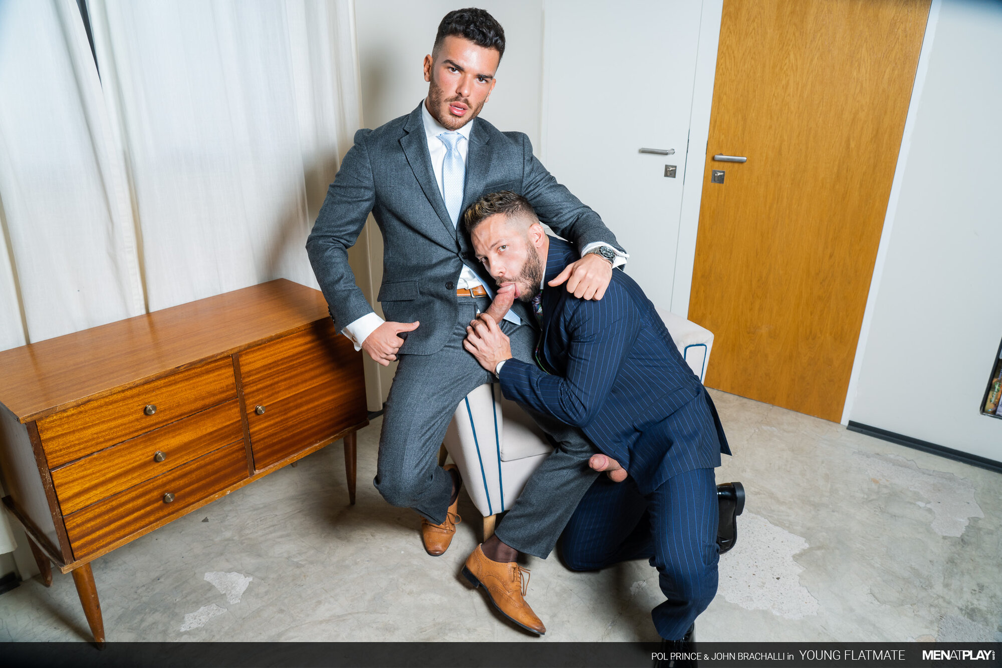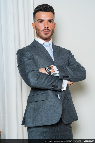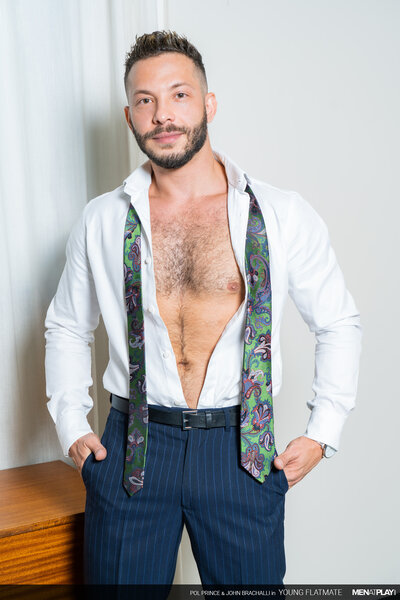 It's an important day for John Brachalli. He has been called back for an interview for a job he really wants. While sipping on his coffee, his flatmate, the young Pol Prince, runs half-naked down the stairs and startles him. John spills some coffee on his white shirt and suit jacket, getting it ruined. Pol is extremely apologetic and goes upstairs to get a new shirt and tie to lend John. John is tired of Pol constantly running around almost naked. In actuality, it is not that John hates it - it's that he has been wanting to play with his young flatmate! Luckily, Pol doesn't see a problem walking around like he does nor hooking up with the sexy John. Flip-Flop Fuck Play Session ahead!