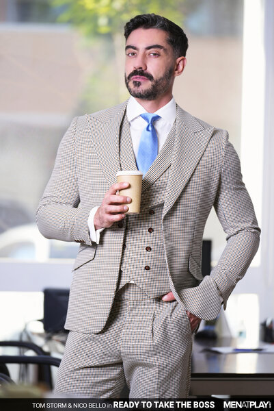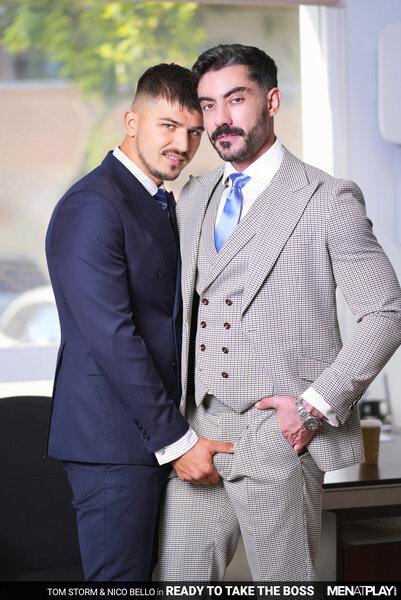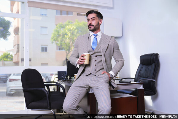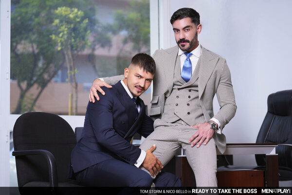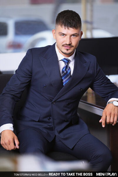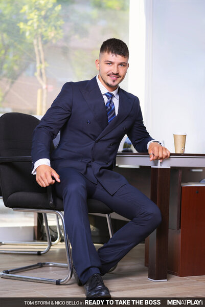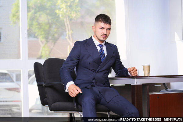 After considerable deliberation, Nico Bello has decided to terminate Tom Storm's employment with the company. Nico calls Tom into his office, where he shares the bad news. The decision has been made, and there is nothing else to discuss. Tom's face turns to surprise as he shares with his boss that he honestly did not see this coming. He asks Nico if he is sure there isn't ANYTHING he can do to change his mind. The sexy green-eyed Tom stands and slowly walks behind Nico's desk and whispers, "And I do mean… anything, Sir!" The boss remains seated and unnerved, finally responding, "It will cost you A LOT. Paperwork has already been filed." Tom has no problem having sex with his boss in exchange for keeping his job… the only question that remains is… "So what will it be..? You fuck me or I fuck you?" The boss and employee kiss passionately, Nico's cock hardening under his trousers until Tom finally releases it and begins sucking the Argentinian's uncut cock. Next, Nico wraps his lips around the Russian cock and then eats and fingers Tom's smooth hole. In a game of power, the Boss should always dominate - and Nico chooses to fuck his young employee raw. But, power doesn't always mean topping… and Nico is soon on his back, taking Tom's young cock up his ass. Excited at fucking his boss, Tom blows his load deep inside Nico, who can feel Tom's warm cock spasm inside him. Fucked and creampied, Nico is finished off with a handjob that milks him dry too. Tom was ready to take on his boss, and now he can get back to work!
