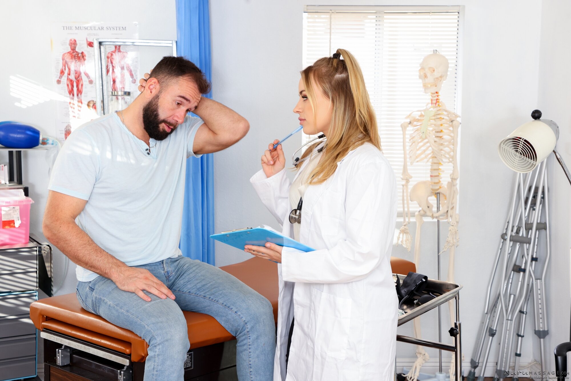 A patient, Will Pounder, complains to his doctor, Anna Claire Clouds, that no matter how hard he tries to be healthy, he always seems to get sick! He makes so many lifestyle changes but somehow it's not enough.Dr. Clouds assures him that it can take time to see noticeable changes BUT that maybe there's something she can do for him in the meantime to give him a boost. That's when she offers him a new treatment that she's seen work very well for her other patients: a NURU massage. It's been so successful, in fact, that she has a permanent NURU setup at her house -- why doesn't he come over and try it out for himself? WIll eagerly agrees, willing to try ANYTHING at this point.A short time later, though he's initially flustered, Will grows more and more relaxed as Dr. Claire performs a blissful NURU massage on him. With all that oil and sensual full-body contact, it's clear that they're both getting aroused. That's when they agree to finish the massage off with some playful, light-hearted sex, giving Will's system an even BIGGER boost!