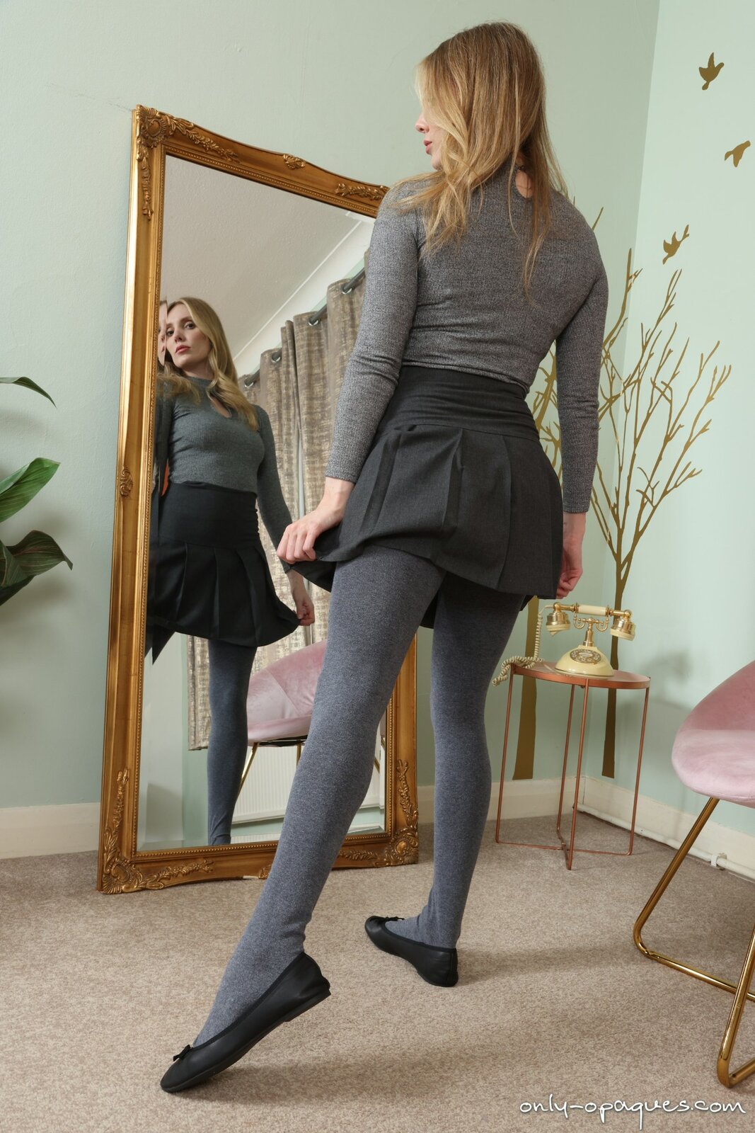 Jessica B from Only Opaques Jessica B from Only Opaques in a short skirt with flats and grey opaque tights 129 images