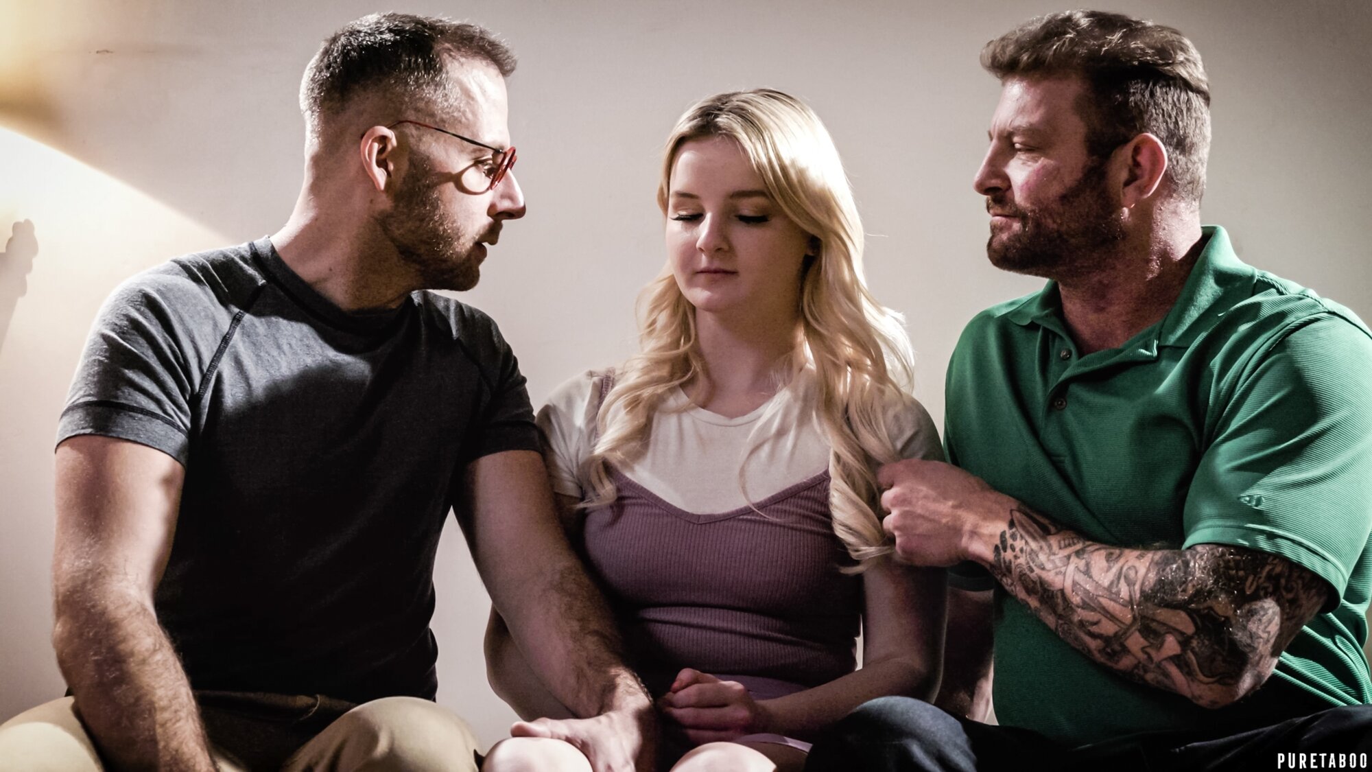 Lindsay (Eliza Eves) rings the doorbell of a home, where she is greeted by Sal Baxter (Colby Jansen), Lindsay's neighbor. They have never met before and Sal, while seemingly normal, is somewhat of a recluse. But this doesn't worry Lindsay as she cheerfully announces that she's there to get pledges for an upcoming charity event. That's when Ed Hoskins (Joel Someone), another man who lives with Sal, comes to the door and introduces himself to Lindsay. He is much more approachable and smooth as he invites Lindsay in to talk about her charity. Lindsay agrees and cheerfully steps inside, though when her back is turned, there are hints that Sal and Ed are hiding something dark...Ed and Sal lead Lindsay deeper into the house towards a dim room. There are more and more hints that Sal and Ed's intentions for Lindsay are less than pure. While Lindsay is a bit nervous, she's also intrigued by the change of atmosphere. There is something electric about the air that's undeniable.As she tries to focus and talk about her charity, Ed and Sal sit on either side of her, keeping close. As they chat, she questions if the men are husbands, but they cryptically insist that they are just two men with similar interests... And right now, they are both interested in HER.While Lindsay is initially surprised and hesitant, there's something about having the attention of not one but TWO older men that awakens something deep inside her...