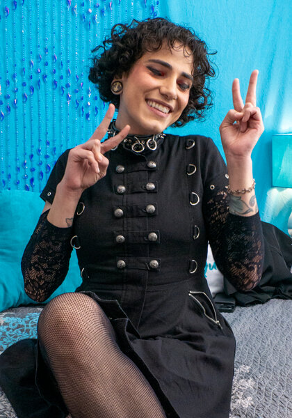 Real couple ElyzaBaby and Skylar Syns came to QueerCrush for their FIRST studio shoot! This kinky t4t duo came to show us how it's done, bringing bondage tape, a collar, paddles, and a series of knives so that Elyza could guide Skylar through a her favorite type of play: “safe danger”.