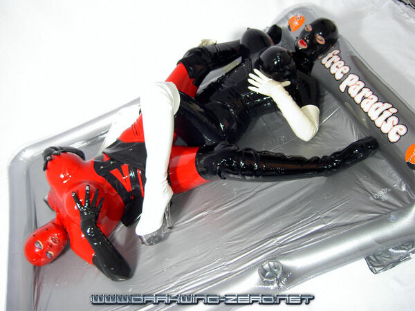 Lady Avengelique and Vexis wearing full heavy rubber torpedotits suits and doing some soft wrestling