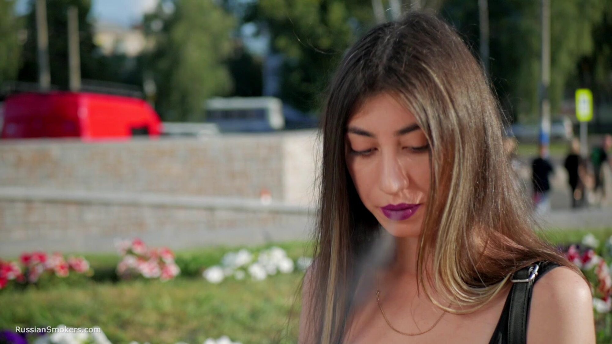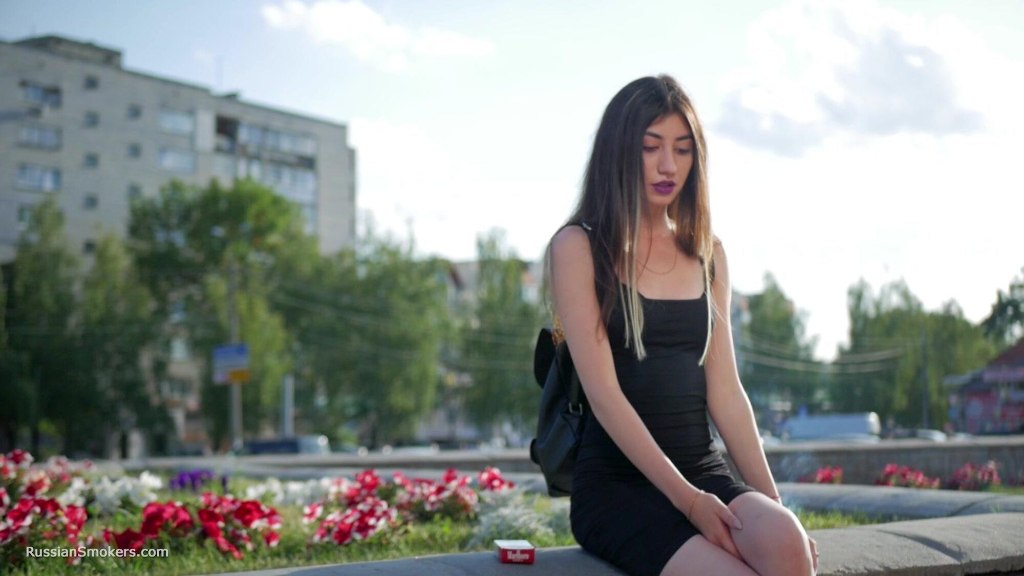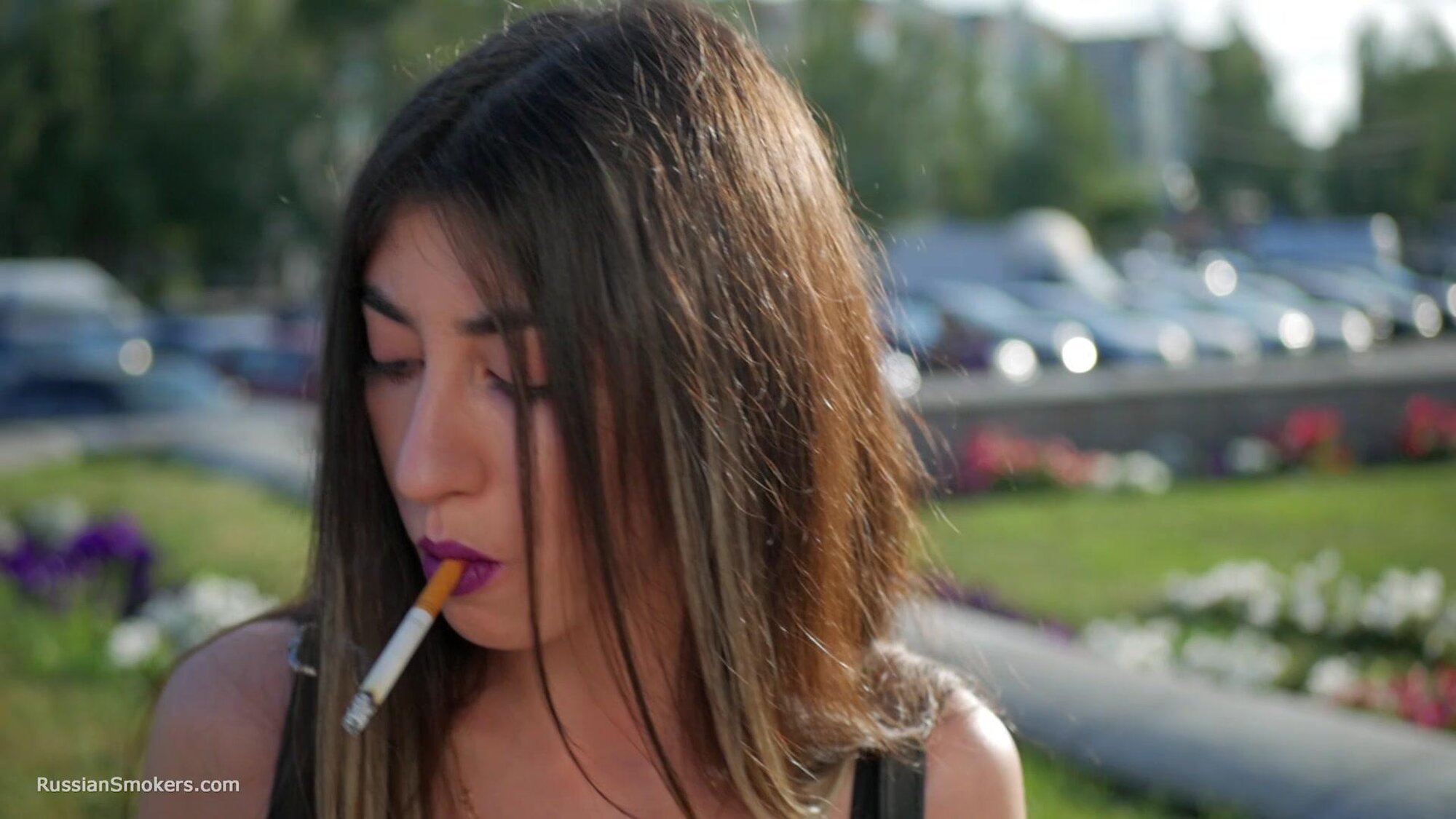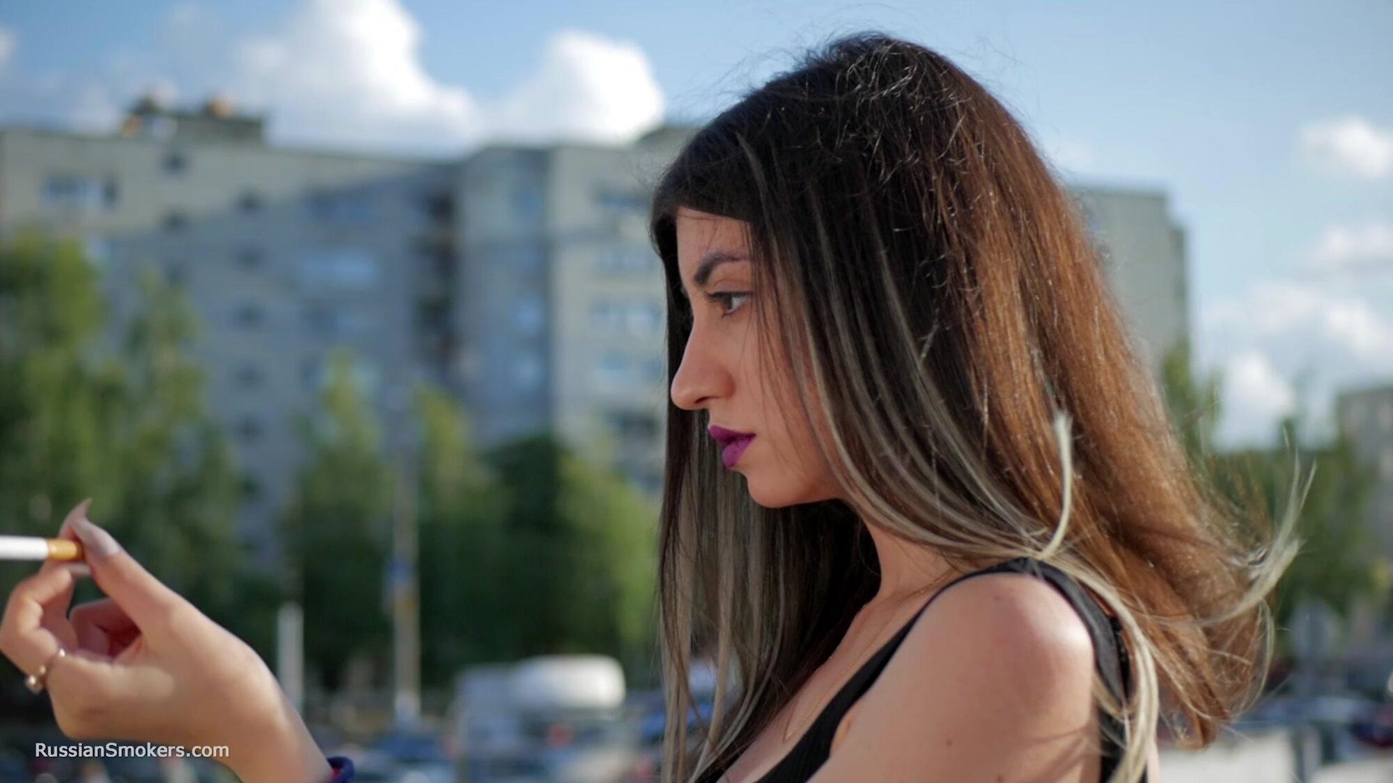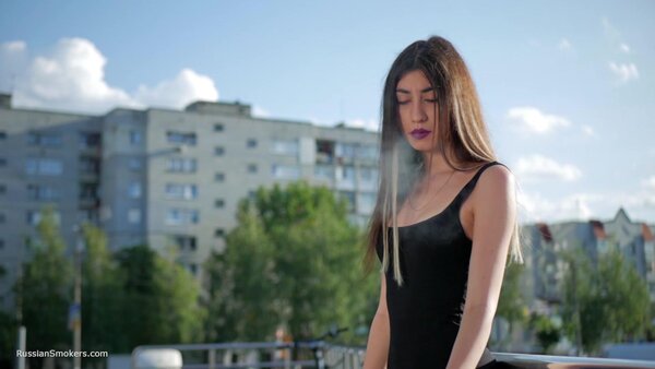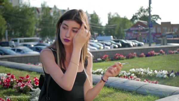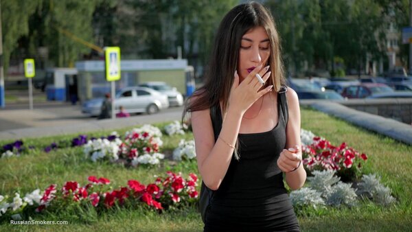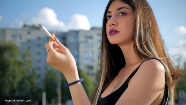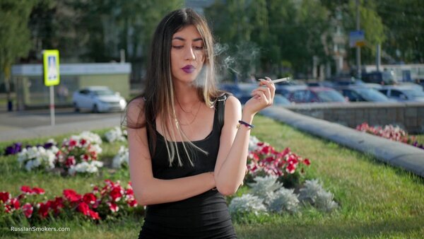 Stunning Anastasia loves this gorgeous day and taking a so much needed cigarette break. In this smoking fetish video, you will find her in the middle of the buzzing city, enjoying a 100 mm Marlboro cigarette. She is holding it between her purple lips, taking deep relaxing drags and flicking it later with her long fingers.