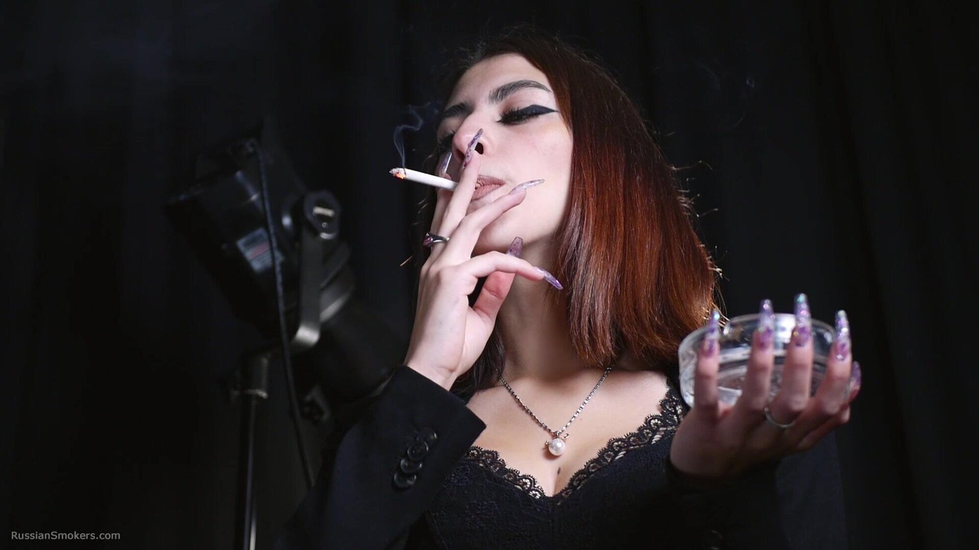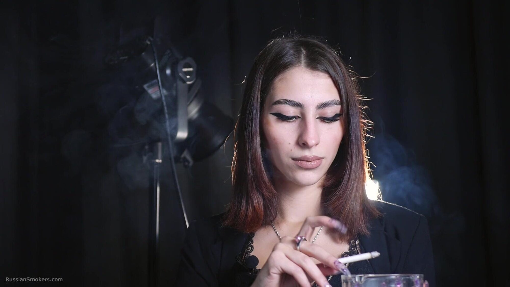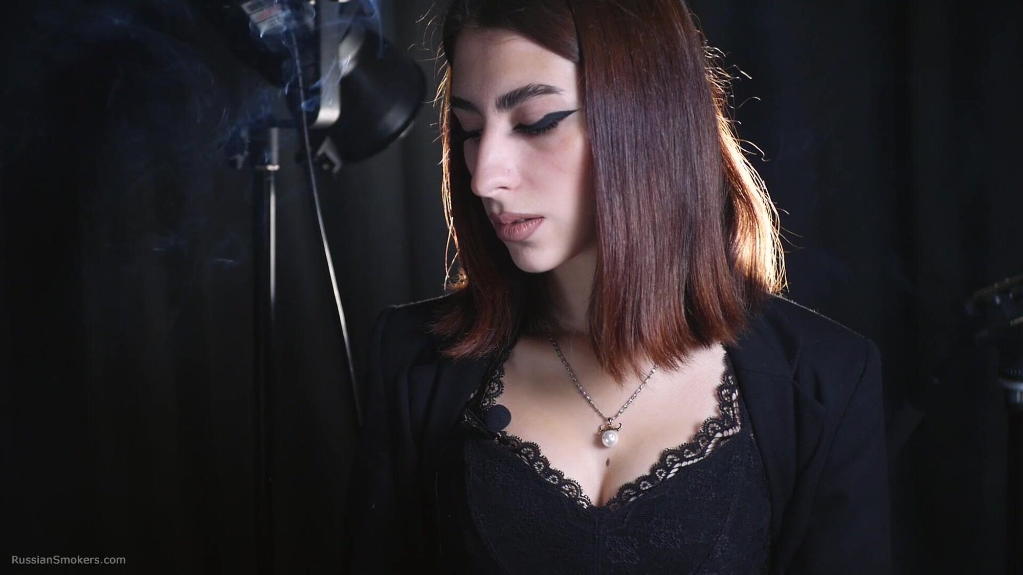 Studio shots with lovely lady Arina. She is doing it for the first time. This video includes: Smoking, nose exhales, blowing to camera, smoking without hands, a pretty lady)