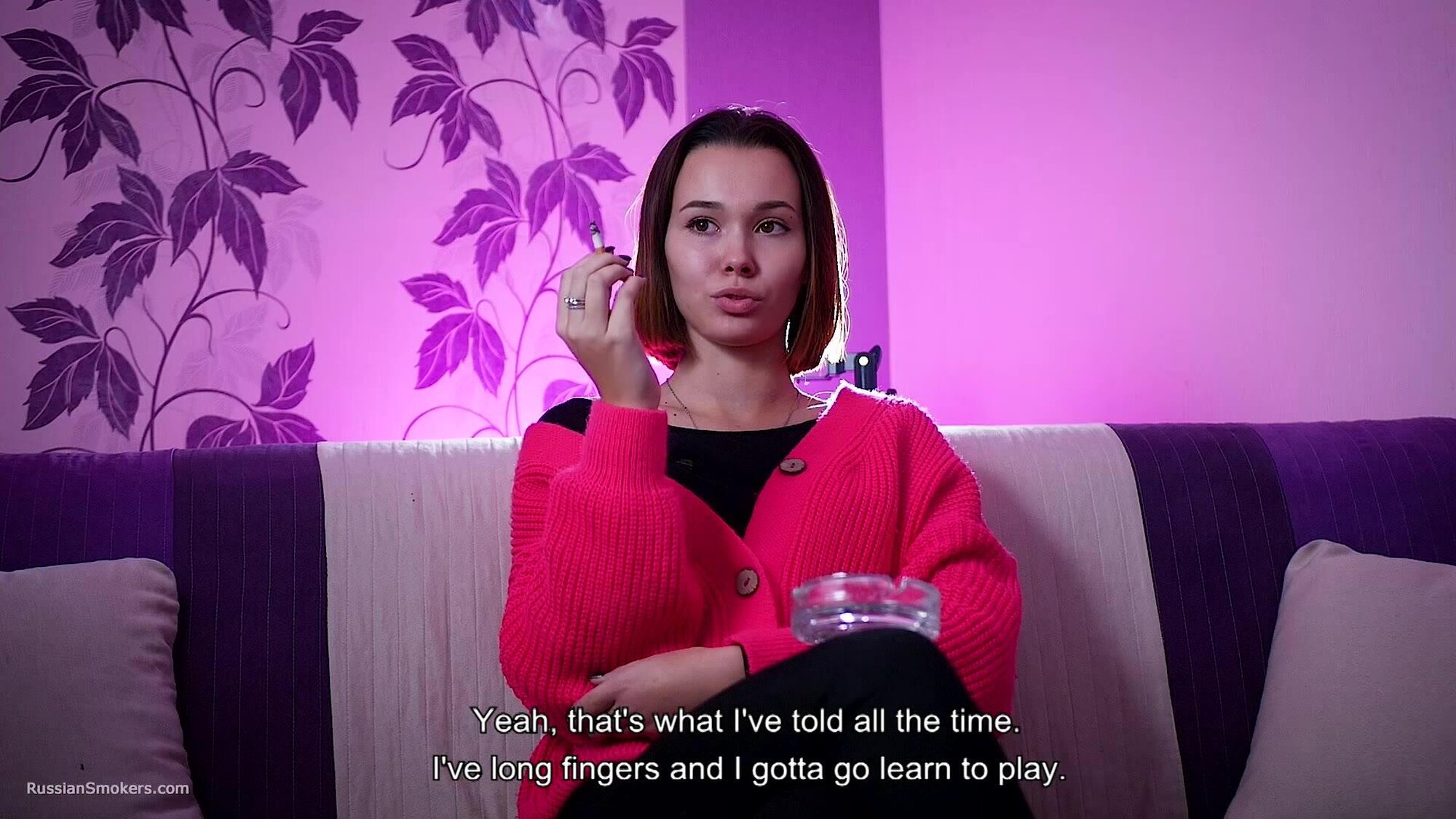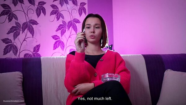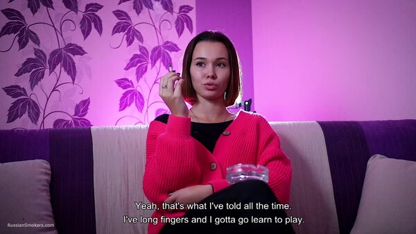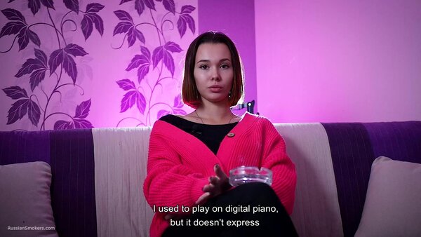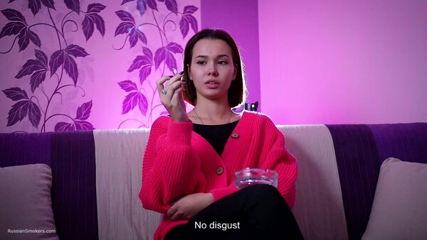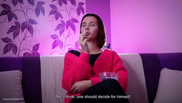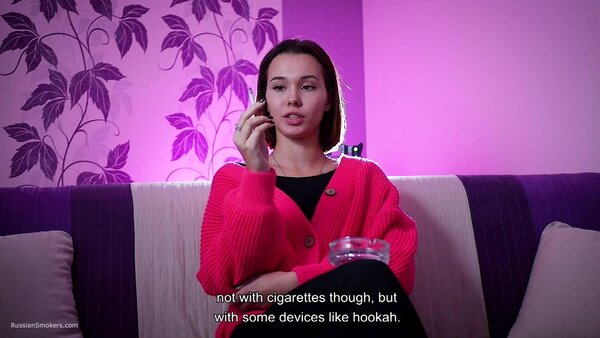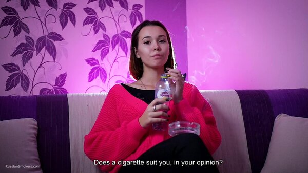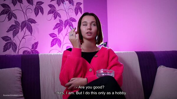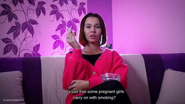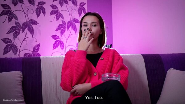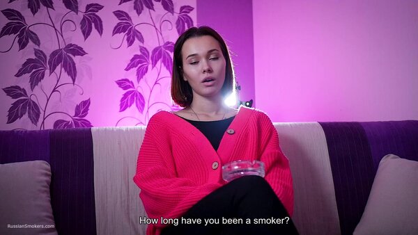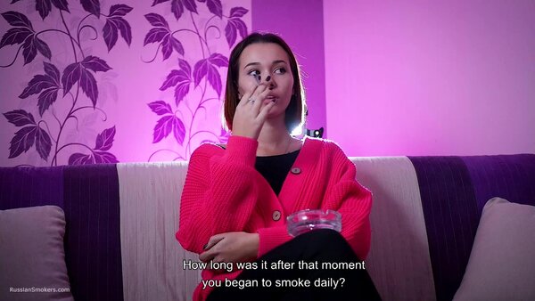 Questions to her:What's your name and how old are you?How long have you been a smoker?Can you tell how did it happen? Who showed you. Where'd you learn?Which cigarettes were these?Why did you do this? Out of curiosity?Did you ever smoke these before?How long was it after that moment you began to smoke daily?How often do you do this?So you don't have an addiction to smoking, have you?How many cigarettes are able to smoke at once?Can you smoke with no hands in front of camera now?Which cigarettes are your favourite? How many brands did you try anyway?Tell me where do you regularly smoke? Which places?Do your parents know that you smoke.Do you live together with parents?Did you ever happen to smoke on playgrounds or in a hallway?Can you do any tricks like blowing smoke rings or anything?Do you smoke hookah a lot? Vape?Do you spit when you smoke cigarettes?Do you feel smoking effects your health somehow?Do you pay attention to inscriptions on a pack that smoking harms health?Do you litter when you open a new pack?Do you smoke your cigarette when you wake up or in the middle of the day? Or it's always different?And what do you feel after that cigarette? Does kick your brain?How do you feel about taste and smell of cigarettes when you're smoking?Do you regret you began smoking? And you didn't try give up smoking?D'you know that there're people who enjoy watching at smoking ladies and what do you think about it?Can you try to smoke another right after the first one?Does a cigarette suit you, in your opinion?Do you perceive yourself sexier while smoking?You feel yourself horned up when smoking?Are you going to stop smoking for the period of pregnancy?It's just that some pregnant girls carry on with smoking?What are your hobbies? Can you tell about it?And what do you sell as a sales representative?Do you have any smoking related rituals or traditions?Do you normally do anything to get rid of the tobacco smell or taste out of your mouth?Are you seeing someone? Does he smoke?What kind of men do you prefer smoking or non-smoking?Have you ever given a non-smoker advice to start smoking?Do you count how much you spend on smoking a month?Did you like the second cig or it's hard?