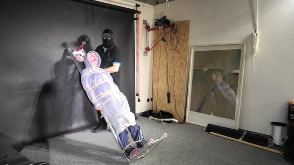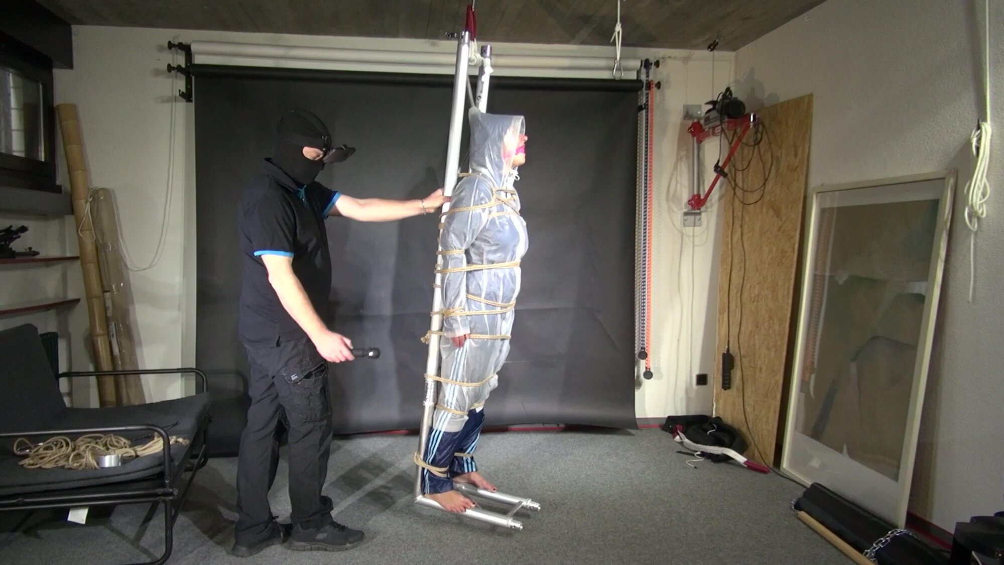 New! Alice tied and gagged in shiny nylon Rainwear and PVC Raincoat. PVC is ripped off.