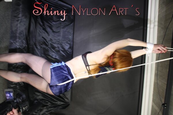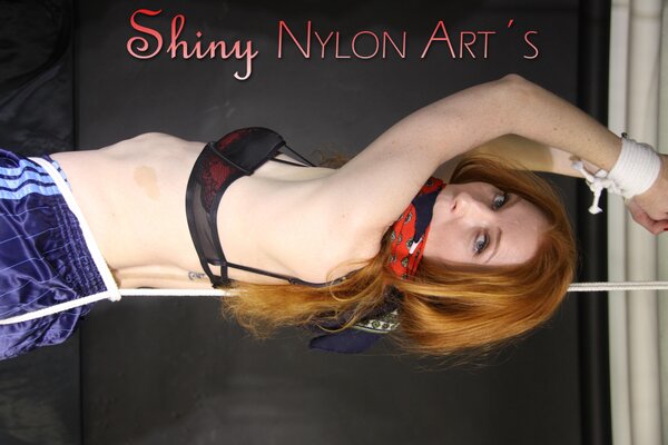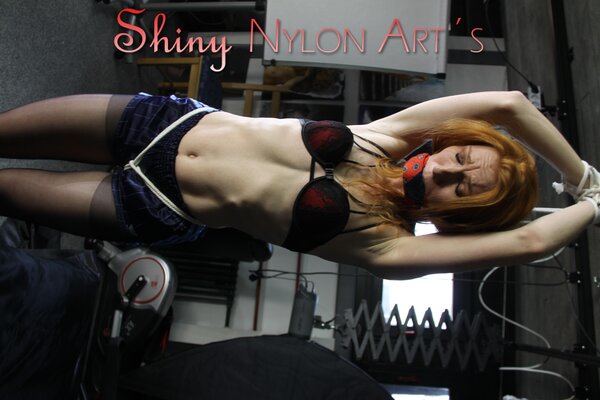 ***NEW MODELL RONJA*** wearing a sexy blue shiny nylon shorts over nylons with just a bra being tied and gagged with ropes and a clothgag overhead (Pics)