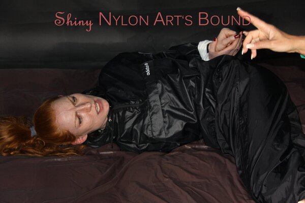 SEXY RONJA being overhelmed, tied and gagged from Stella with ropes and a ballgag on a sofa both wearing shiny nylon rainwear (Pics) Part 2