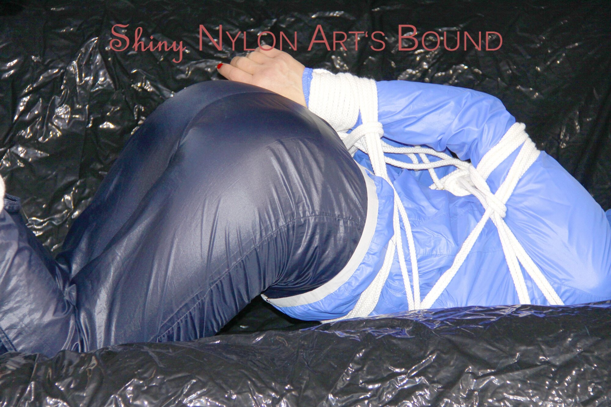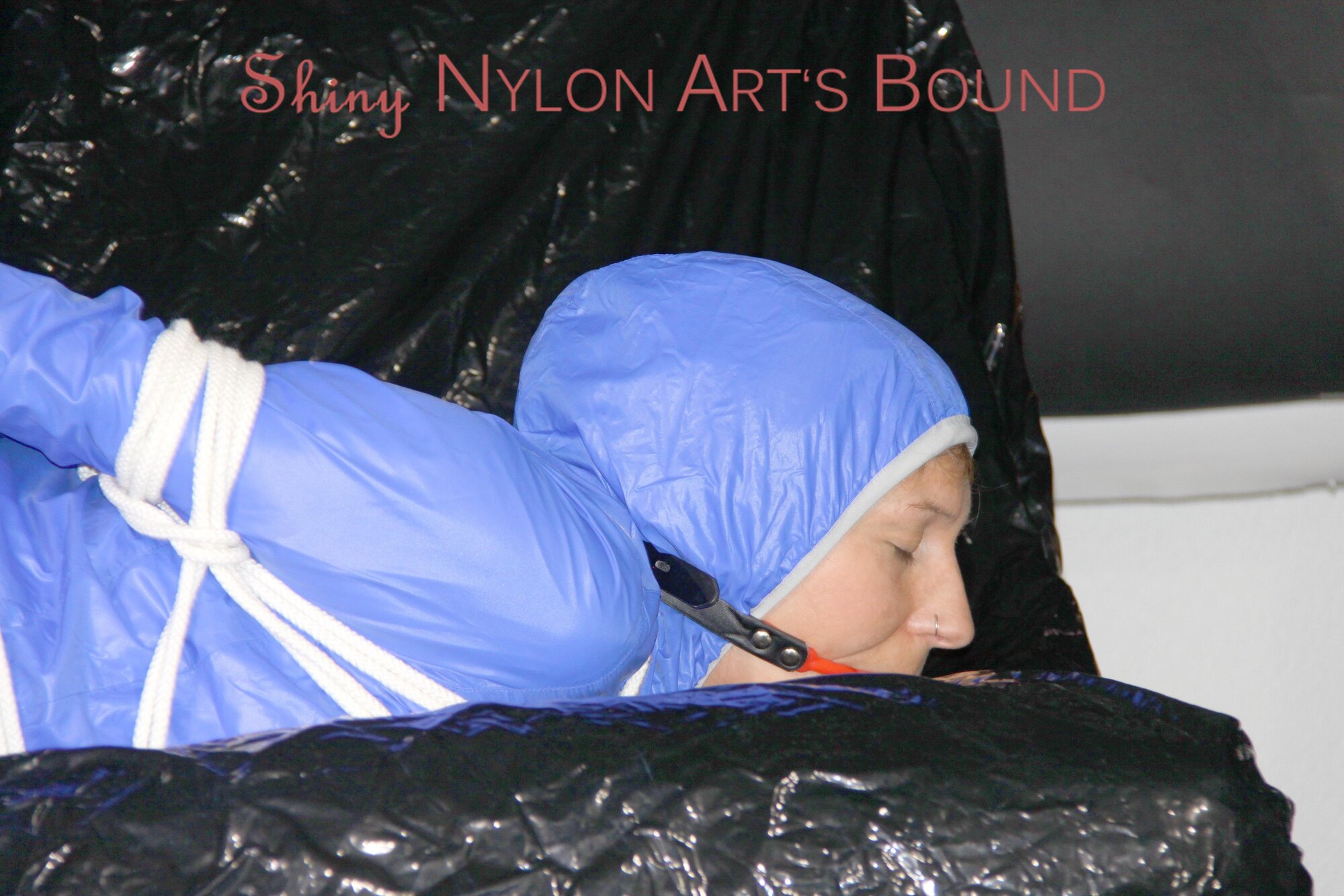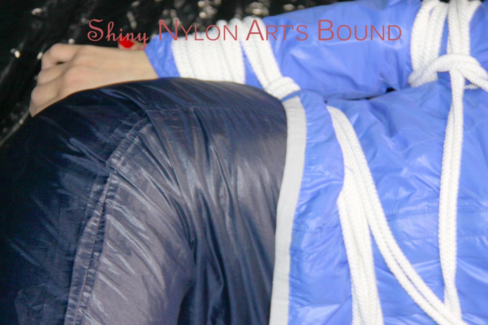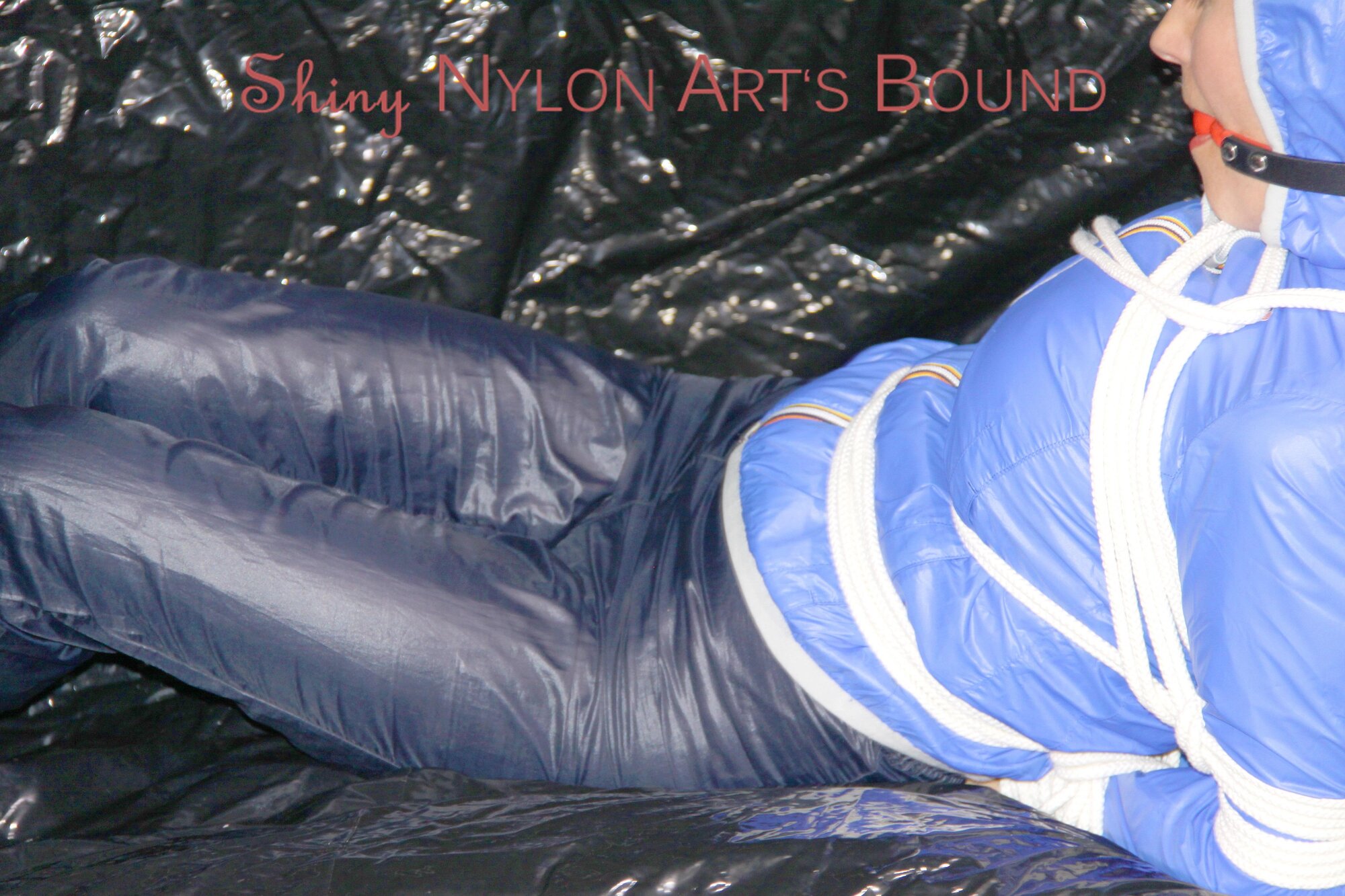 ***SEXY SANDRA*** wearing a supersexy skinny shiny nylon pants and a lightblue shiny nylon rain jacket being bound on a sofa with ropes and a ball gag (Pics)