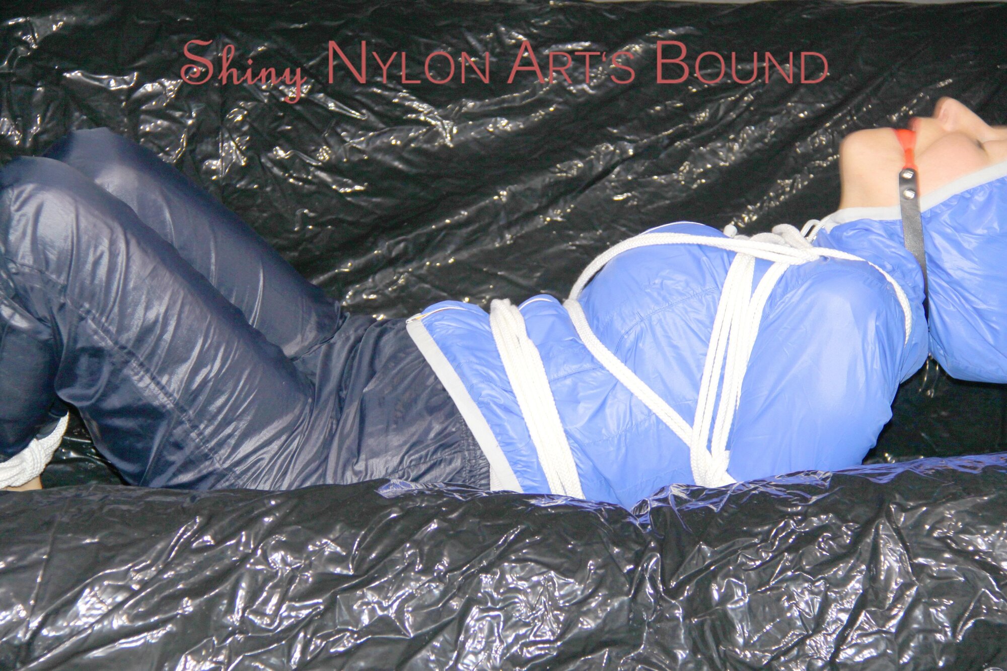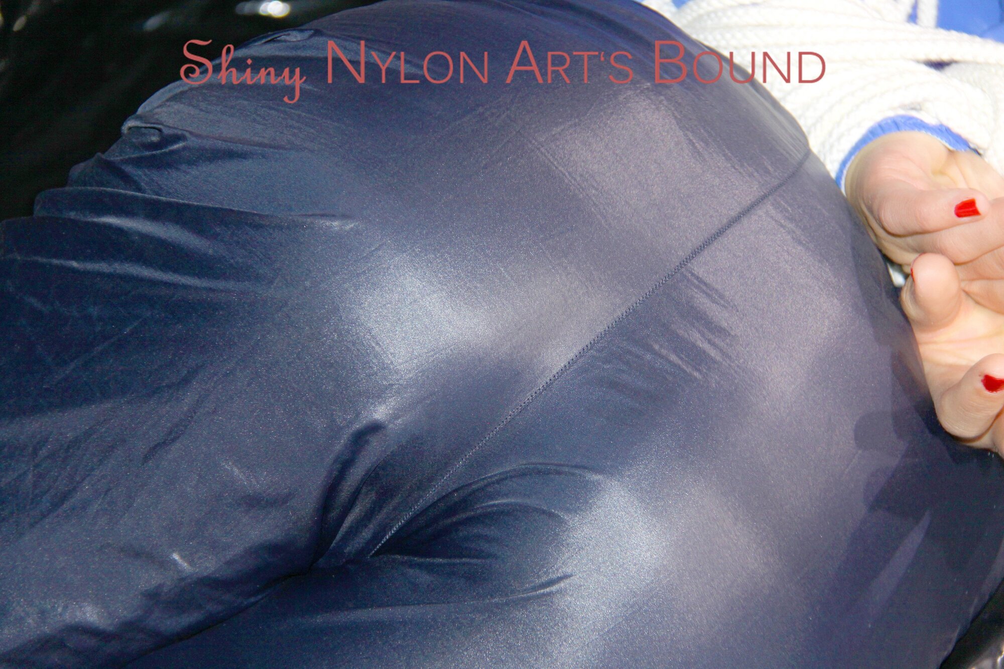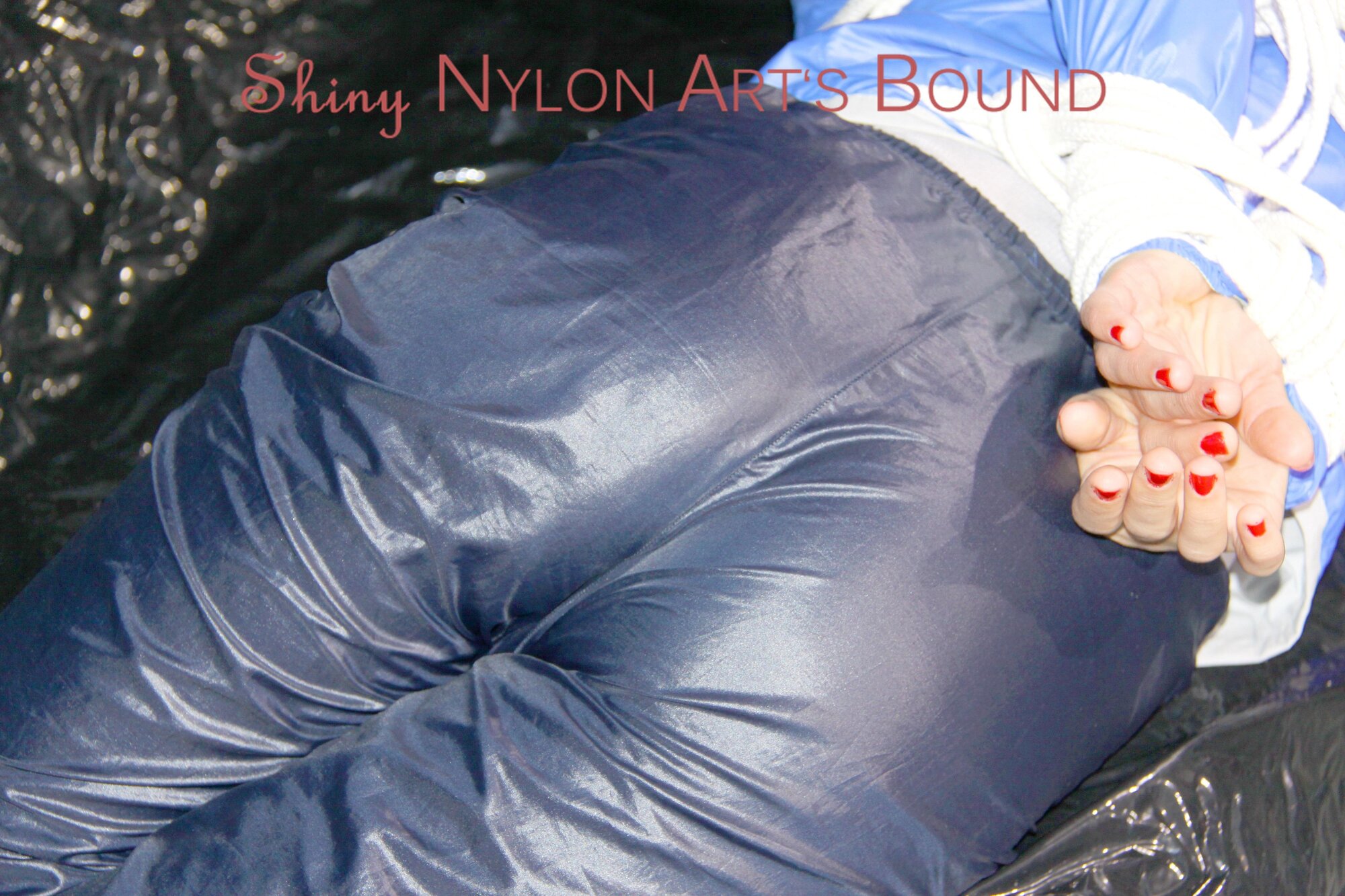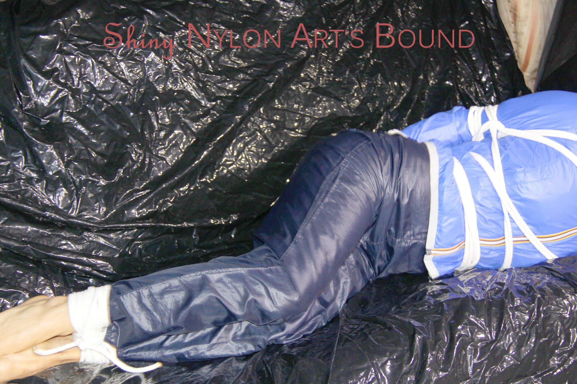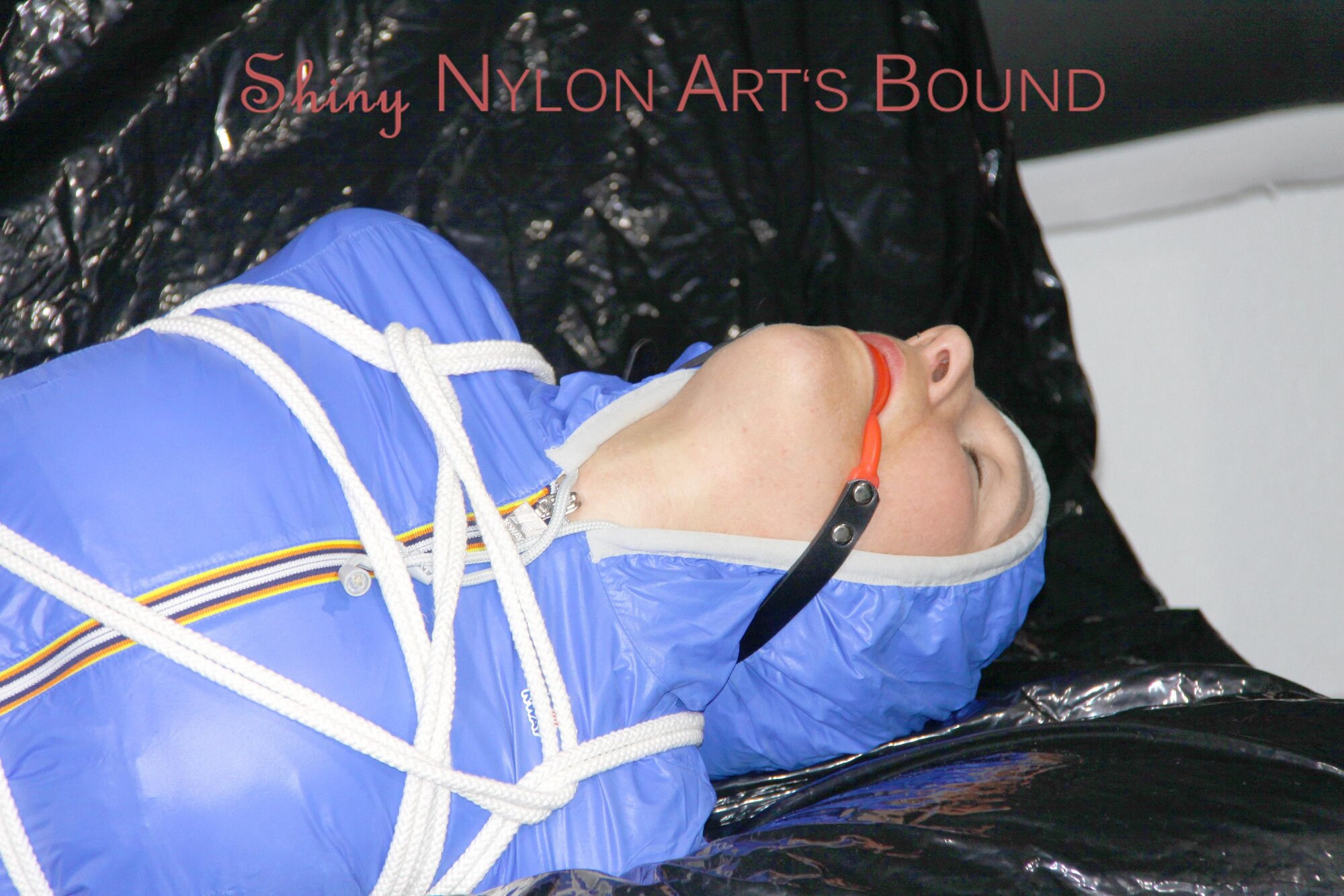 ***SEXY SANDRA*** wearing a supersexy skinny shiny nylon pants and a lightblue shiny nylon rain jacket being bound on a sofa with ropes and a ball gag (Pics)