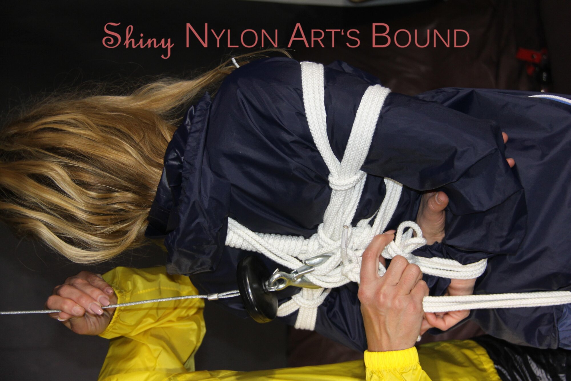 Sandra tied and gagged overhead with ropes and a ballgag overhead prepared to be hunged up by Stella both wearing sexy shiny nylon rainwear (Pics) PART 1 of 2