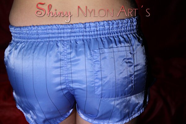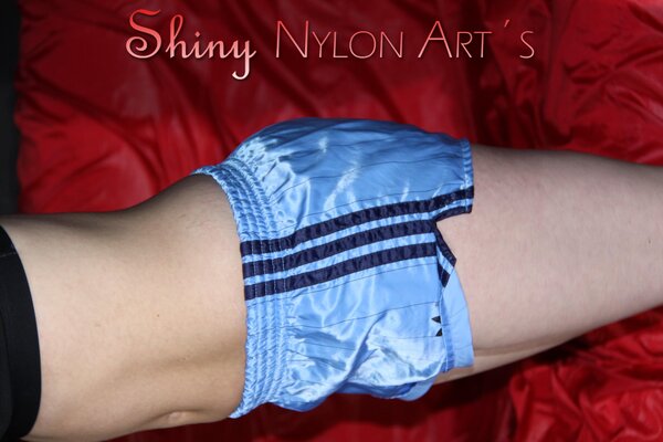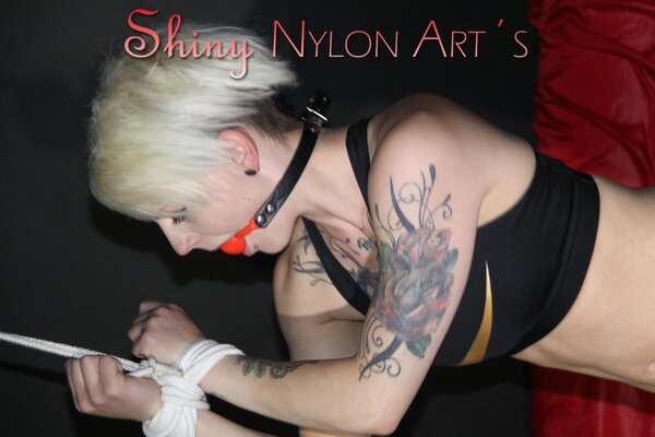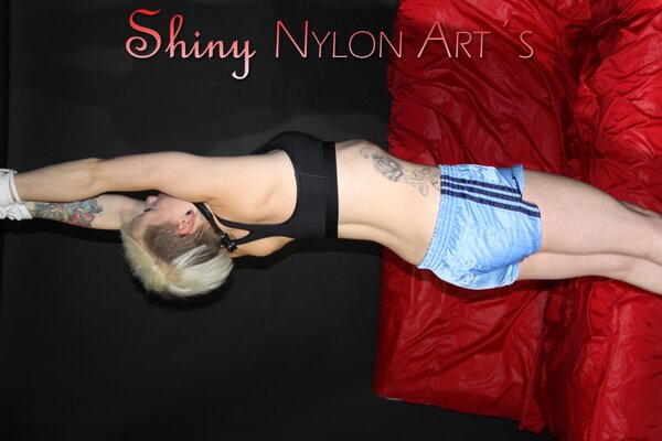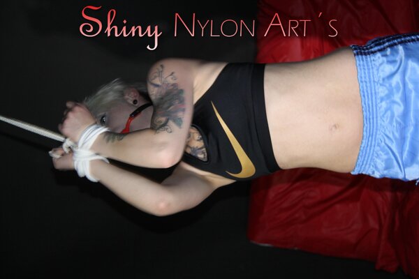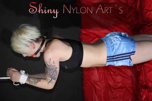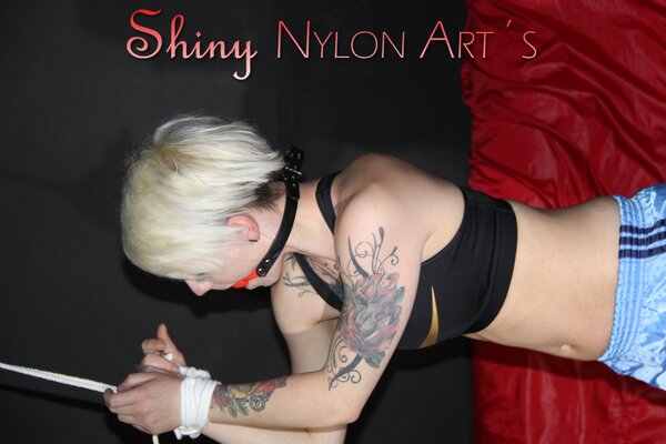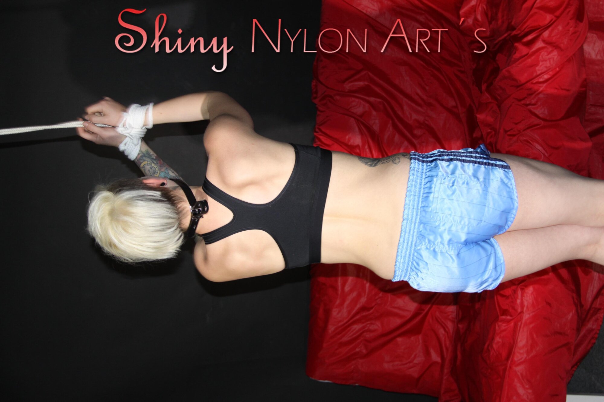 Watching ***NEW MODELL COURTNEY*** wearing a sexy lightblue shiny nylon shorts and a black top being tied and gagged overhead with ropes and a ballgag (Pics)