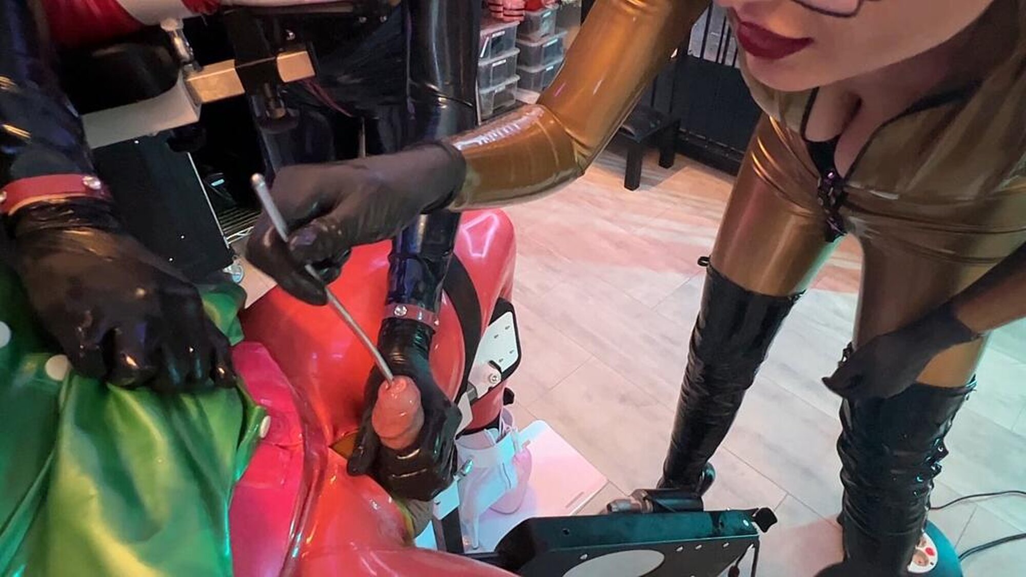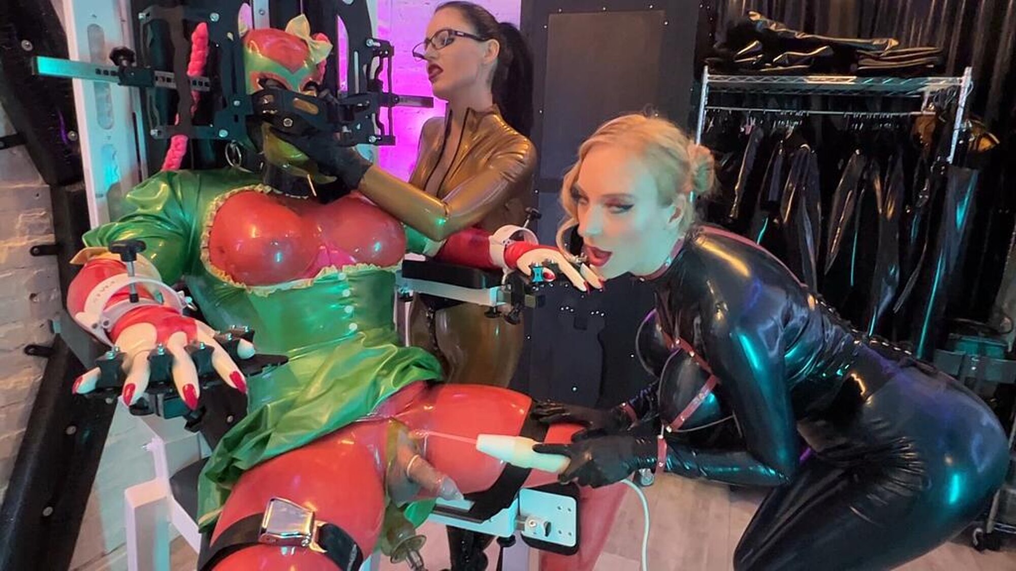 Completely defenceless strapped to the education chair, the sissy first gets a gag in her mouth and then the fucking machine is applied to her fuck hole. What comes next can only be described as extremely sadistic because the mistresses visibly have fun with the clitty of the poor defenceless sissy.