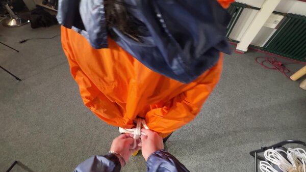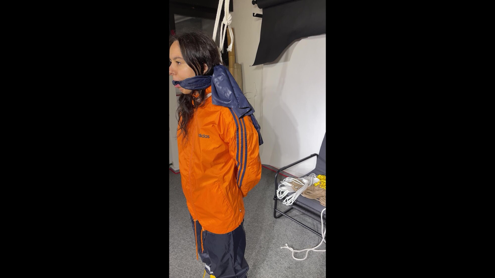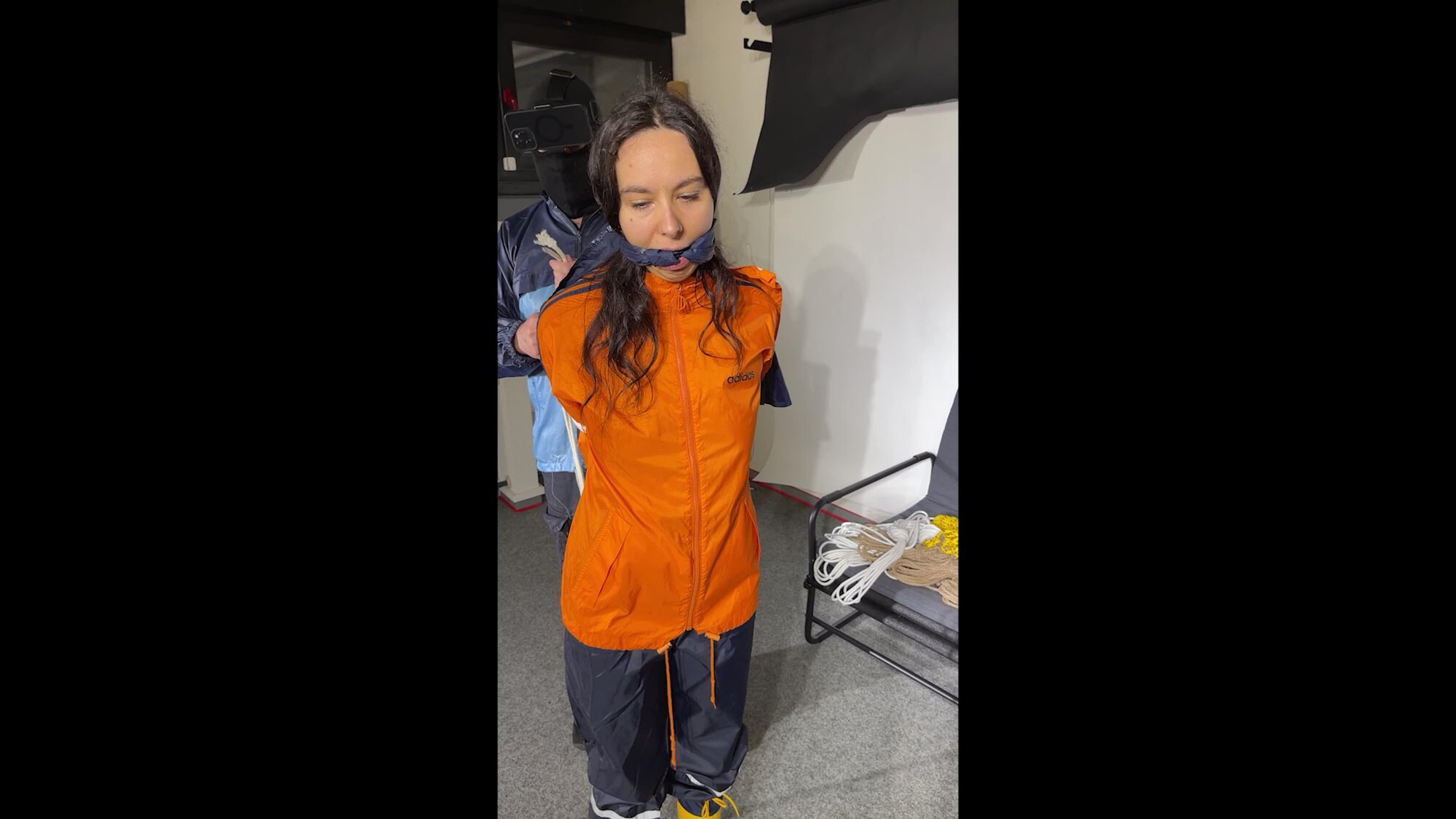 Watch Sandra bound, gagged and nylonhooded in her shiny nylon Rainwear