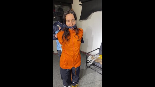 Rachel Adams bound and pantygagged in shiny nylon Rainwear