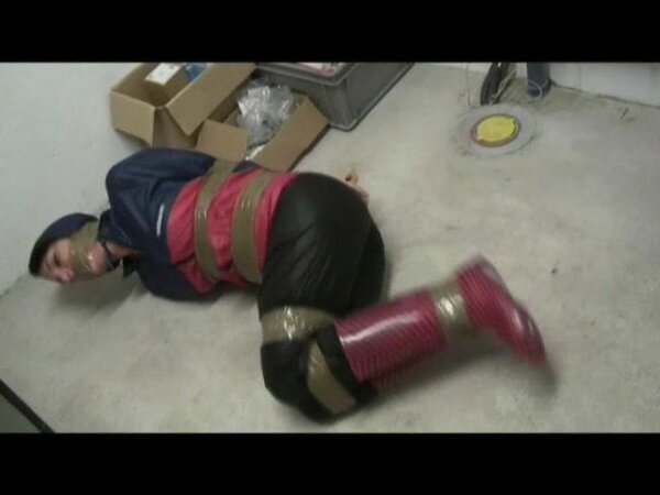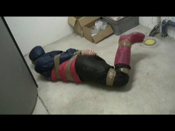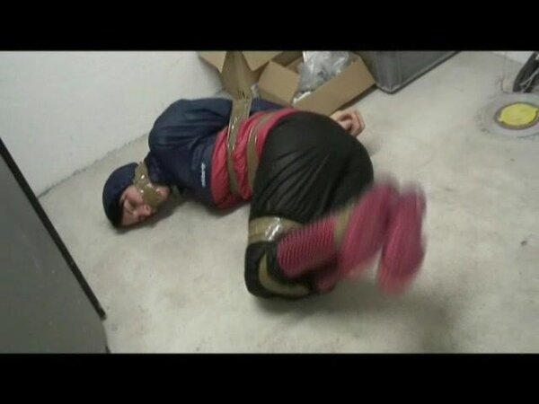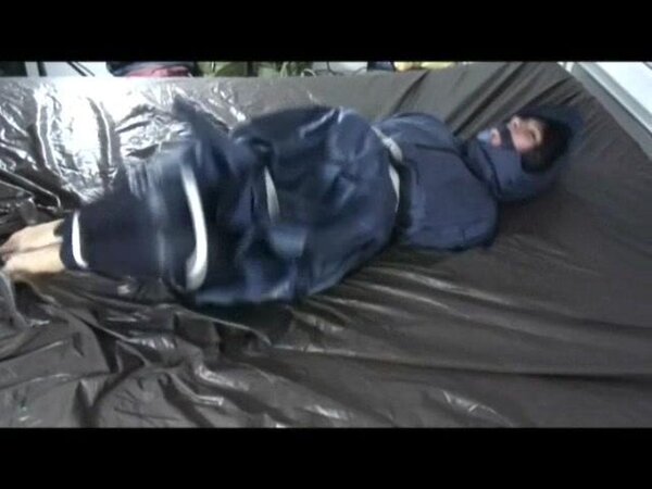 Women tied and gagged in shiny nylon Rainwear