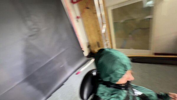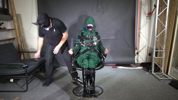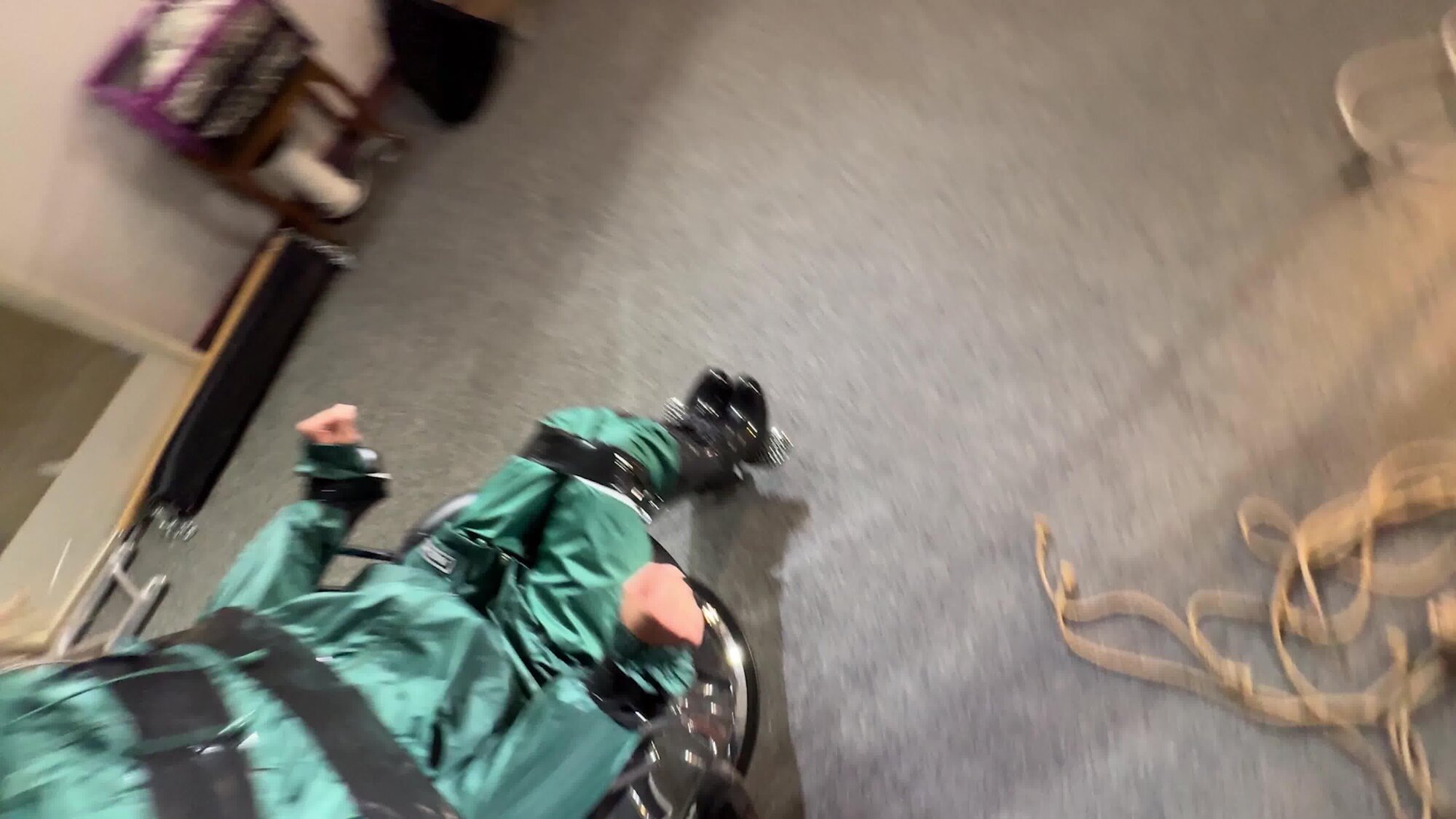 Alice bound and gagged in a nylon Rainsuit on a wheelchair with mouth stuffed and multilayergag