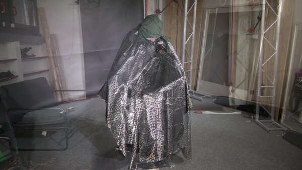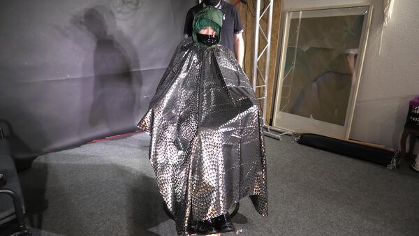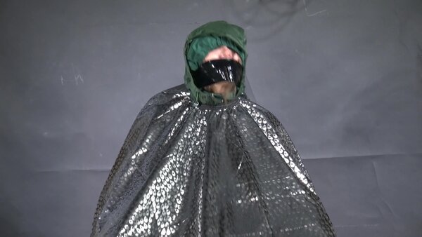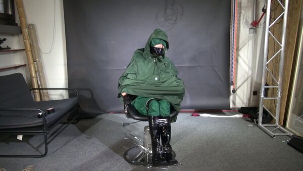 Ayana in a shiny nylon red rainsuit and a see through PVC Rainjacket, tied gagged, hooded and vibed
