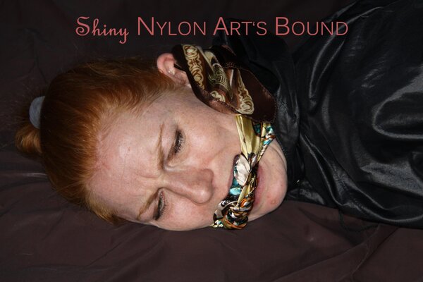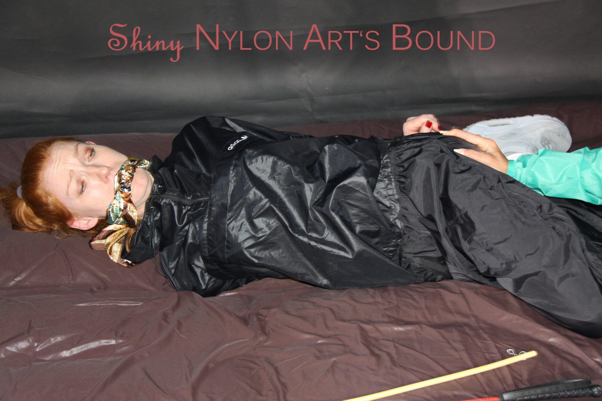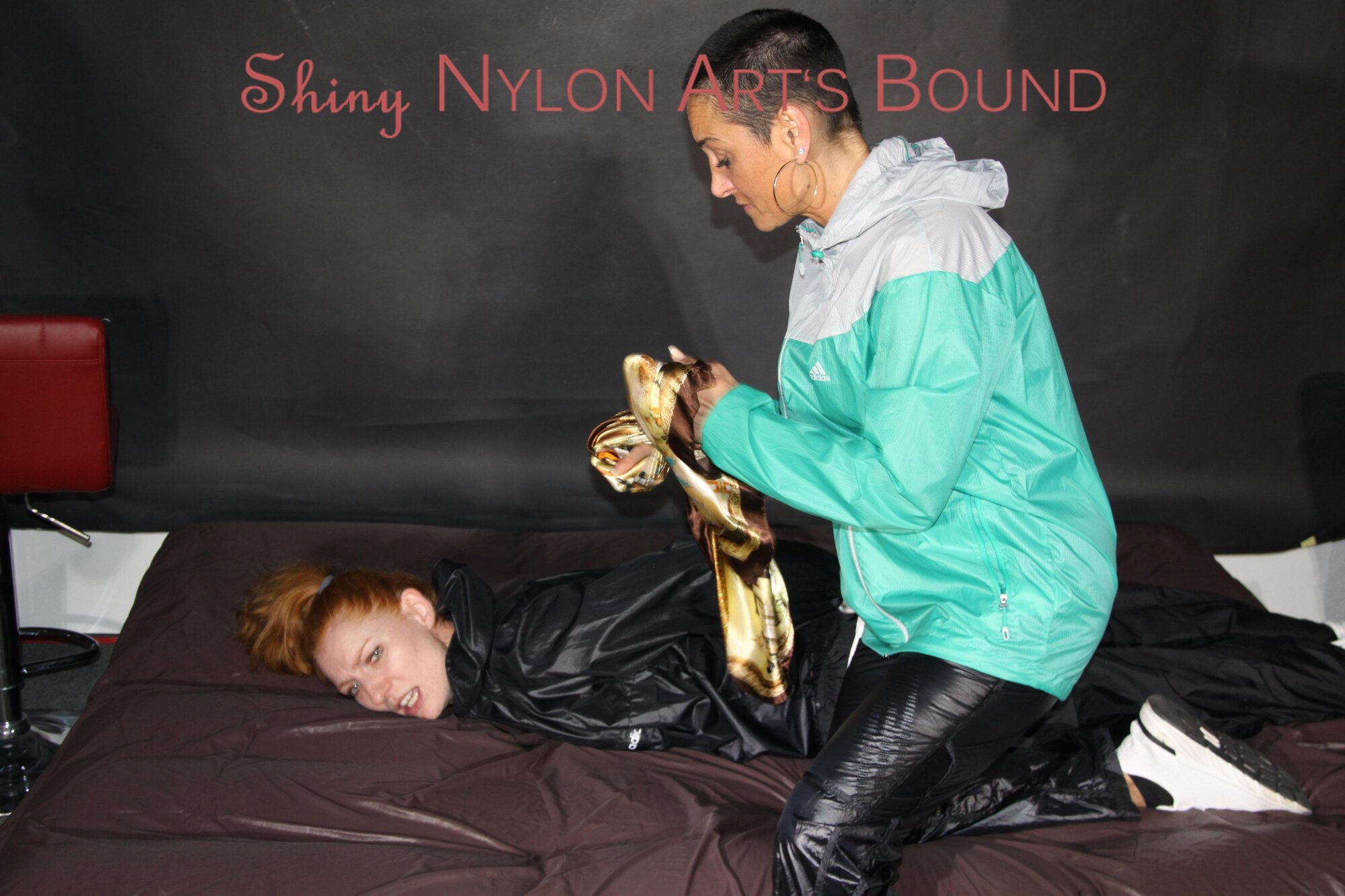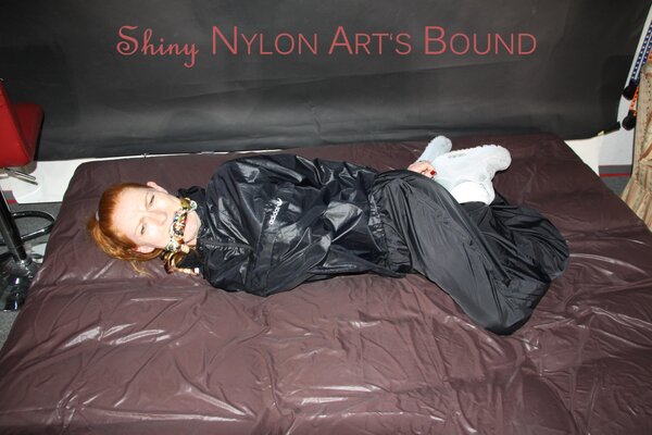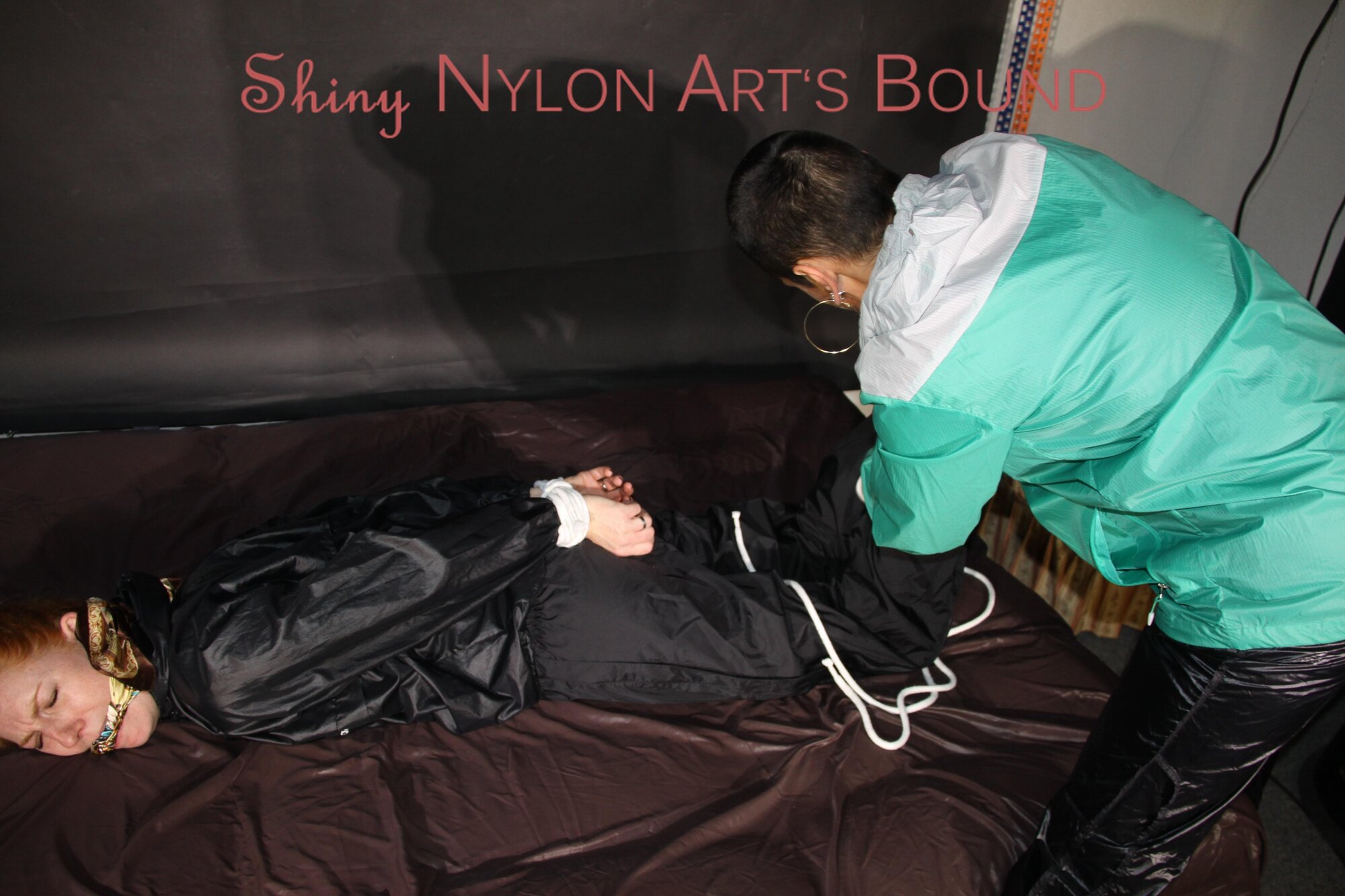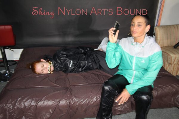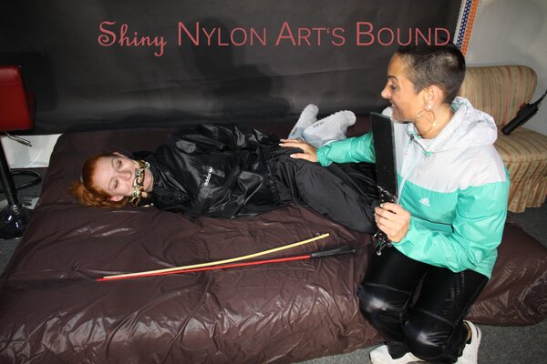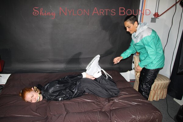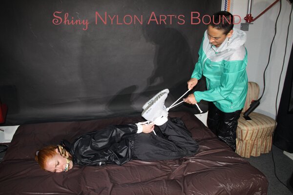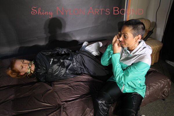 Women tied and gagged in shiny nylon Rainwear