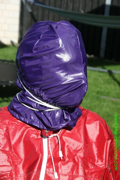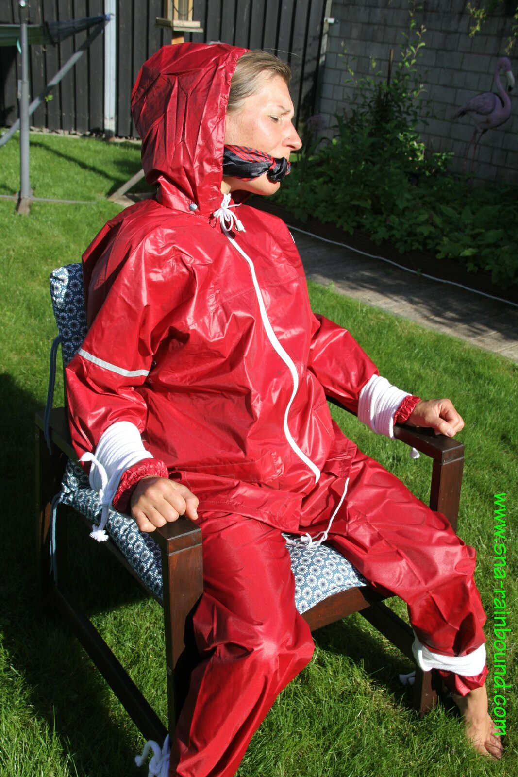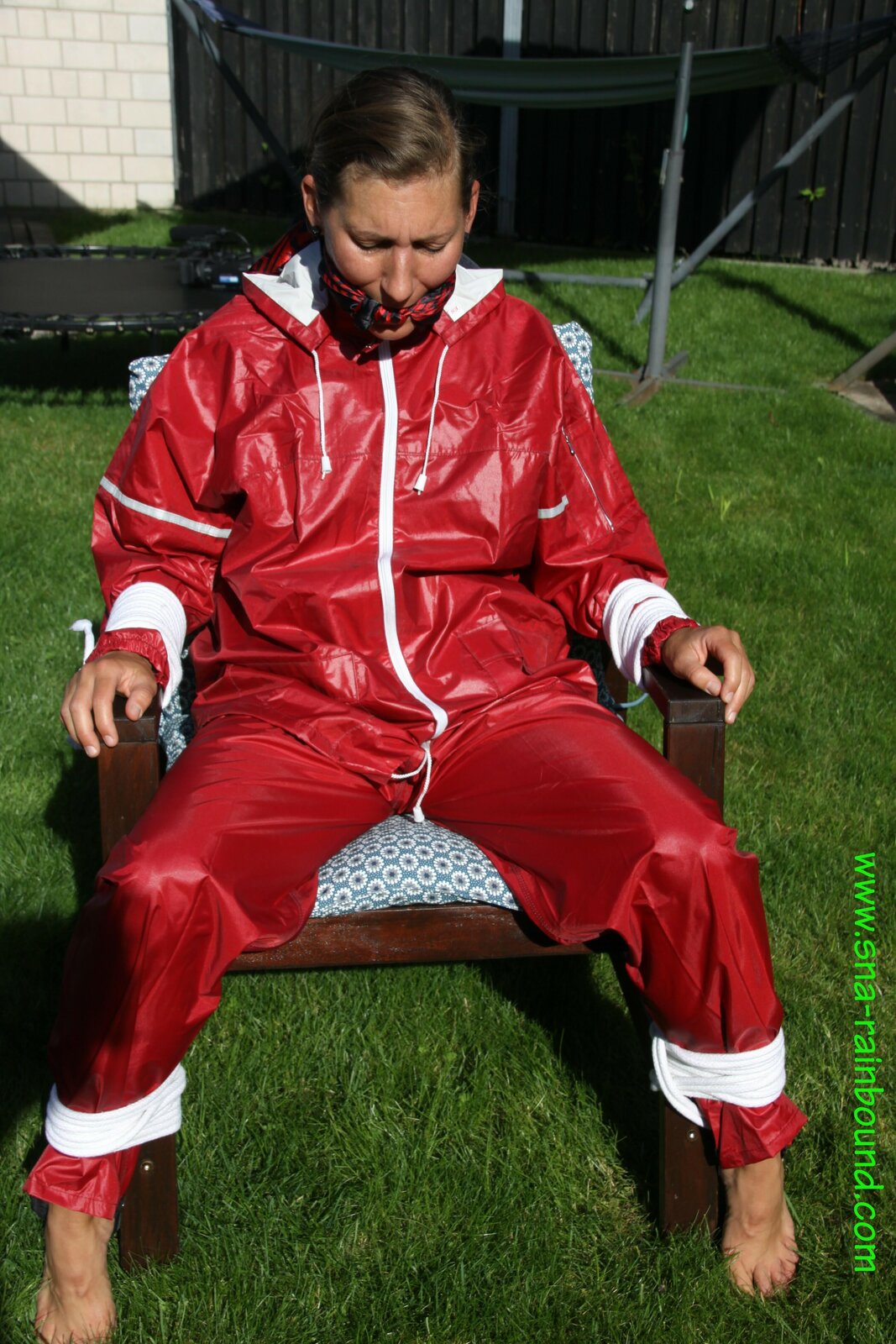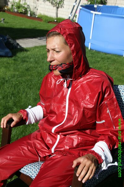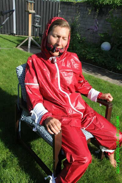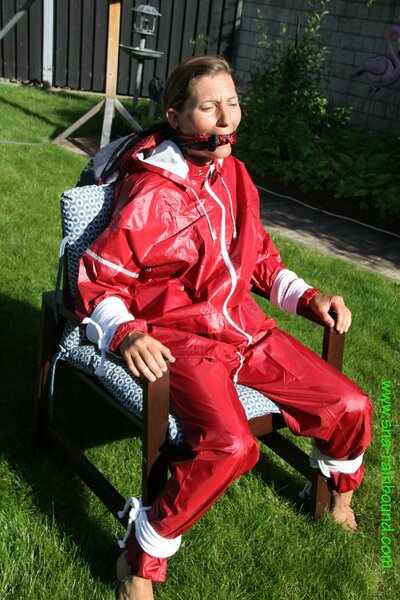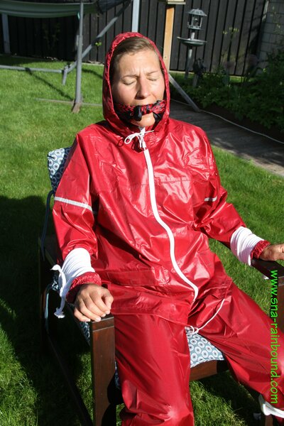 Watch Sandra enjoying beeing bound and gagged in her shiny nylon Rainsuit with a special nylon Hood