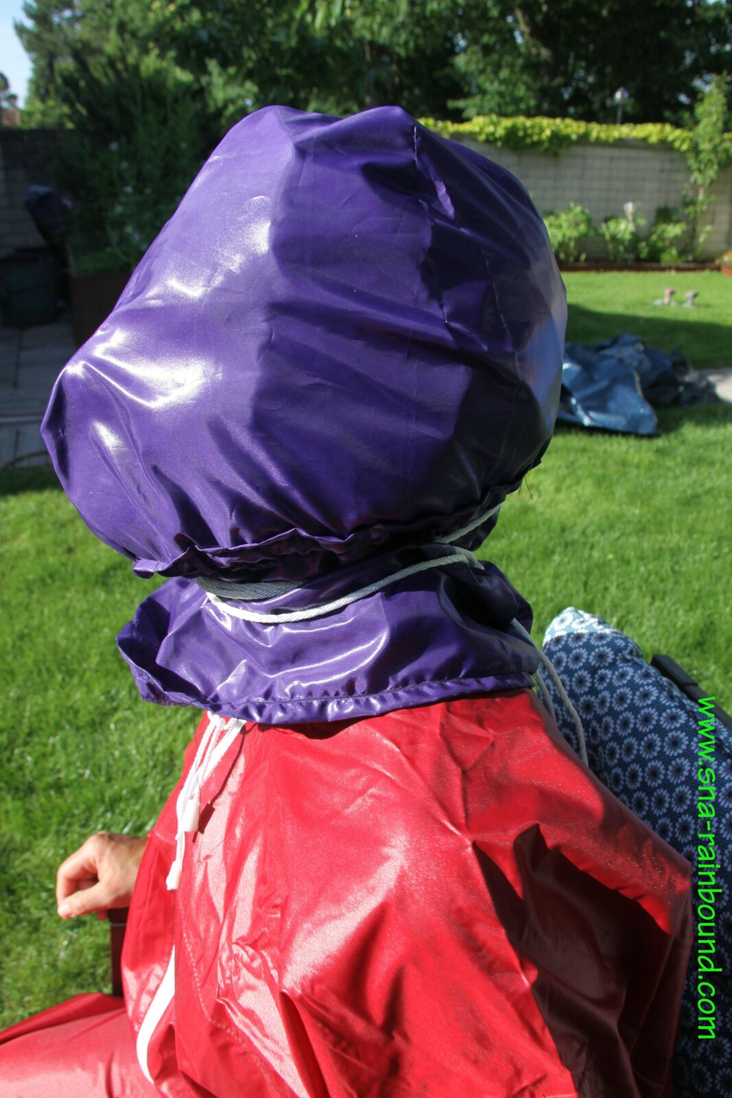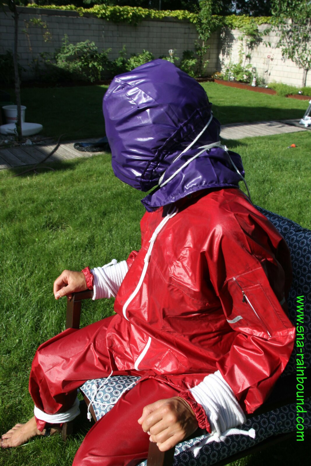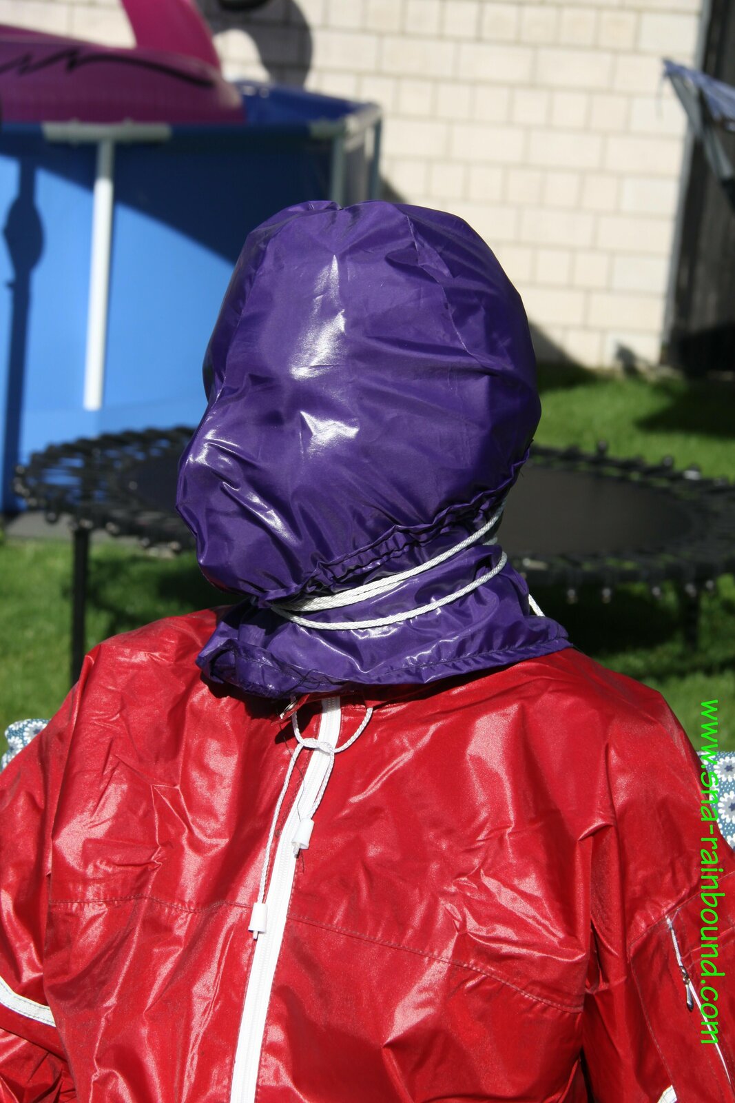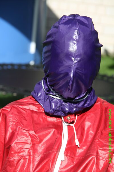 Watch Sandra enjoying beeing bound and gagged in her shiny nylon Rainsuit with a special nylon Hood