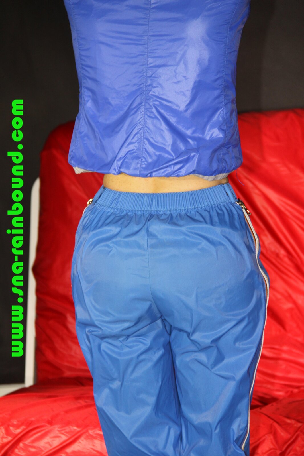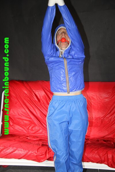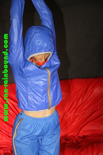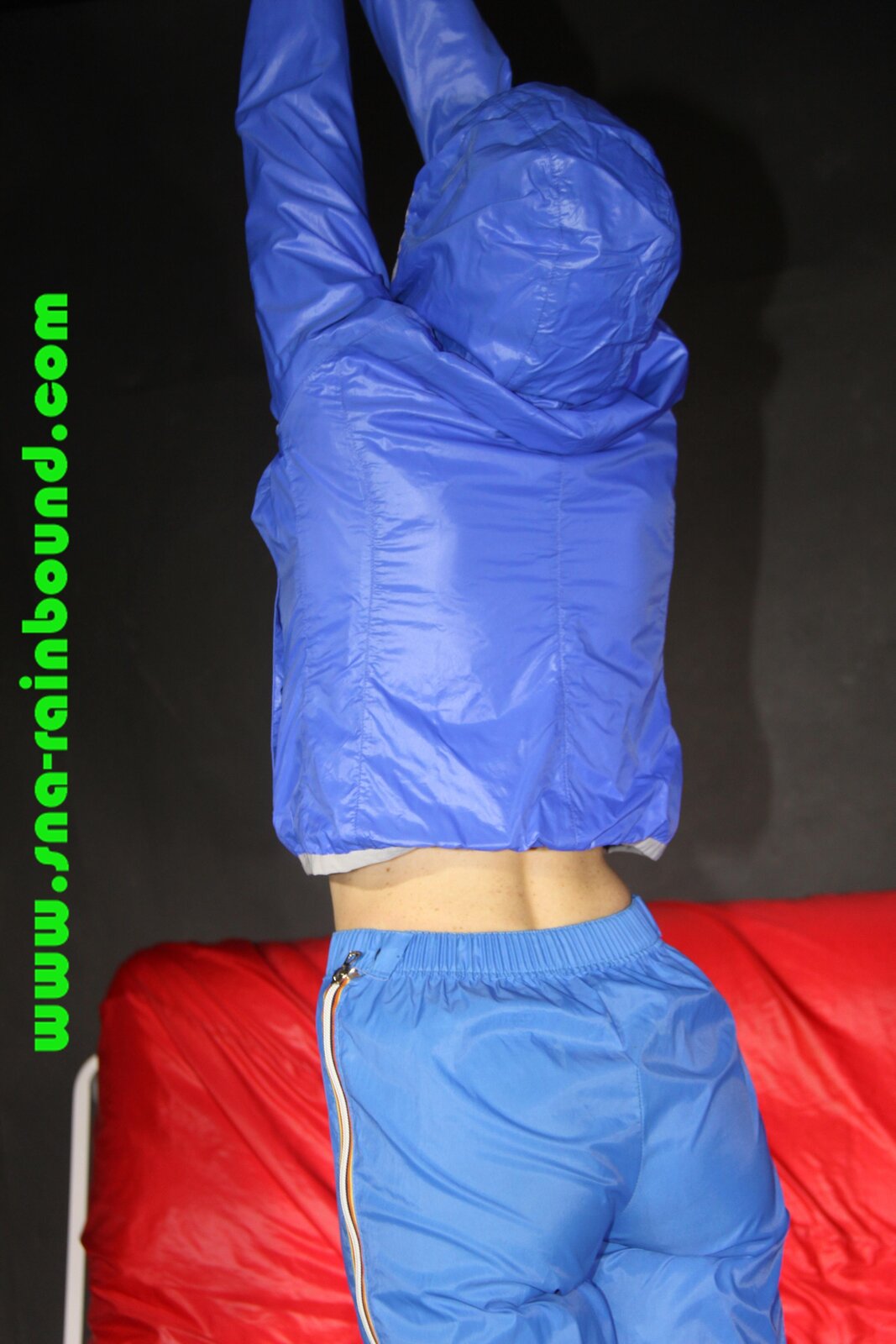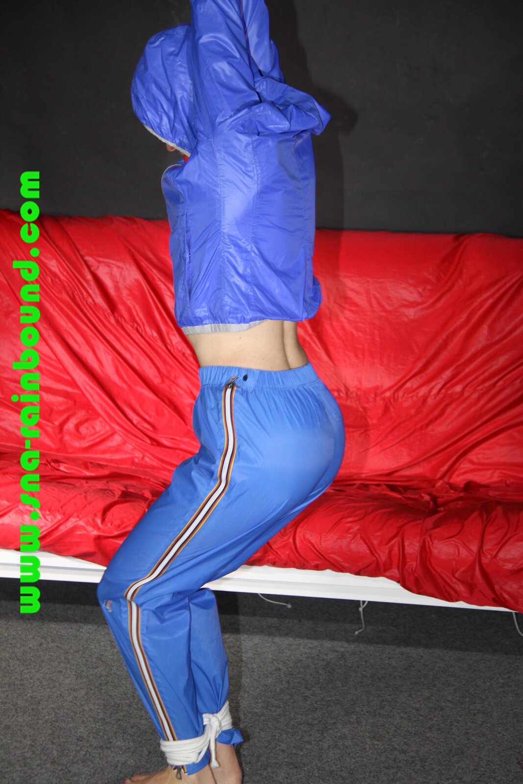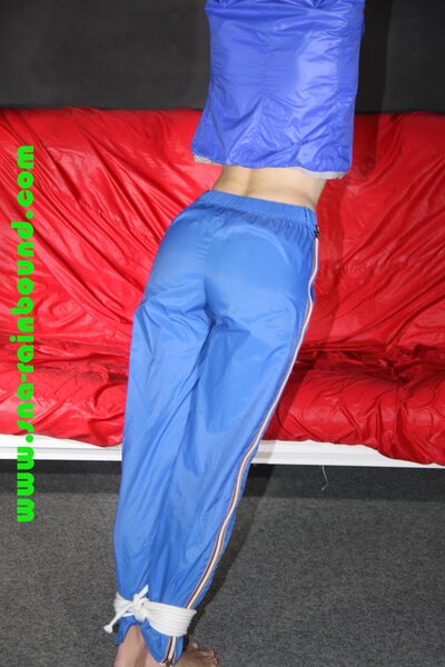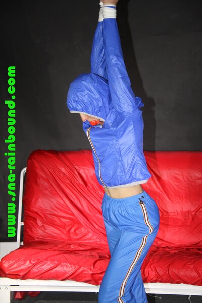 Sexy Sonja being tied and gagged overhead with ropes wearing a sexy blue shiny nylon pants and a jacket (Pics)