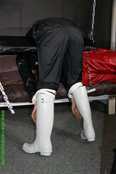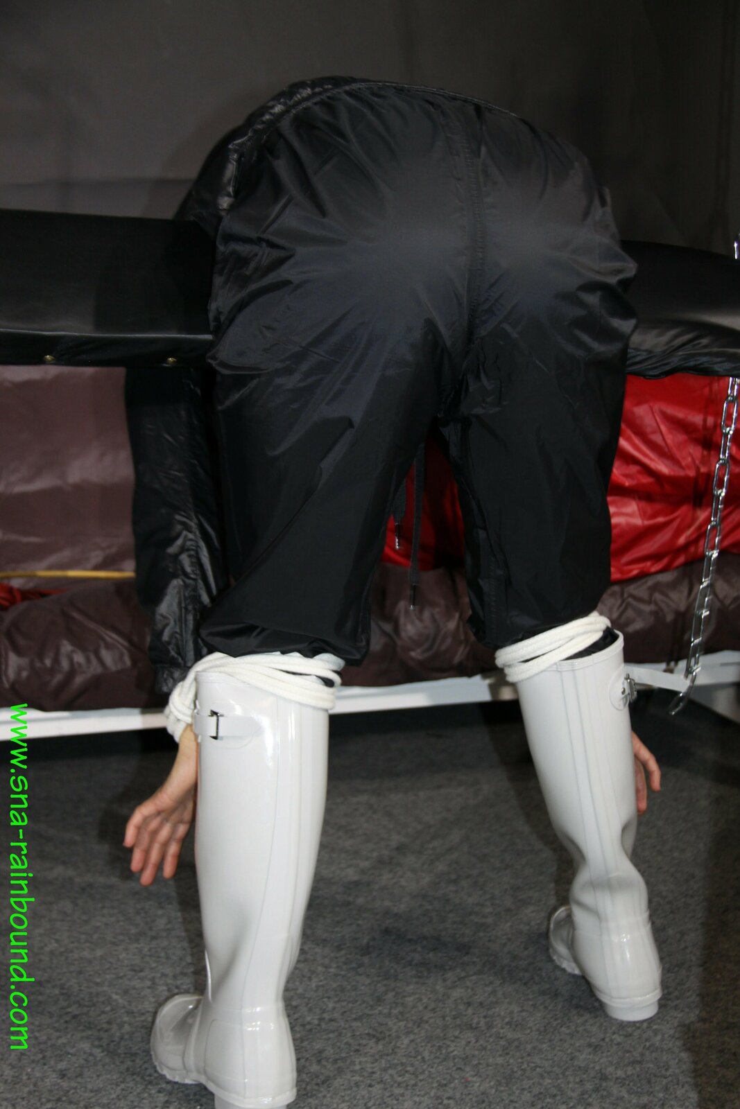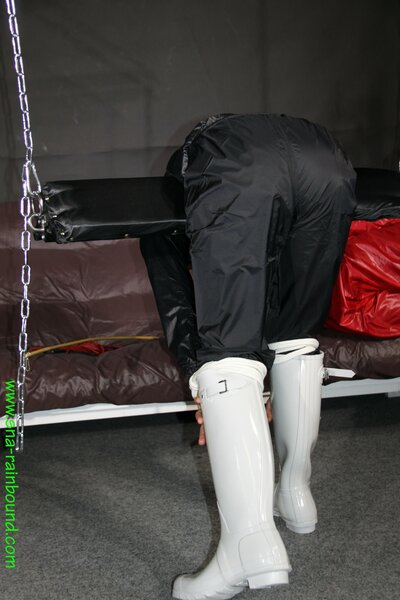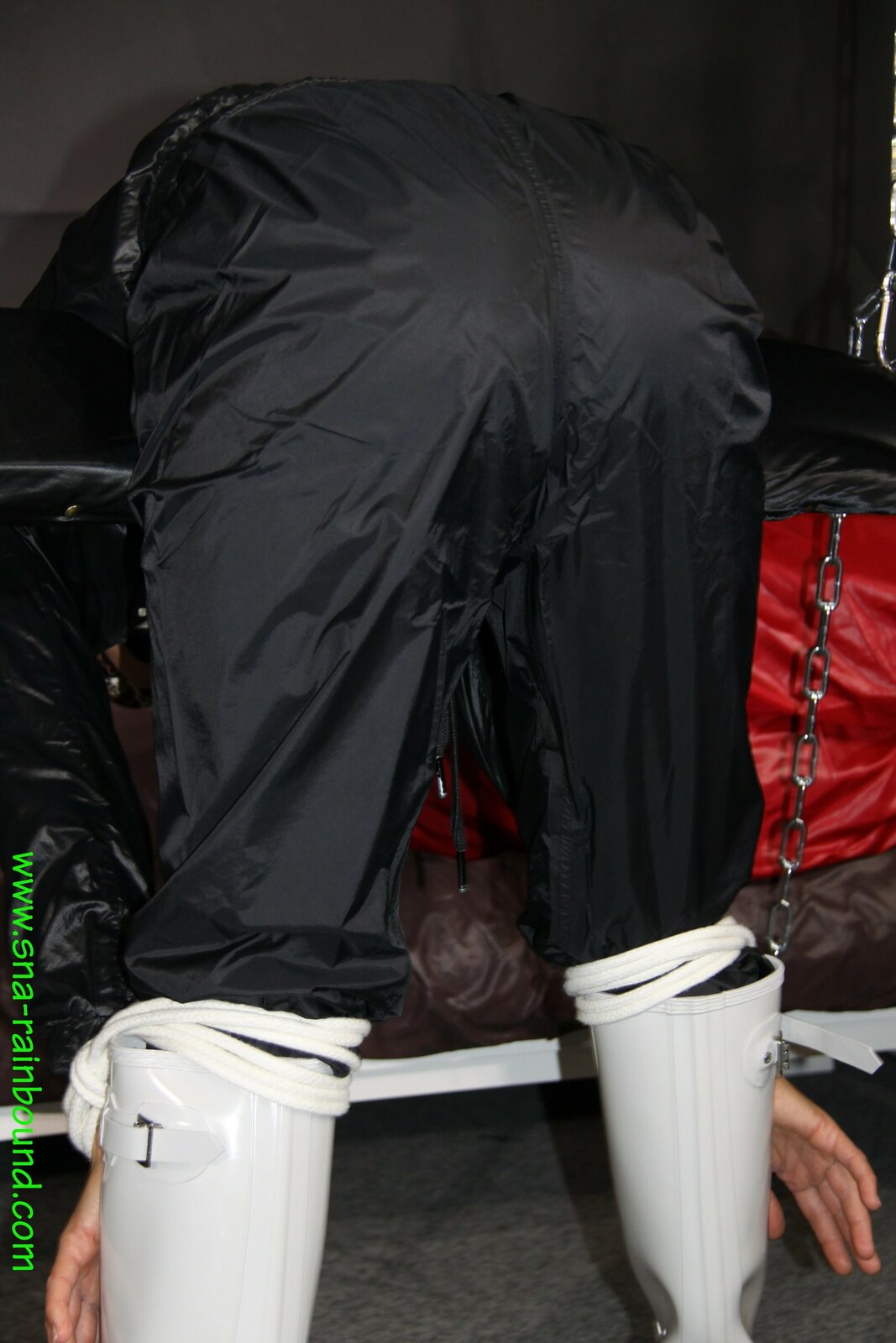 Watch Sandra bound gagged wearing her shiny nylon Rainwear