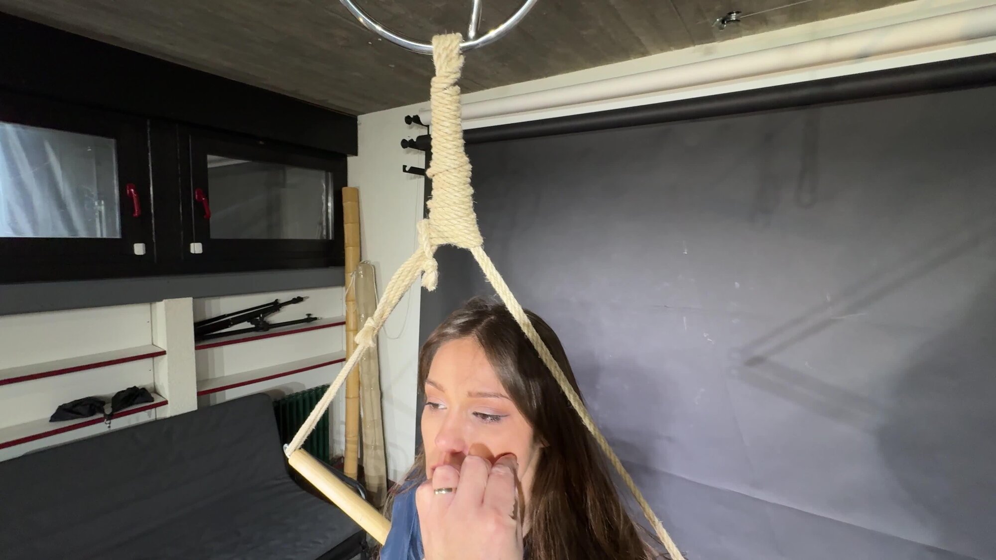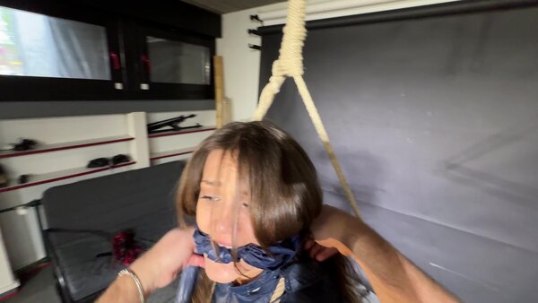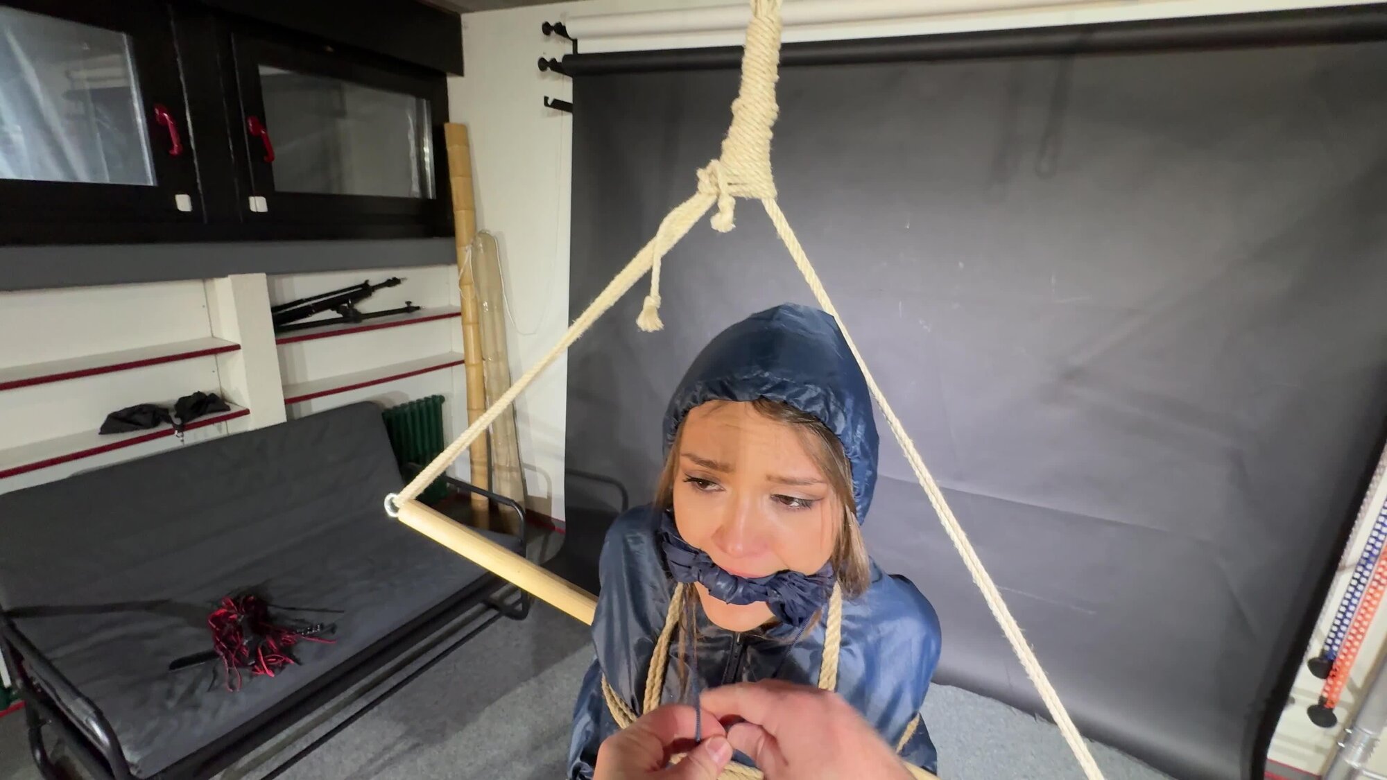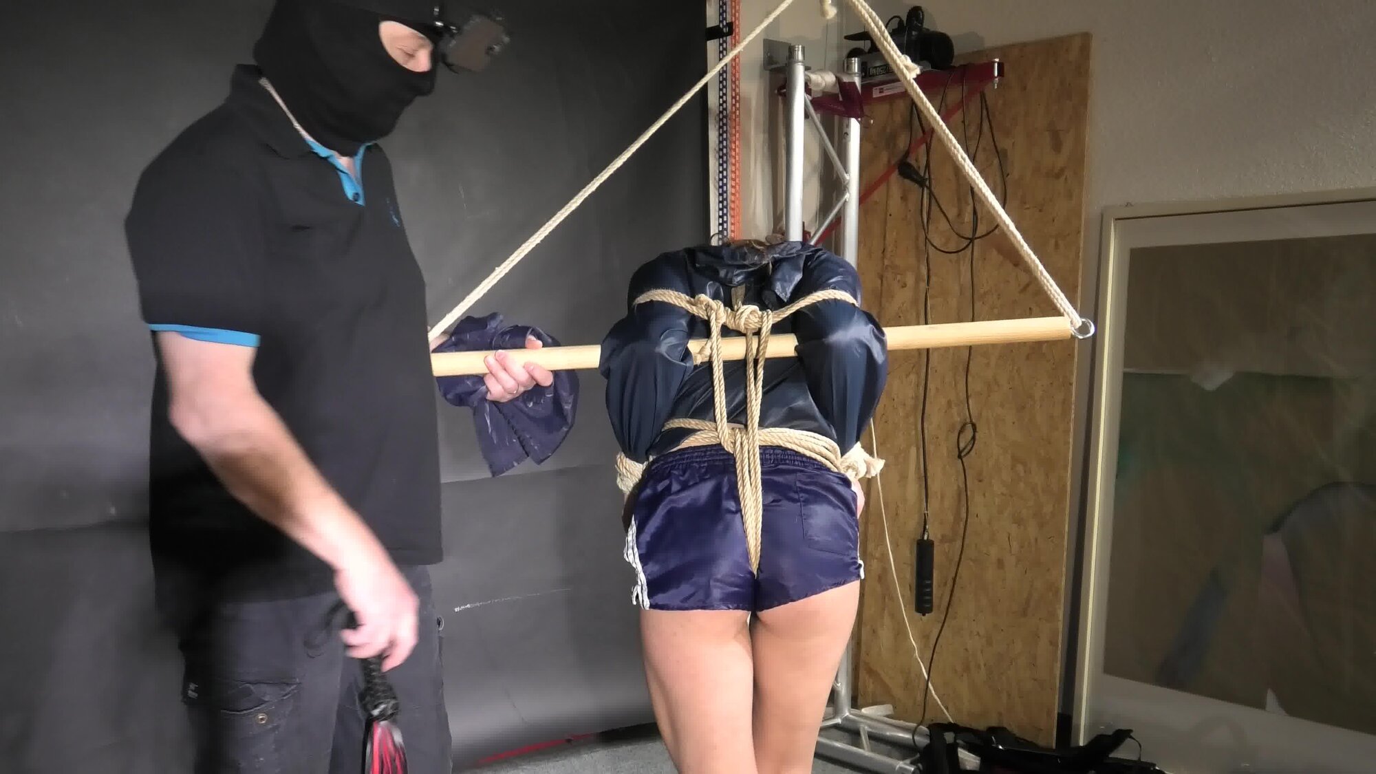 Marie bound, gagged and spanked in shiny nylon Shorts and a Windbreaker