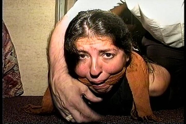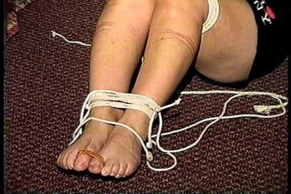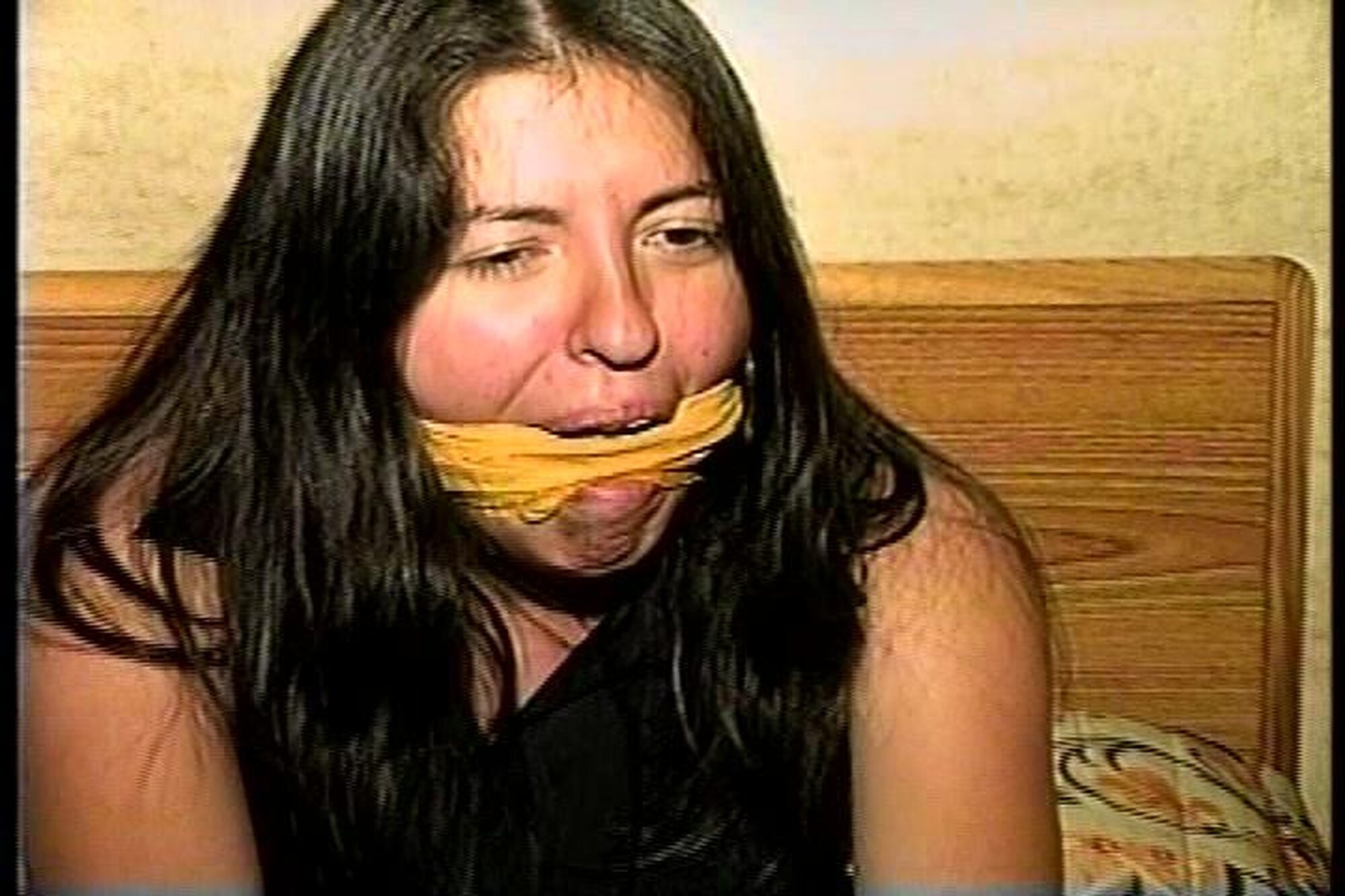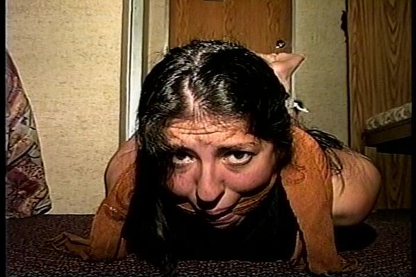 Cute Latina Tammara is laying face down on the floor with her mouth tightly cleave gagged with a thick brown winter scarf. J-napper comes up and handgags her from behind. She has been hog-tied with rope and is barefoot. her sweaty stinky toes have been tightly tied together with a thin piece of brown rawhide. After working herself free from the hog-tie she is now sitting on the floor with her mouth gagged with a wide black OTM scarf gag. After more struggling and gag talking she is finally able to work herself free from the ropes. She then waits for J-napper to return with the ransom money. After hitting him over the head she kicks him and grabs the money and runs out the door. We then see her tied up on the bed with a yellow cleave gag in her mouth. She is covered with many large one hundred dollar bills as she gag talks and is taunted by her captor. She then tells everyone that this was her first video and that she REALLY is a real life school teacher. Good on screen untying, cleave gagged, otm, gagged, hog-tied, handgagged, barefoot, toe-tied, gag talking, and extreme close-ups