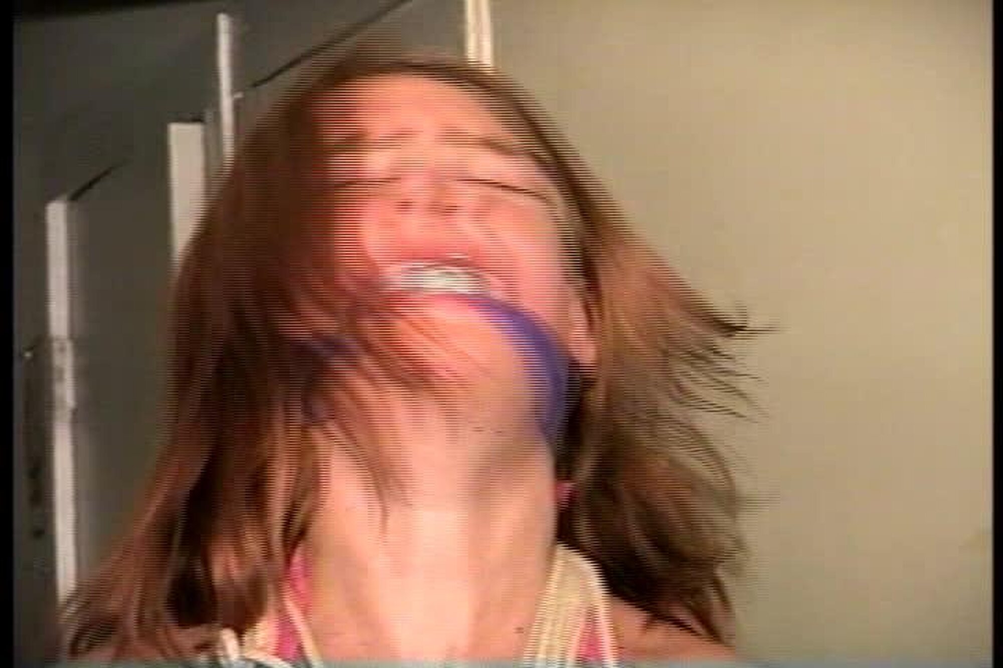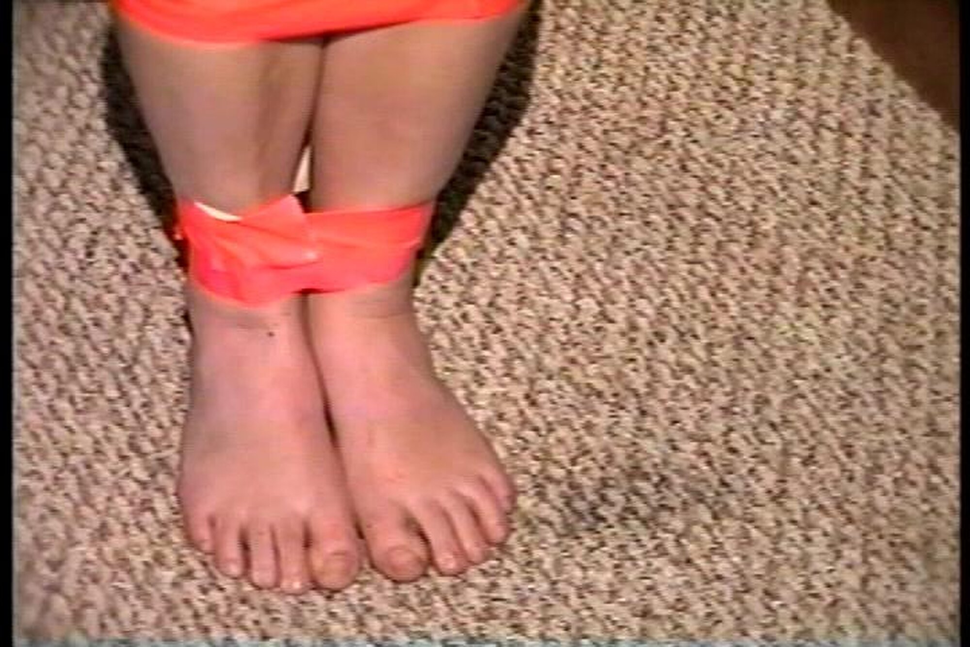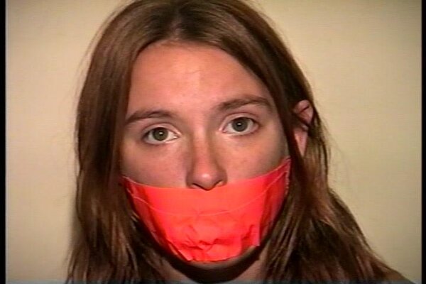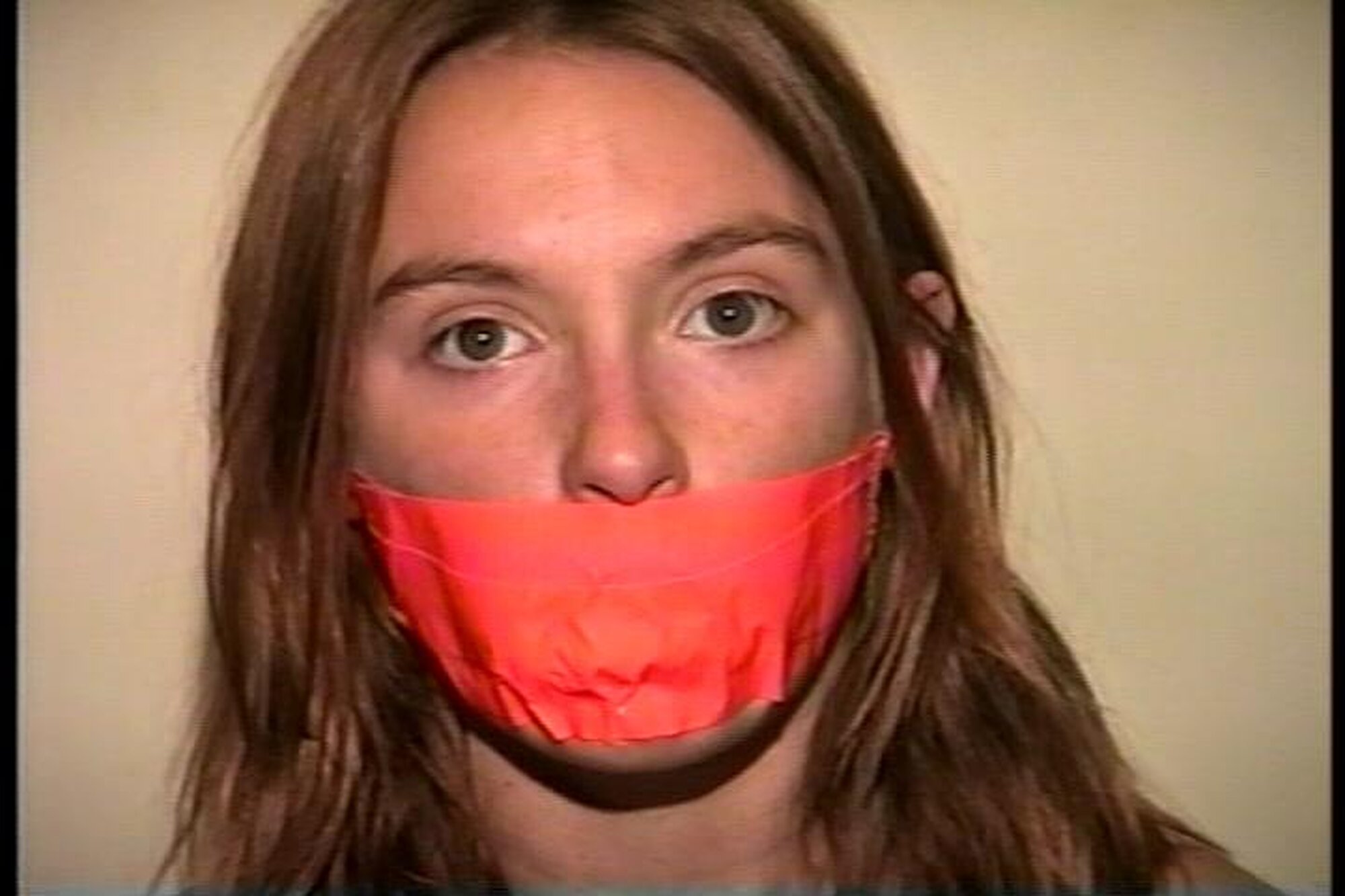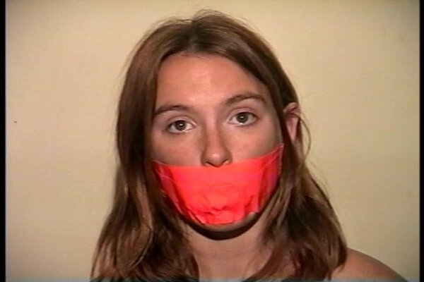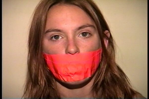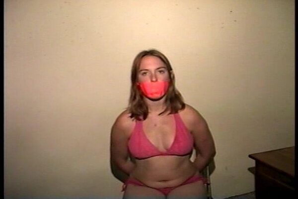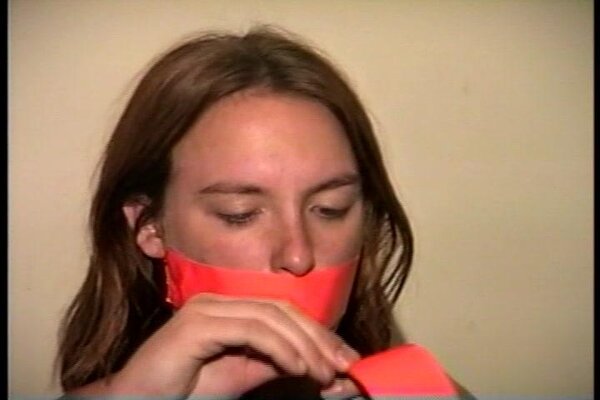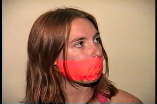 Cute and sexy Engle runs to the window while cleave gagged with a tight wrap around vet tape. After working off the gag and taking out the wet rag that was stuffed deep in her mouth she see J-napper coming back and doesn't want him to find her untied. She picks up a roll of orange duct tape and begins to tie herself up starting with her legs and then her sweaty bare feet. She then stuffs another rag into her mouth and gags herself with 3 pieces of the orange duct tape. Finding a pair of handcuffs she handcuffs her hands tight behind her back and sits in the chair waiting for J-napper to return. J-napper comes up and handgags her and then questions her about being tied up different from when he left her. Then with a close up shot of her handcuffed wrists J-napper unlocks the cuffs. Good on screen self tying, mouth stuffing, tape gagging, handcuff removeral, mmmmmmphfing, and extreme close-ups