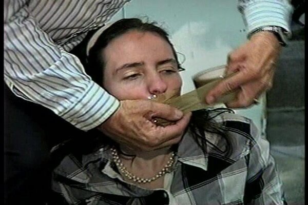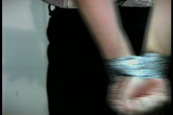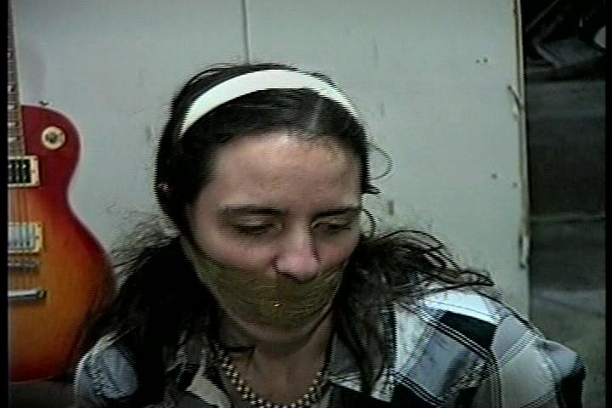 Cute and sexy spoiled brat Carm has been wrap tape gagged with silver duct tape. She is sitting on the bed with her hands tied behind her back and her legs and sweaty bare feet tightly tied together with rope. After some struggling and mmmmmmmmmmphfing we see a close of of her feet with her toes now tied tightly together with a piece of thin brown rawhide. J-napper comes back and gives her some good news and some bad news. After some taunting J-napper cuts the wrapped tape gag off of her mouth. He then pushes the wet blue thongs that were in her mouth in deeper with his finger and then gives her a good tight handgag. He then pulls the thongs out of her mouth and tells her that she really got them wet....... Good on screen handgag, taunting, wrap tape gagged, tight bondage, gag talking, mmmmmmmmmphfing and close-ups....