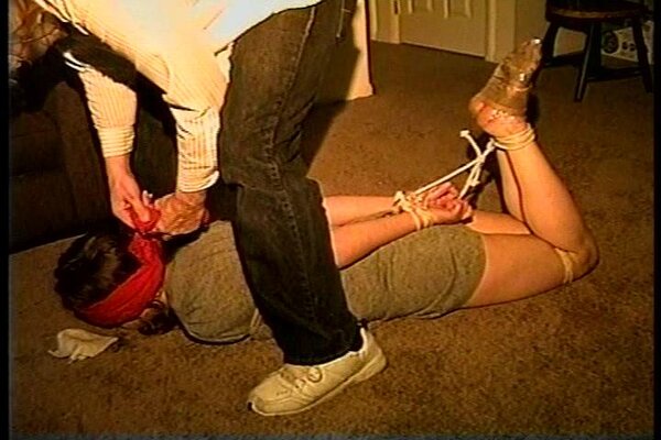 Cute and sexy Fauna is laying hog tied with rope on the floor. Her mouth has been ball-gagged and the wet rag that was stuffed in her mouth is now laying in front of her nose. She is drooling onto the carpet. Her stinky feet have been wrapped in plastic then wrapped with semi clear brown packaging tape in order to make her smelly feet sweat. J-npper comes over and as she struggles and mmmmmphfs he starts to taunt her as he gives her some spanking slaps on her ass. He then blindfolds her with a thick red terrycloth scarf. Good on screen spanking, blindfolding, taunting, humiliation, hog-tied, drooling, struggling, mmmmmmmphfing, gag talking and extreme close-ups