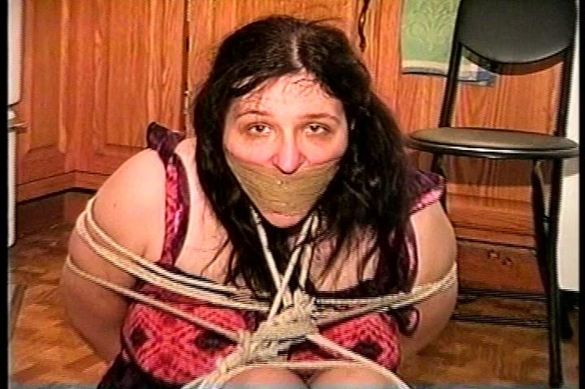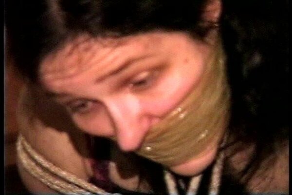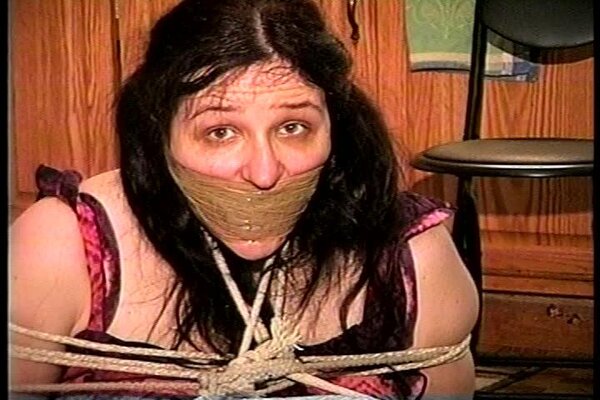 Cute and sexy Angel is still ball-tied with rope on the floor. Her mouth has been stuffed and then wrap gagged with semi clear brown packaging tape. She's wearing a black and red short print dress and nylon pantyhose stockings. Her sweaty stinky toes have been tied tightly together with a thin piece of brown rawhide. After some nice struggling, mmmmmmmmmmphfing and gag talking J-napper comes over and starts to tickle the soles of her smelly sweaty nylon covered feet. He then pushes her over on to her side and with another piece of rope hog-ties her feet to her hands that have been tightly tied behind her back. Good on screen foot tickling, hog-tying ,wrap tape gagged, gag talking, tight ball-tie bondage, , mmmmmmmmmphfing and extreme close-ups.