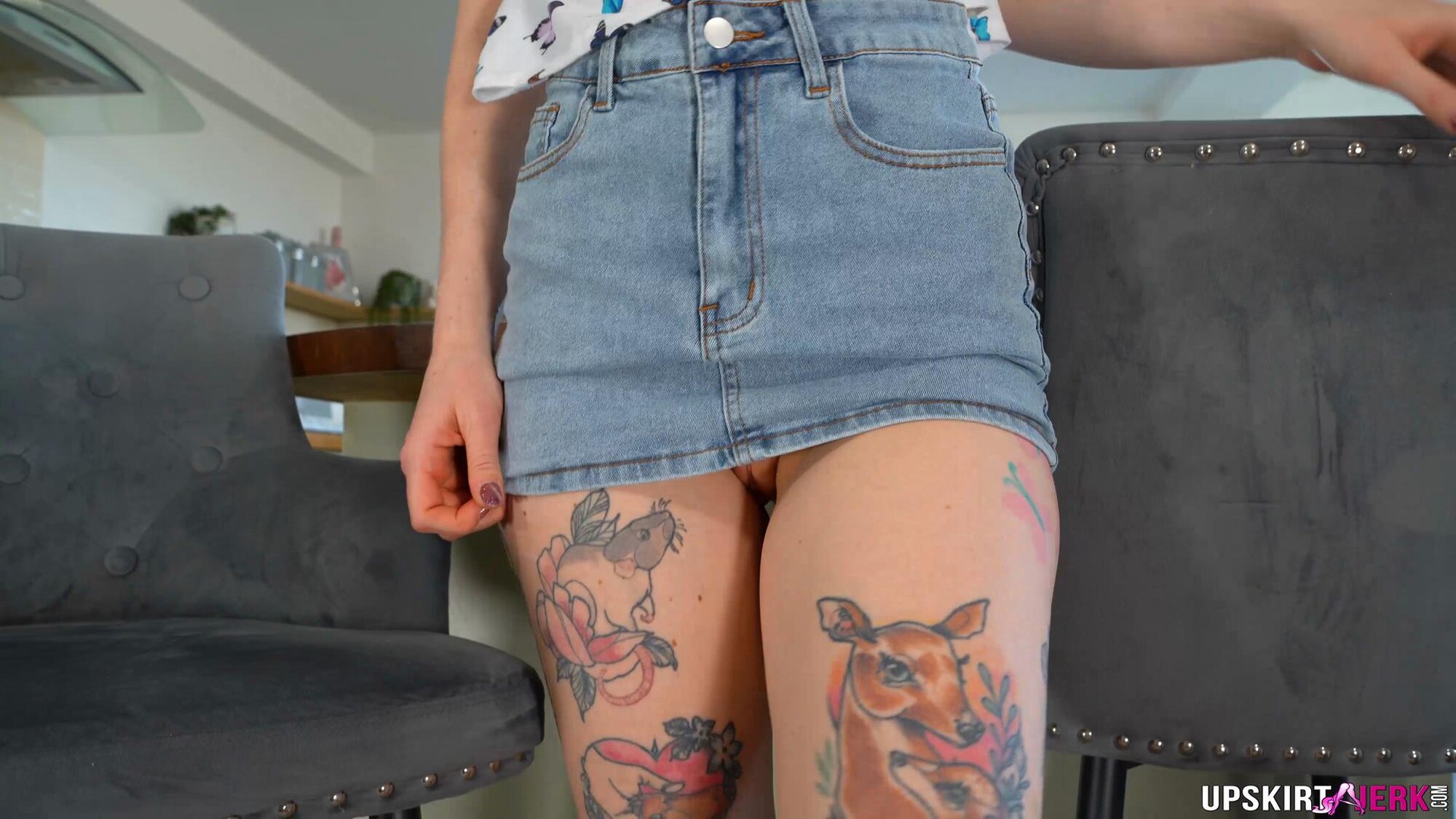 Katie Cooper is turning a routine meeting into an explicit "Client Seduction," and she's chosen the kitchen as the perfect place to close the deal. Dressed to impress but focused on the distraction, she's giving you a deliberate upskirt view that highlights her vibrant purple panties!
