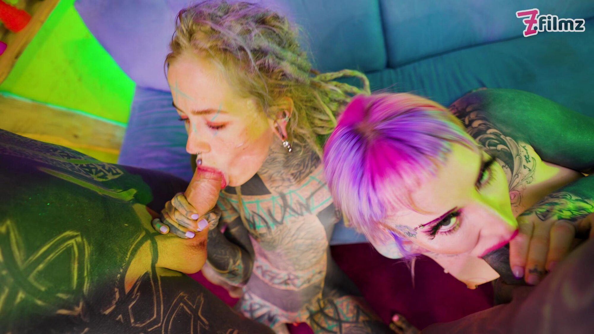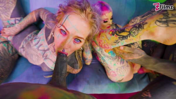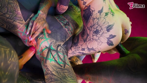 Two pairs of tattooed lovers indulge in a symphony of pleasure, their inked bodies entwined in a passionate embrace. The women, Anuskatzz and Kellie Phanter adorned with intricate tattoos and piercings, are the epitome of edgy beauty, their moans and whispers filling the air as they tease and please their partners. Kellie takes control, her hands exploring every inch of her man's tattooed torso. Her partner, Nikolaz Zpageti equally inked, responds with fervent kisses and eager touches, his hands roaming her curvaceous body, gripping her ass, and pulling her close. The other couple mirrors their intensity, the woman riding her man with wild abandon, her tattoos glistening with sweat as she moves. Toys are incorporated, adding to the visual and physical stimulation. The room is charged with raw, unfiltered lust, the air thick with their heavy breathing and erotic whispers. These inked lovers know exactly how to please each other, their bodies moving in perfect, passionate harmony. The scene is a feast for the senses, a raw and unfiltered display of desire between these tattooed couples.