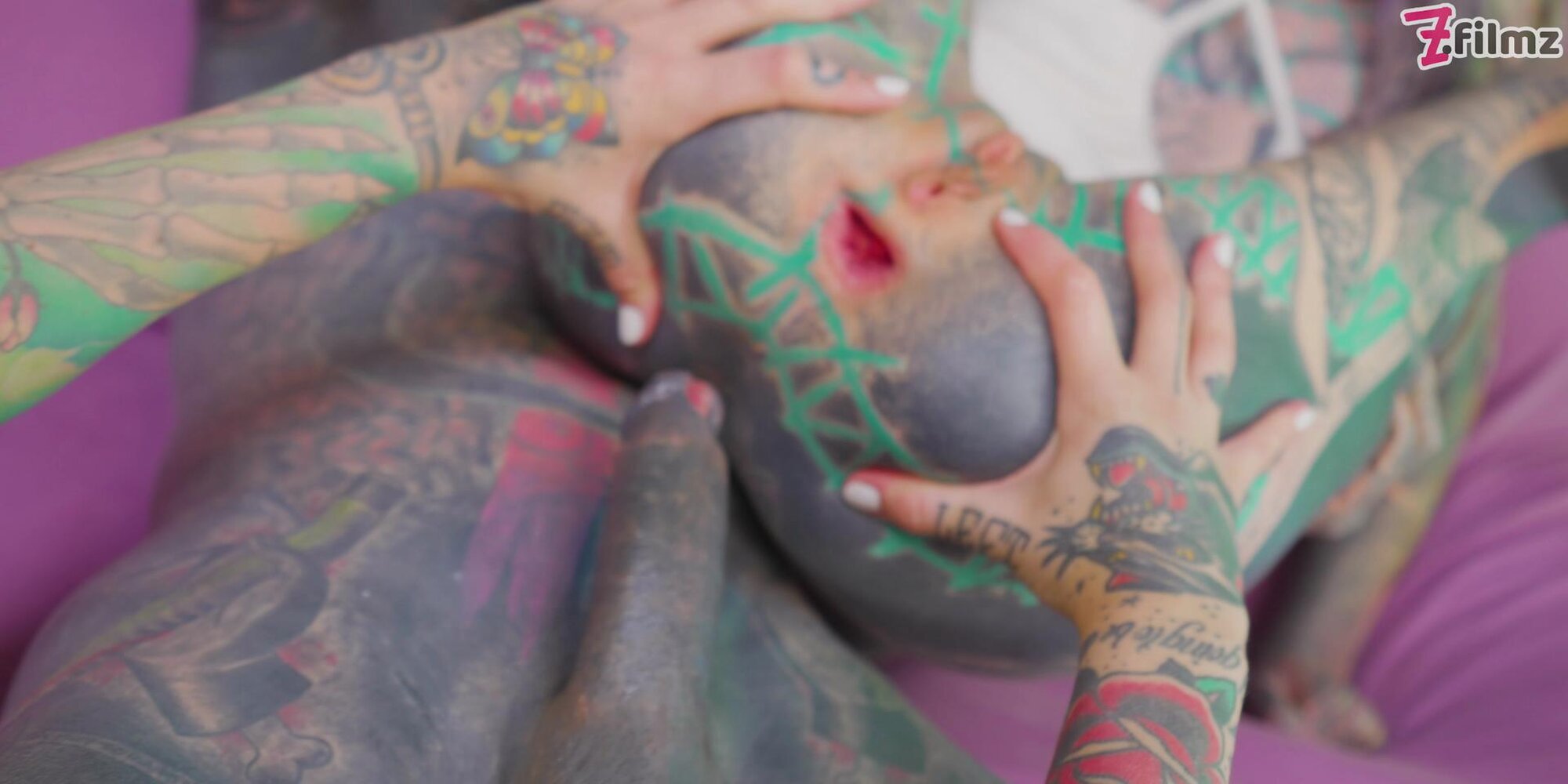Tattooed goddess Anuskatzz lays sprawled on a bed, her inked body a canvas of art and desire. She teases, spreading her legs wide, inviting exploration. "Close between the legs. Such a shame," she purrs, her voice a sultry invitation. She guides her partner, Lisa Rocketcock urging them to finger her, starting with two, then three, and finally four fingers deep inside her wet pussy. "Oh, yeah. Oh, yeah," she moans, her body arching with pleasure. The room is charged with lust as she demands more, her eyes locked on her partner's, urging them to satisfy her every craving. "Can you put your fingers in my bum too?" she asks, her voice a mix of command and pleading. The atmosphere is electric, a raw and unfiltered display of pure, unadulterated lust.