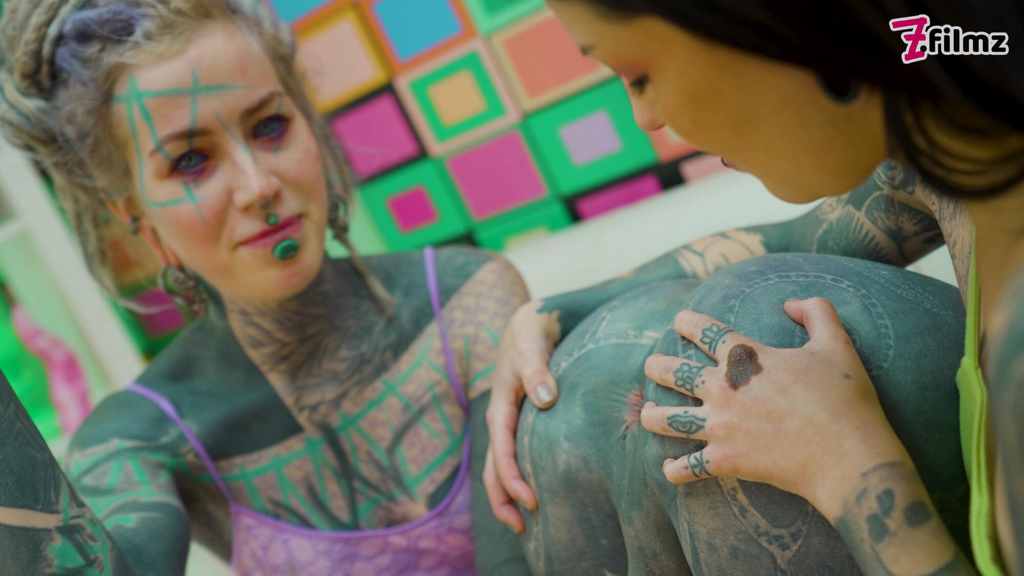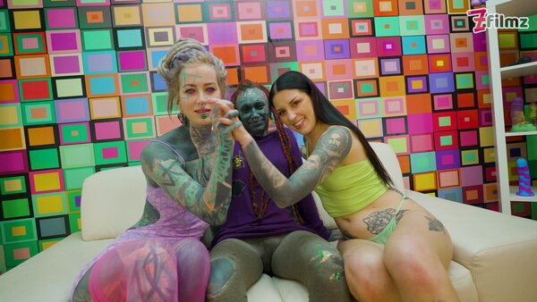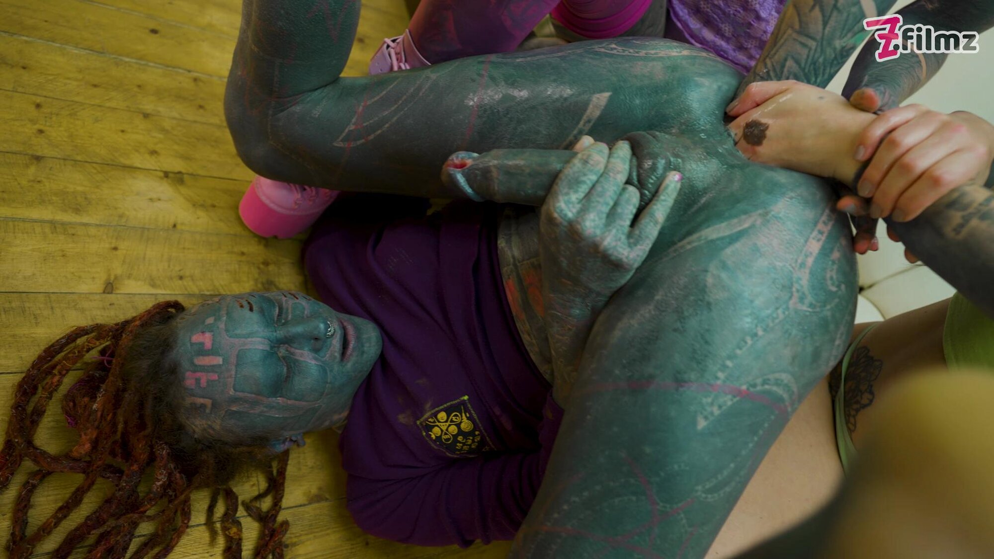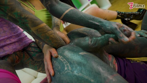 In a vibrant art studio, Lily Lu dominates the scene, her body a canvas of vivid ink. The mood is electric, a mix of creativity and raw desire. Morea Black & Anuskatzz also tattooed and painted, join them, creating a threesome that's as visually stunning as it is erotic. The goddesses takes control, their dominance evident as they guide theLily Lu' hands, his fingers stretching and exploring her most intimate places. The room is filled with the sounds of pleasure and the scent of paint, creating an inebriating atmosphere. As the fisting begins, the camera captures every detail, the intensity of the act matched only by the passion in their eyes. This is art, this is desire, and it's a spectacle you won't want to miss.